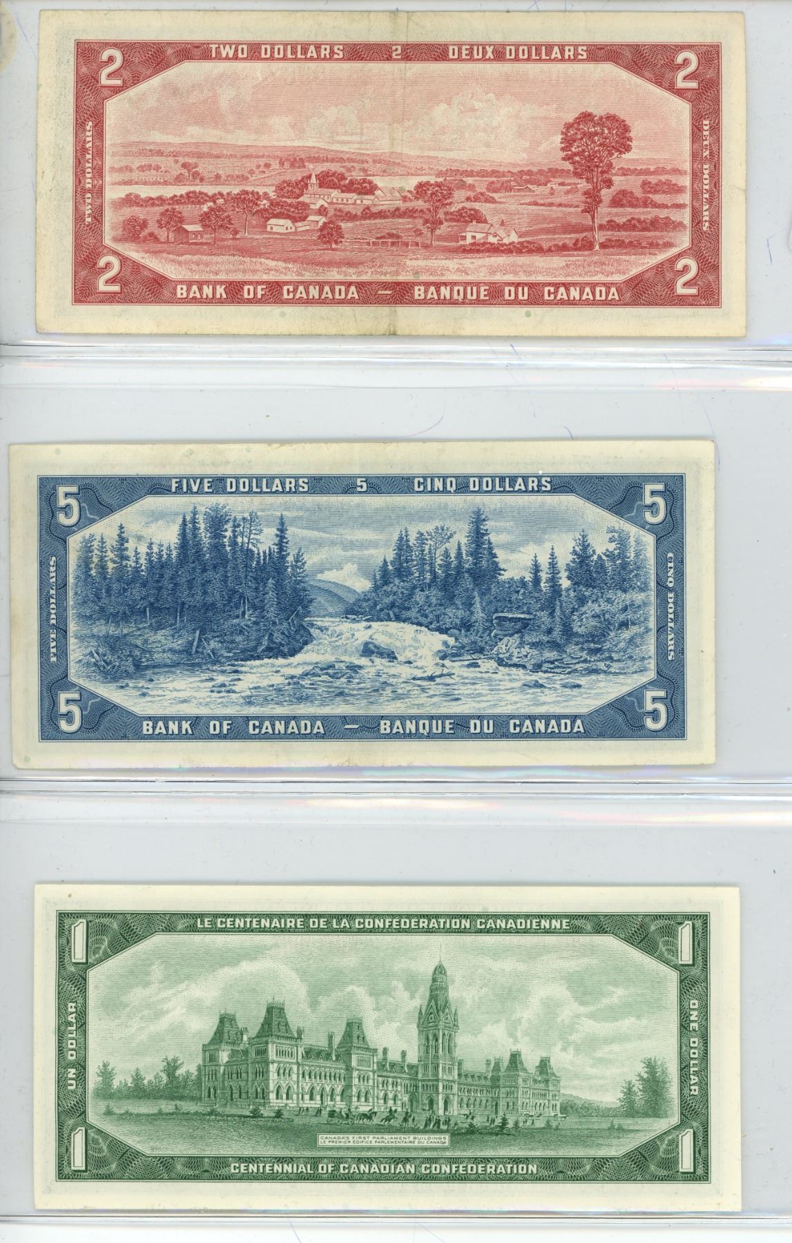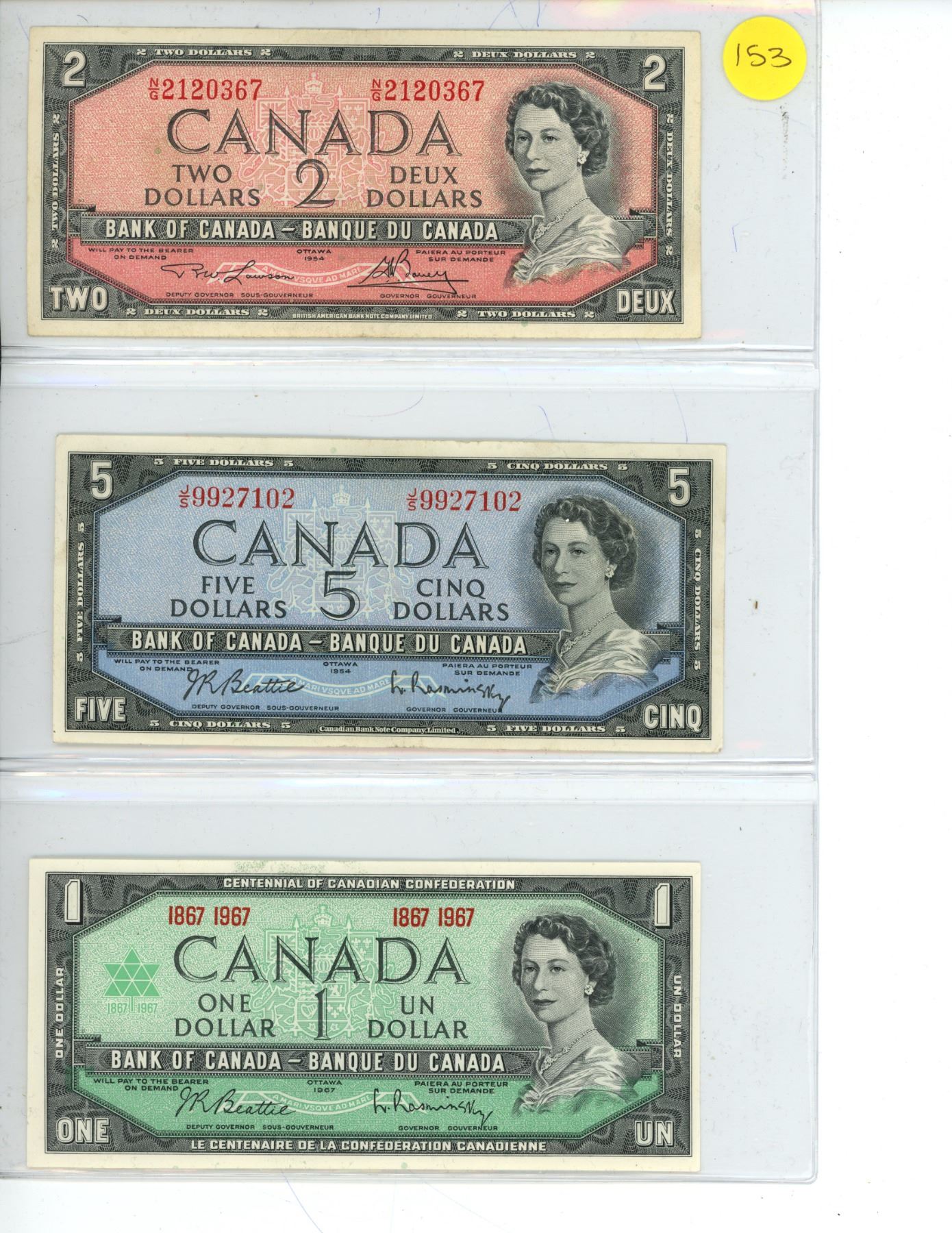 (3) Canadian Bank Notes - 1954 Two-Dollar Bill, 1954 Five-Dollar Bill, 1967 One-Dollar Bill