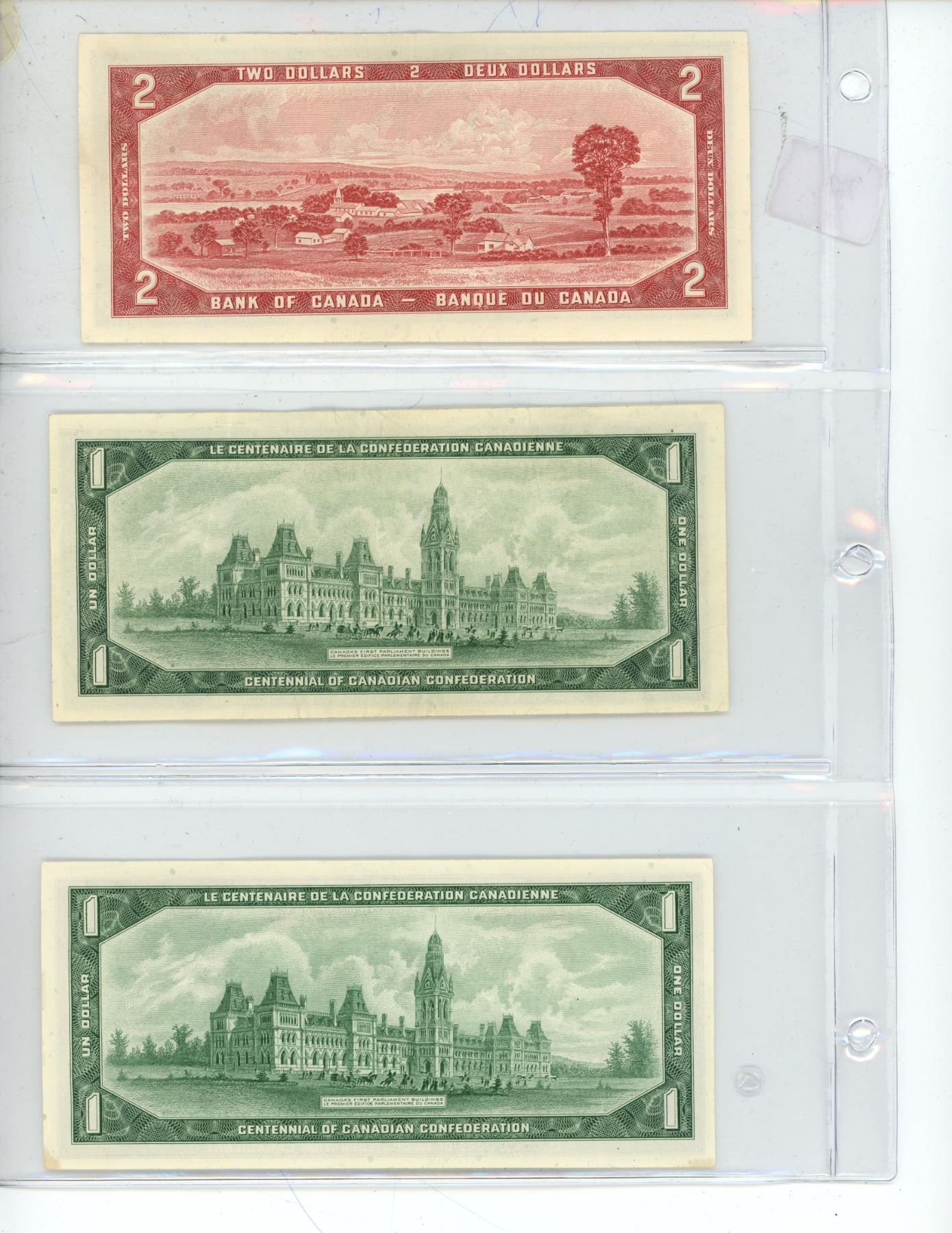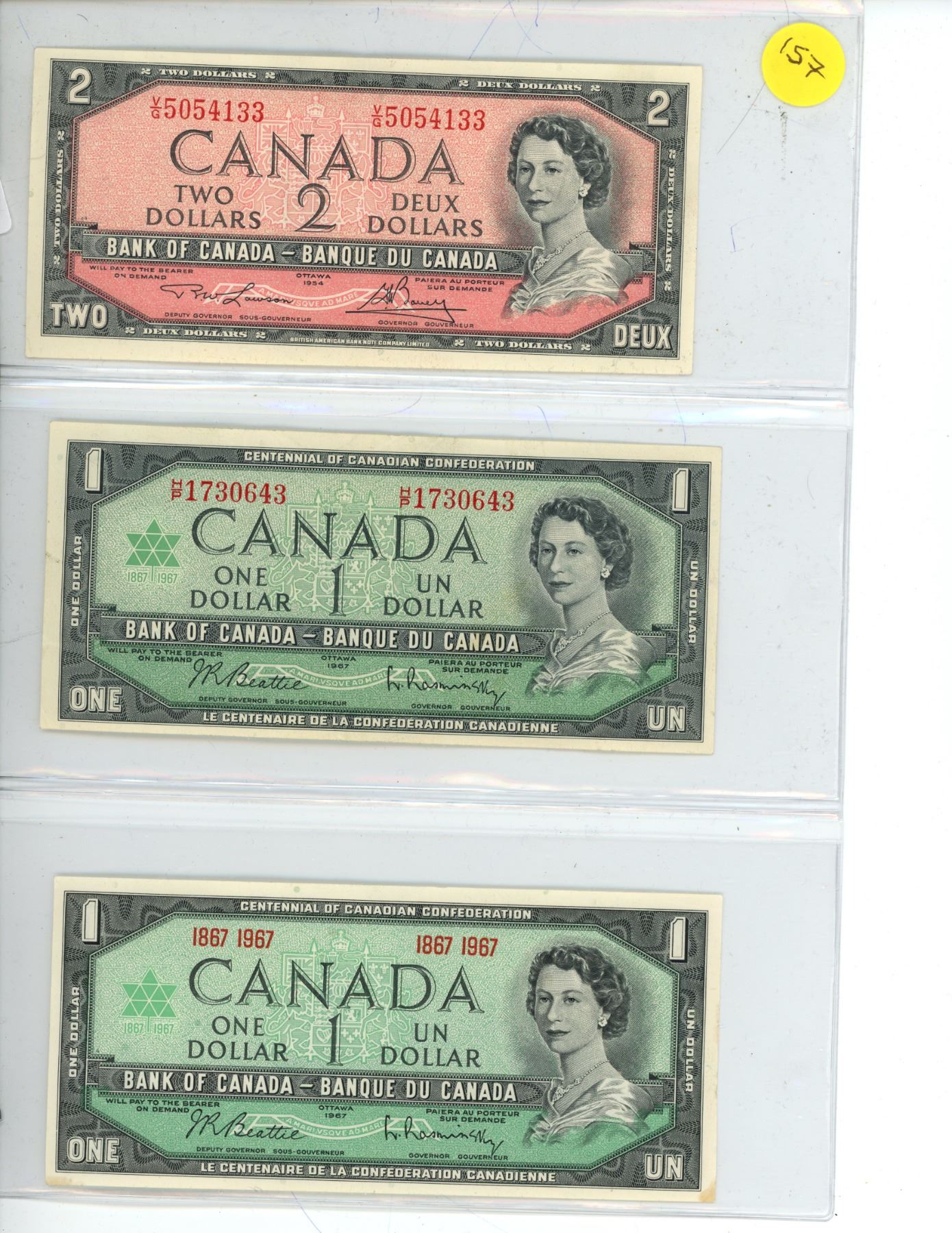 (3) Canadian Bank Notes. Includes 1954 Two-Dollar Bill, (2) 1967 One-Dollar Bills