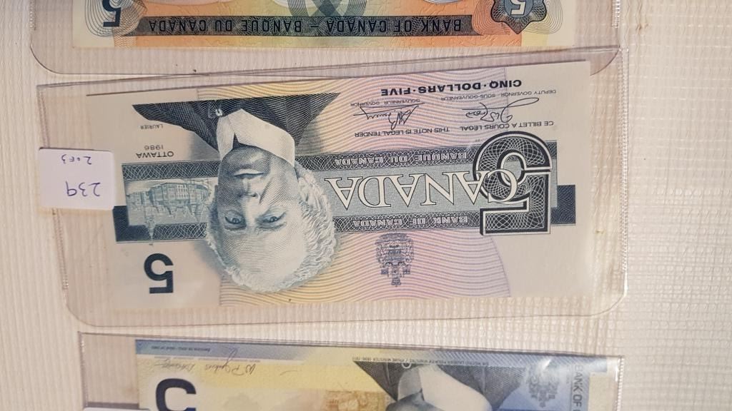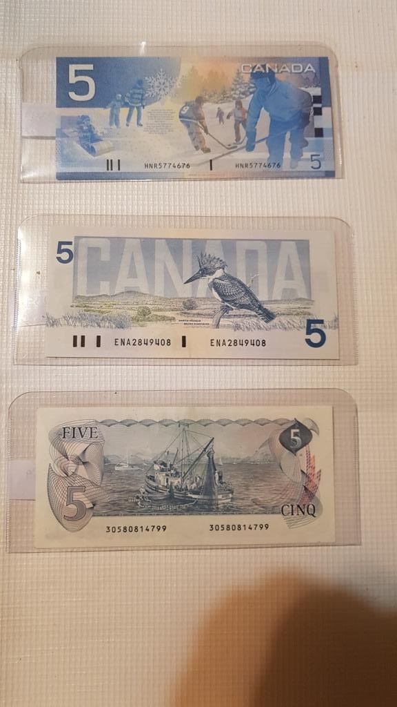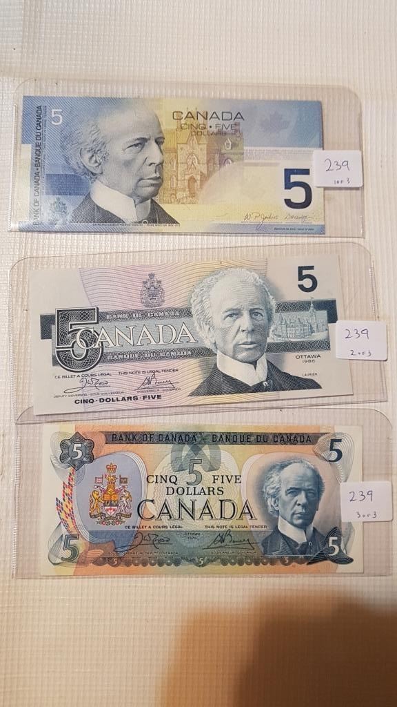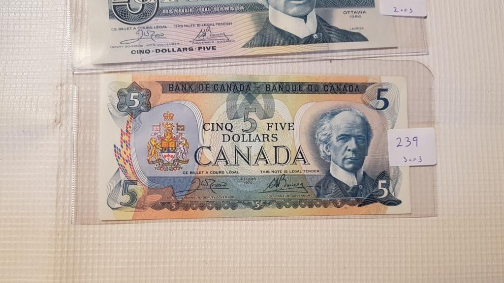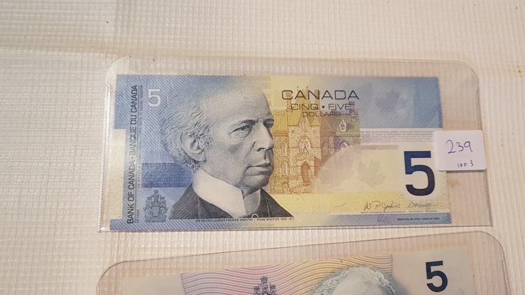 3 DIFFERENT $5 BILLS, 2 UNC, 1986, 2002 & UF 1979
