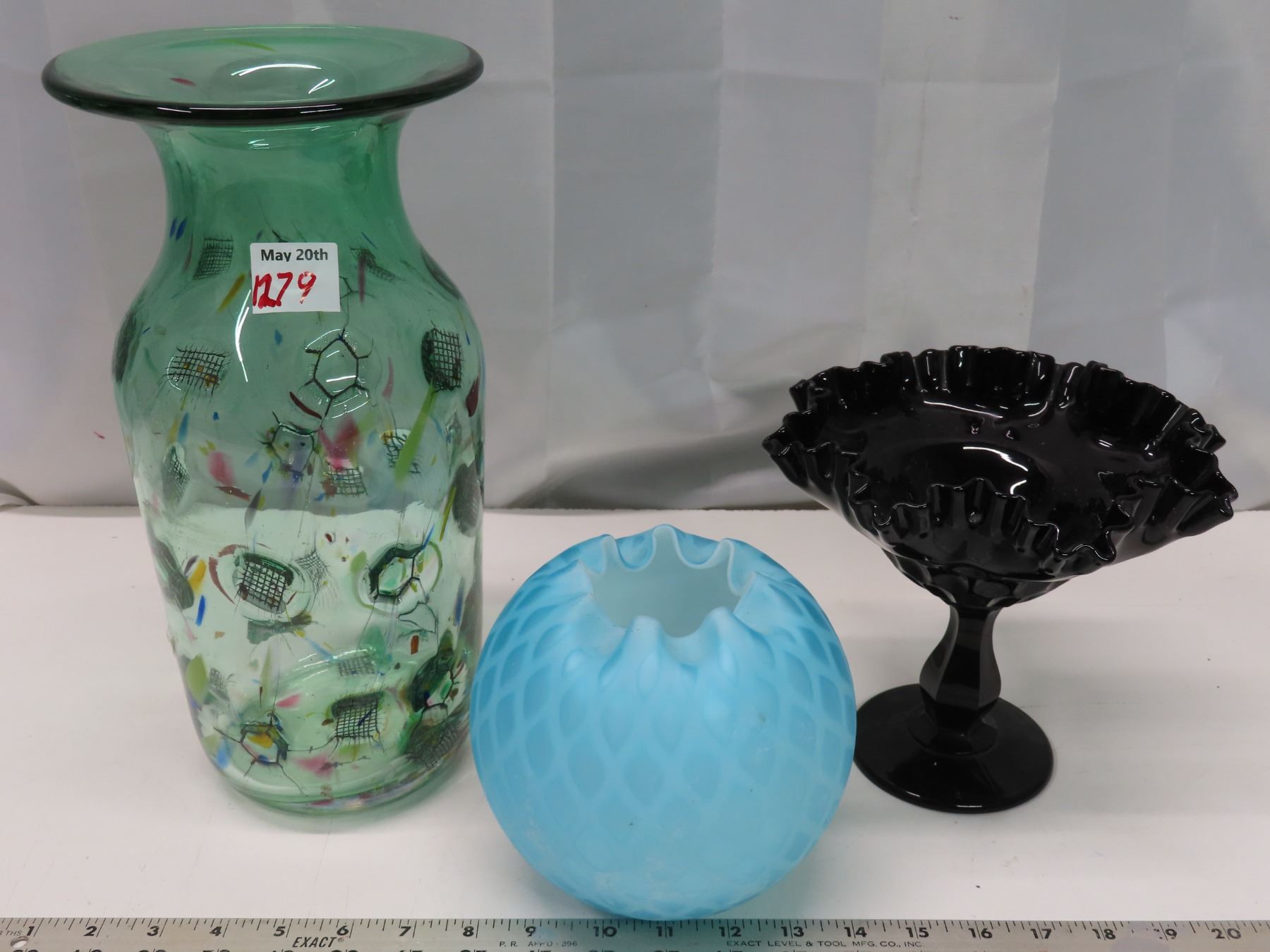 3 Decorative items: Unique Hand made Crystal vase – signed A Jablonski, blue milk glass bowl, candy dish