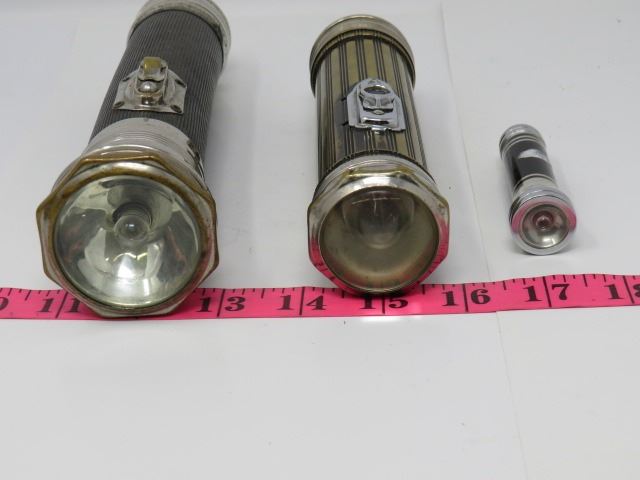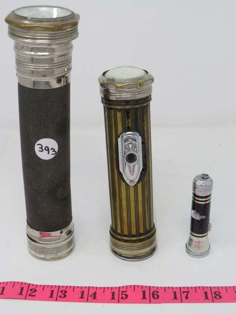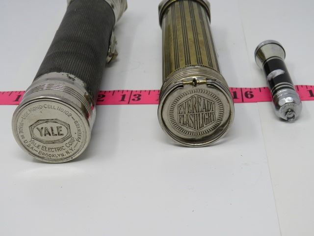 3 FLASHLIGHTS RARE BULLSEYE EVERREADY, YALE BEVELLED GLASS & ANTIQUE MINIATURE
