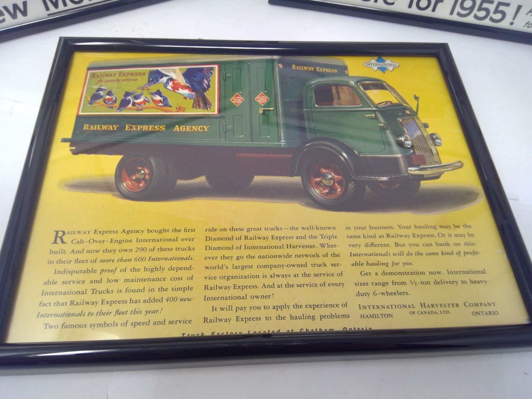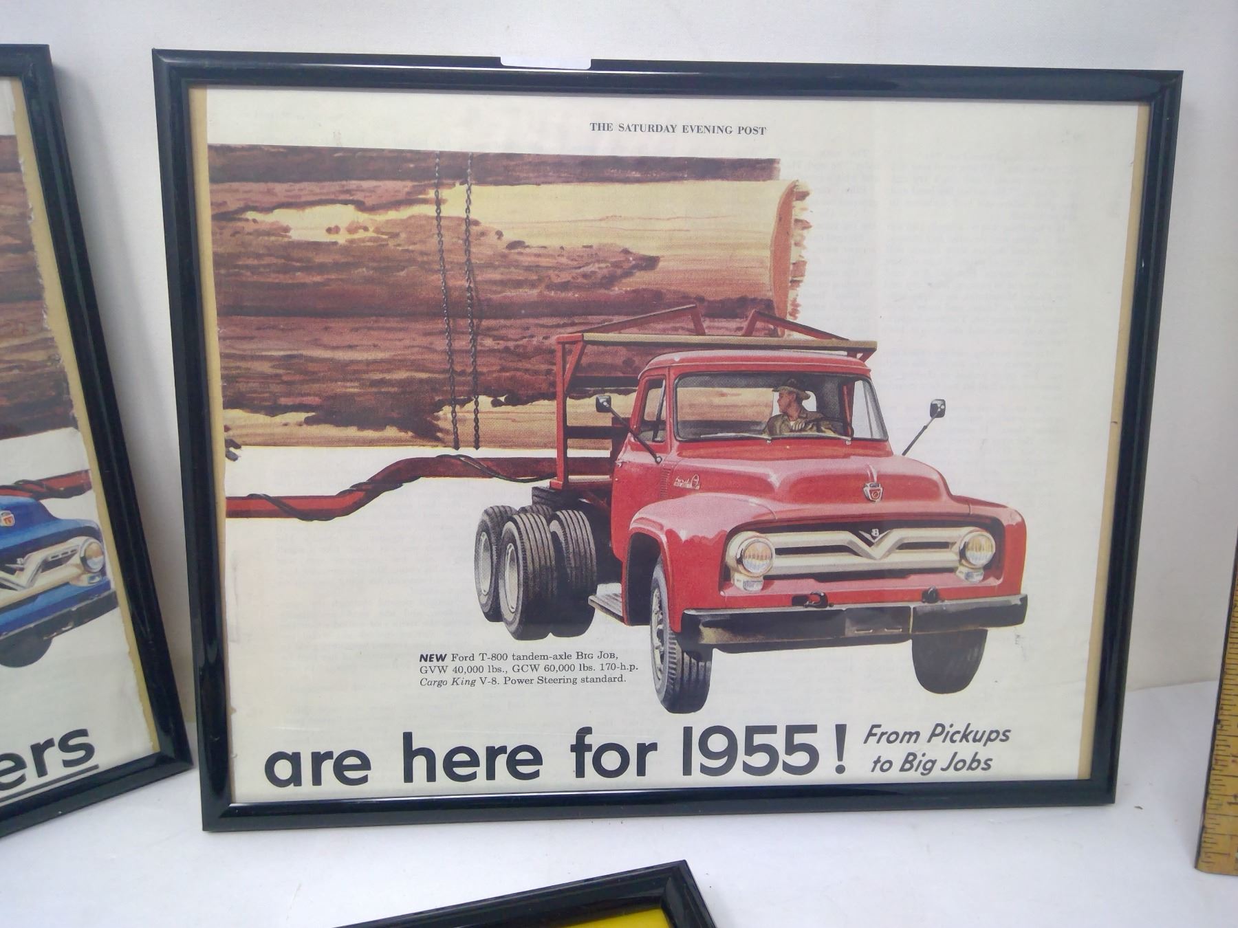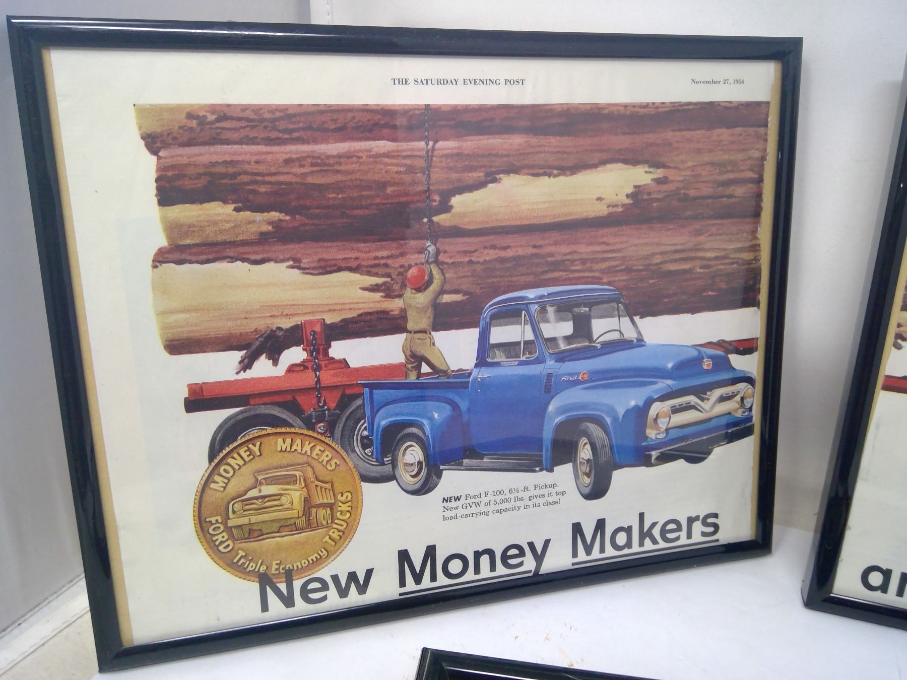 3- FRAMED TRUCK ADVERTISEMENTS (FORD T-800 + RAILWAY EXPRESS + NEW MONEY MAKERS)