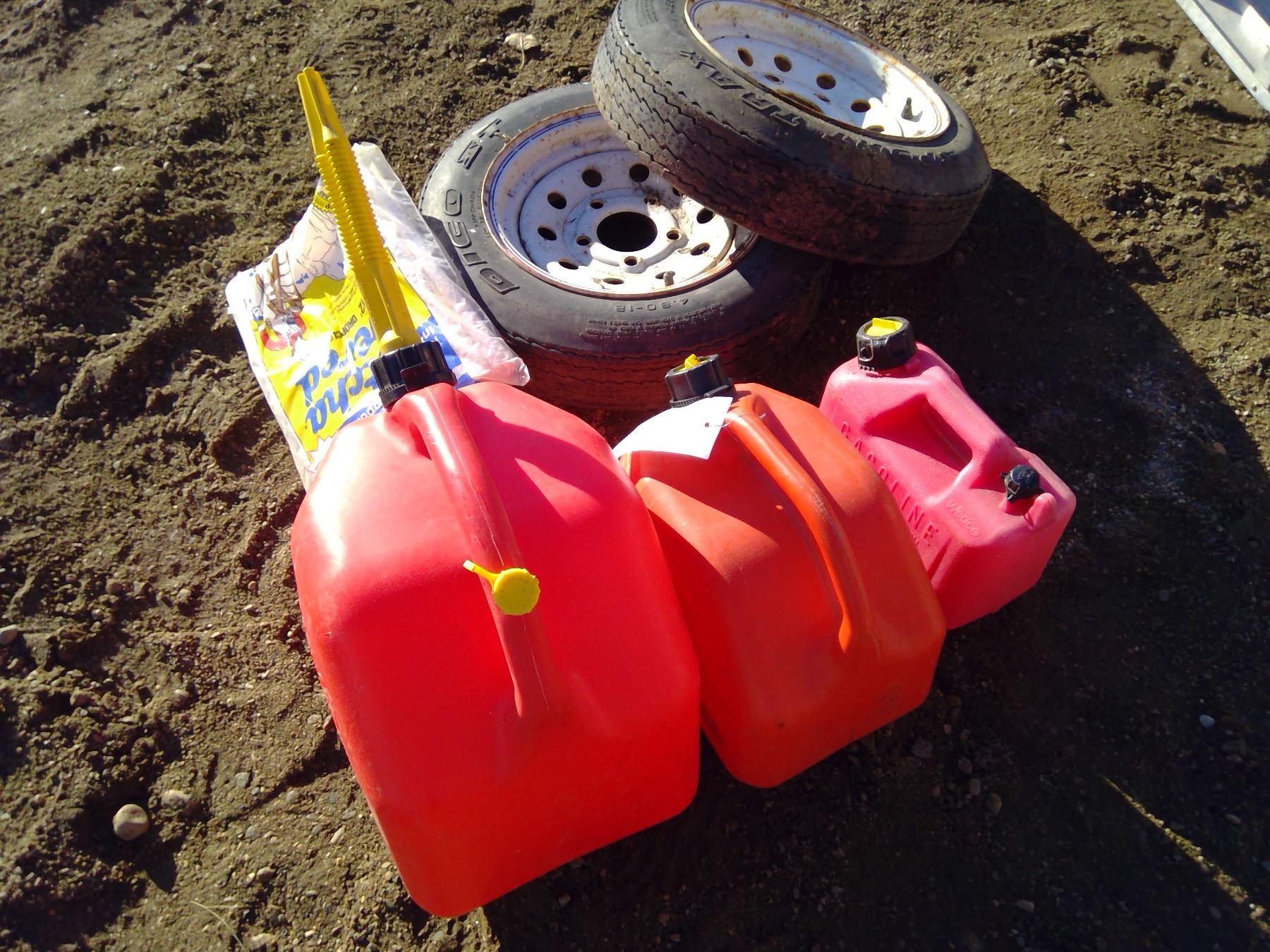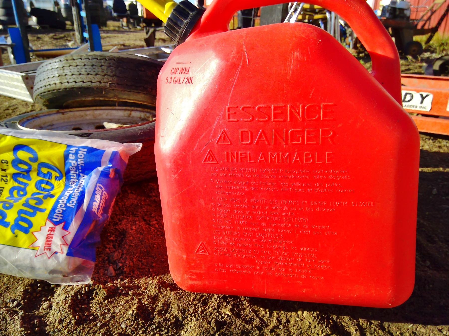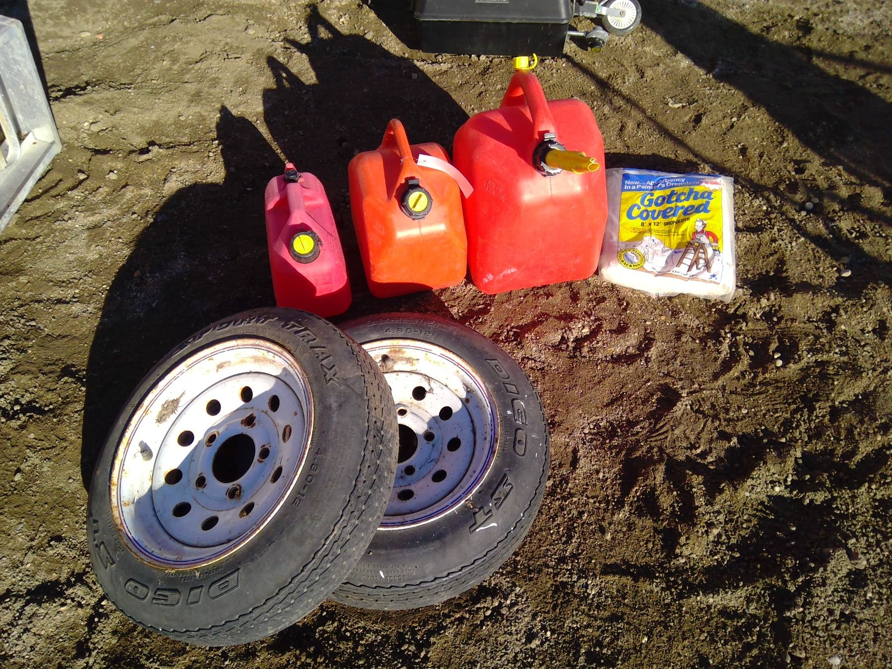 3 Gas cans, 2 tires, & painters dropcloth
