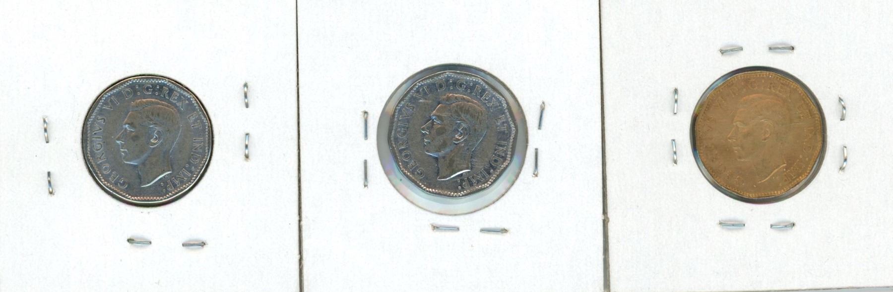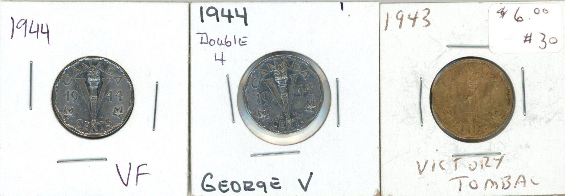 (3) George VI Five Cent Coins 1943 + 1944 (VF) (Victory Tombac) (Double 4)