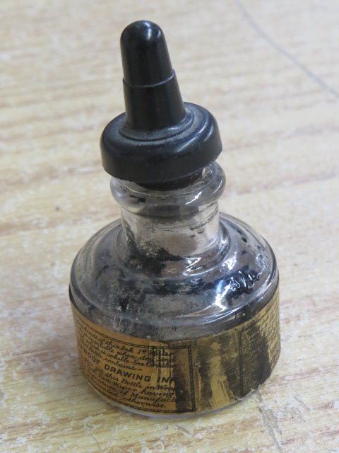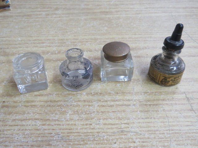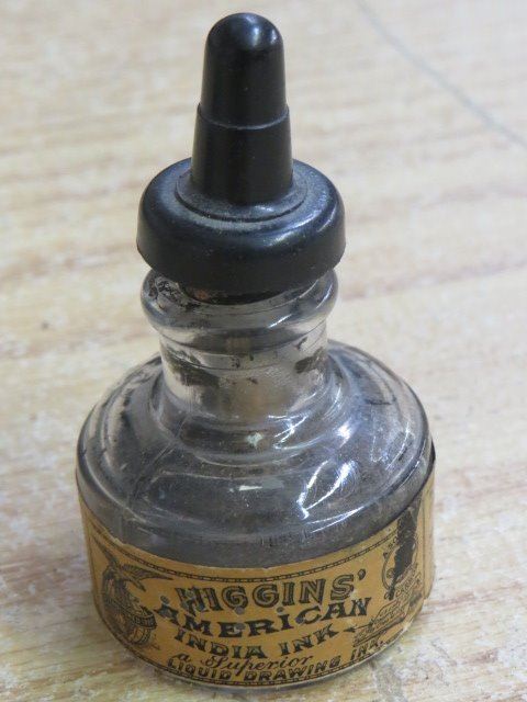 3 INK WELLS 2 W/LIDS, 1 INK BOTTLE, HIGGENS AMERICAN INDIAN INK