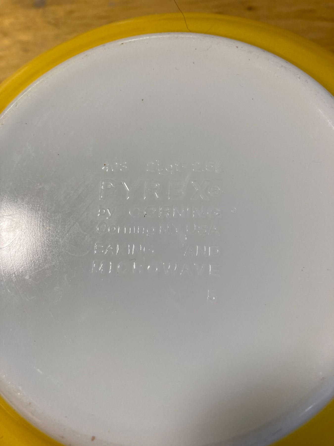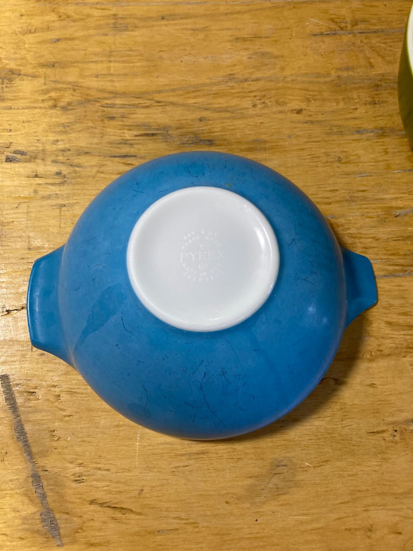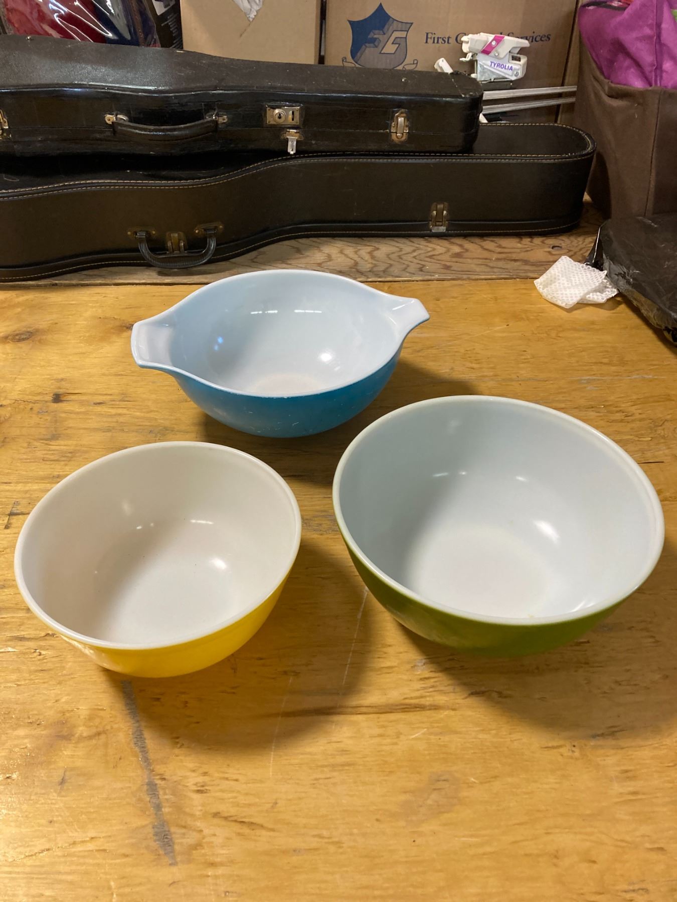 3 LARGE PYREX BOWLS YELLOW GREEN AND BLUE
