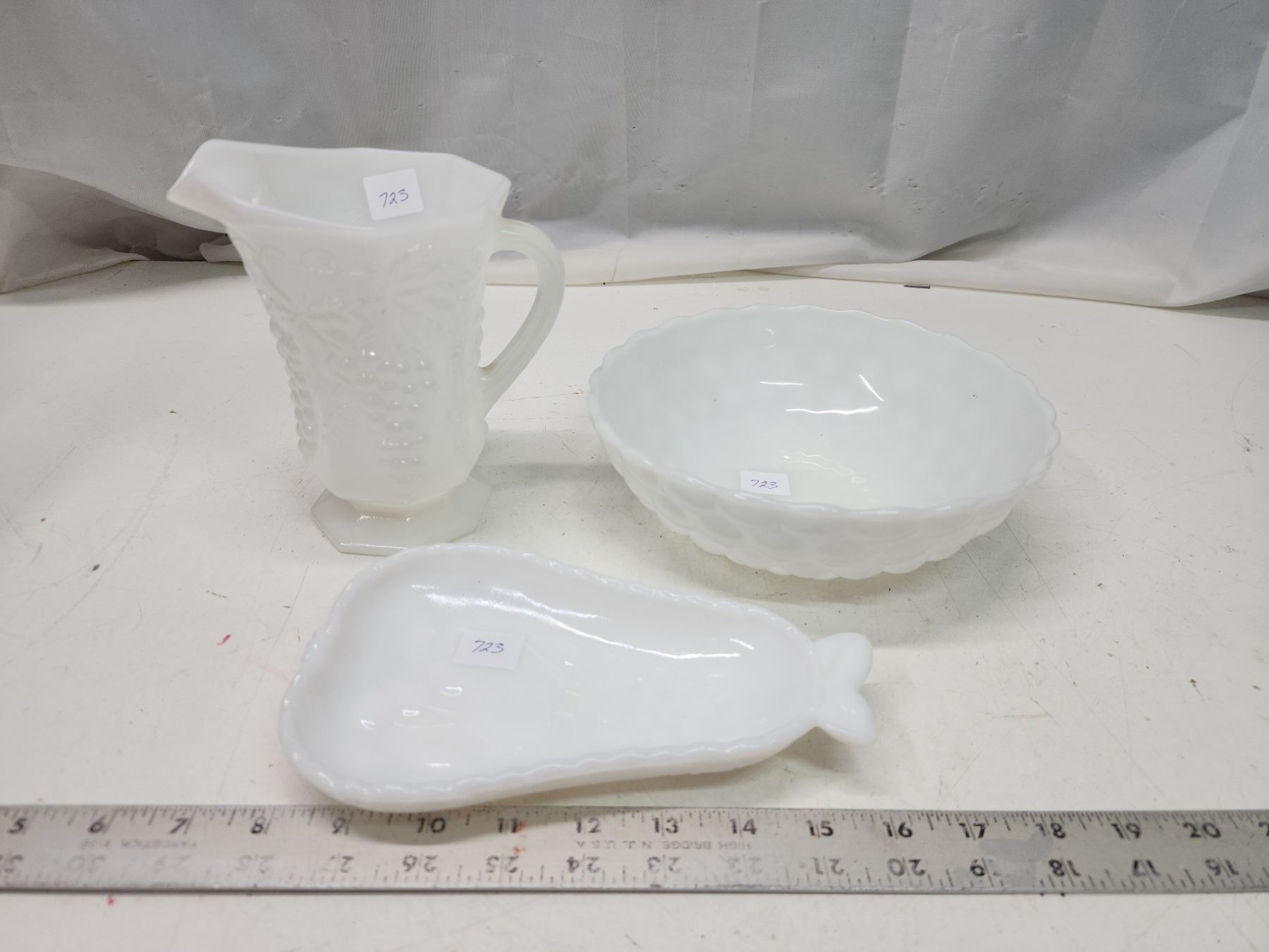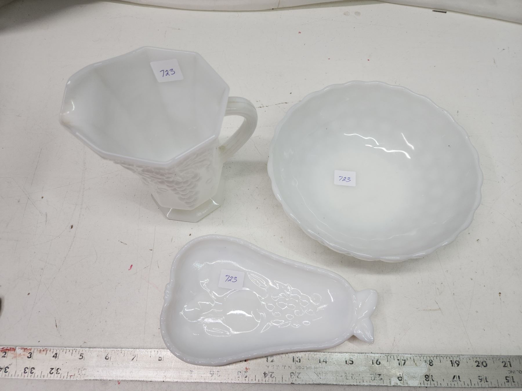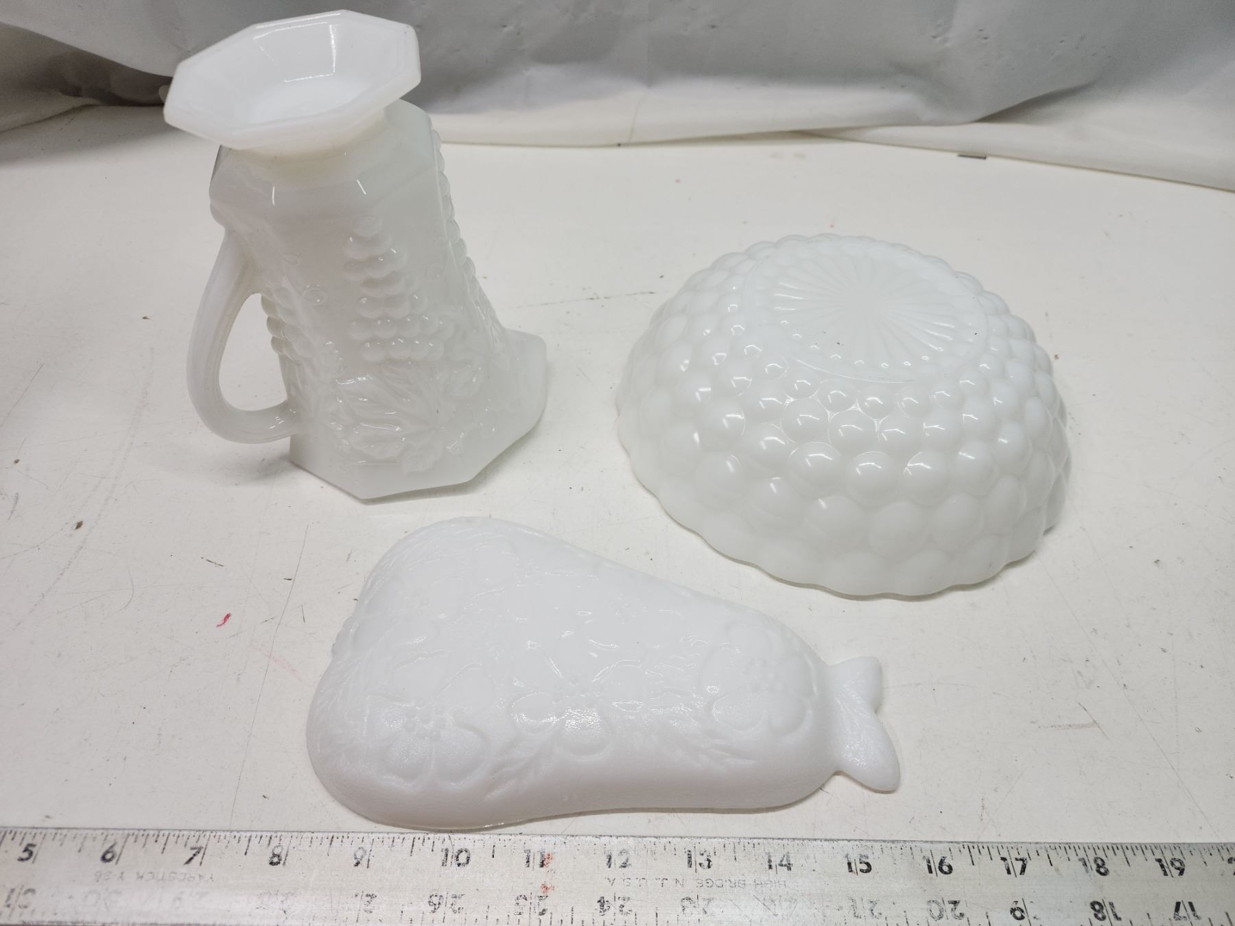 3 Milk glass dishes - pear platter, bowl and pitcher