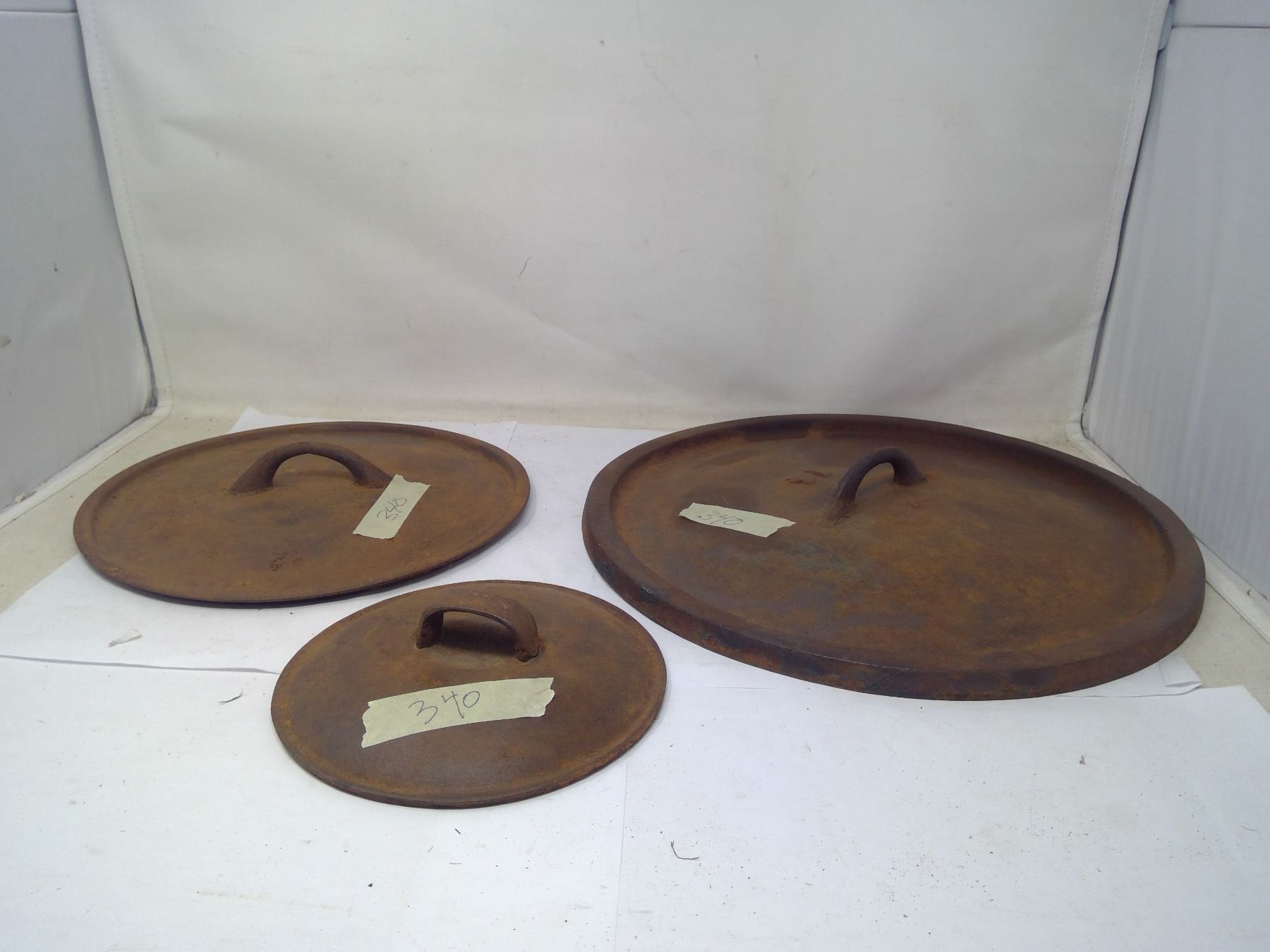3 OLD CAST IRON LIDS - 14", 11", 7"