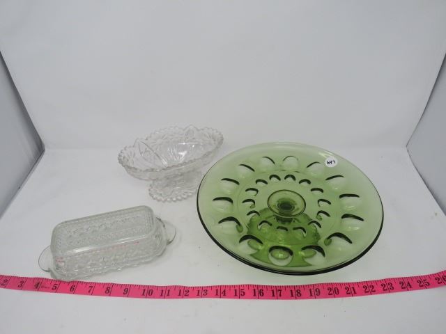 3 PCS GREEN PLATE ON STAND, FOOTED CANDY DISH, BUTTER DISH