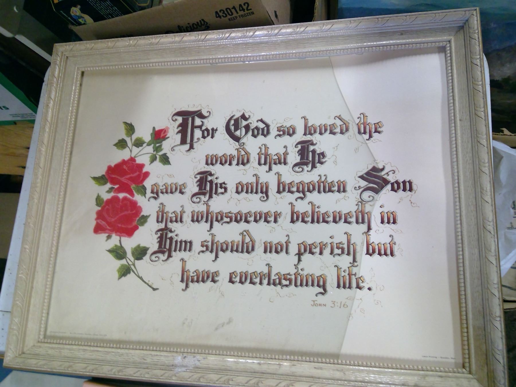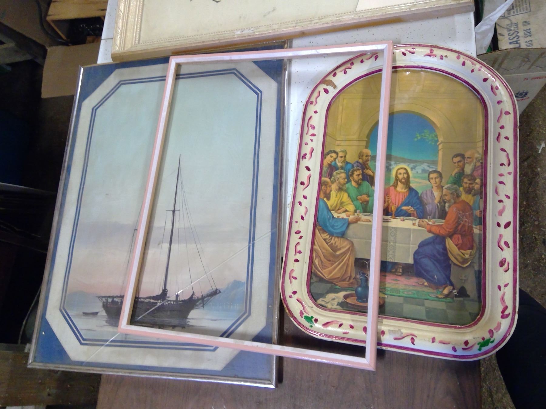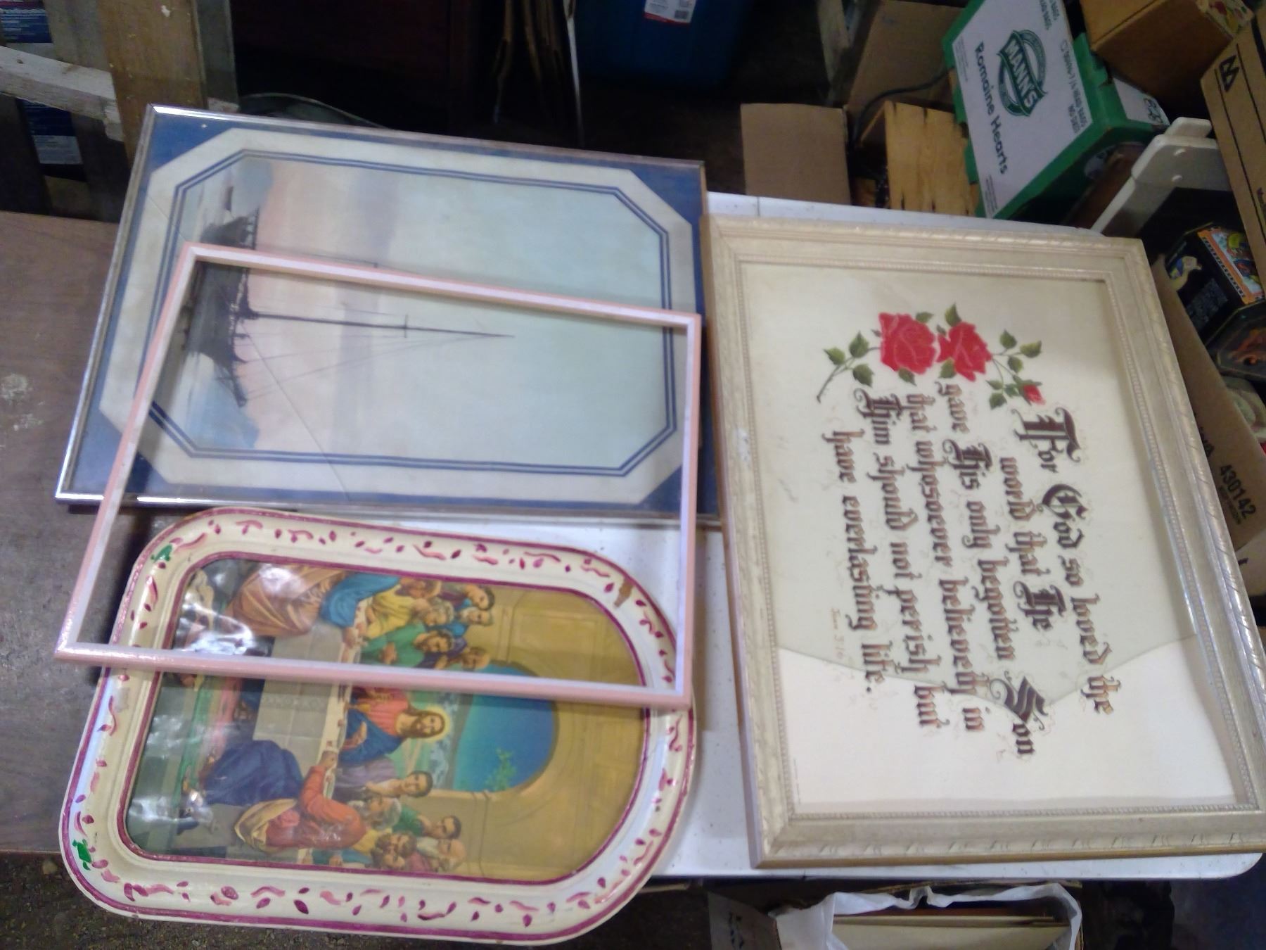 3 PICTURES IN FRAMES AND ONE WOODEN PINK FRAME