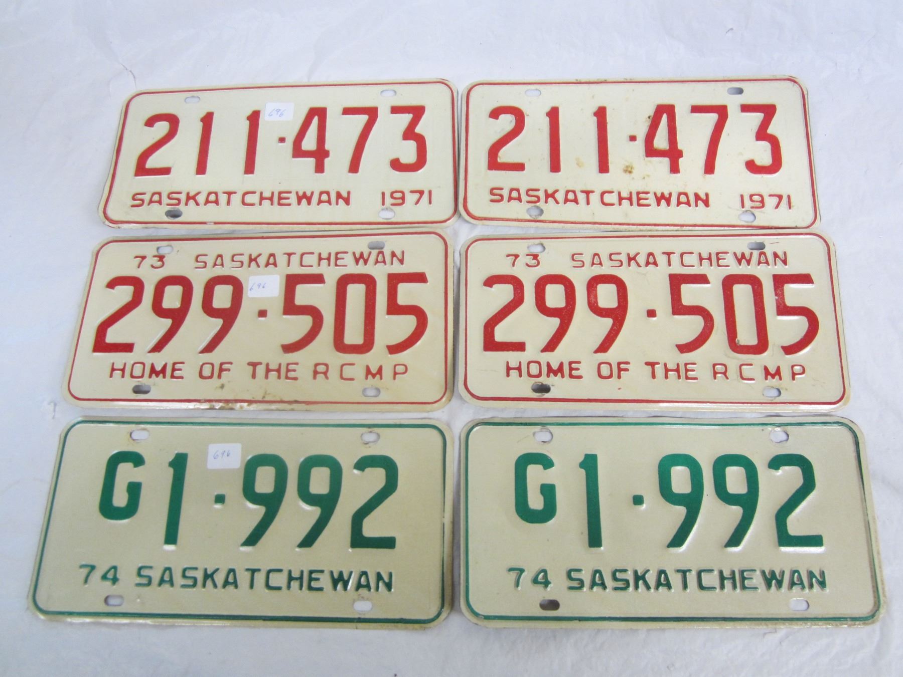 3 Pair of Saskatchewan License Plates - 1971, 1973, 1974