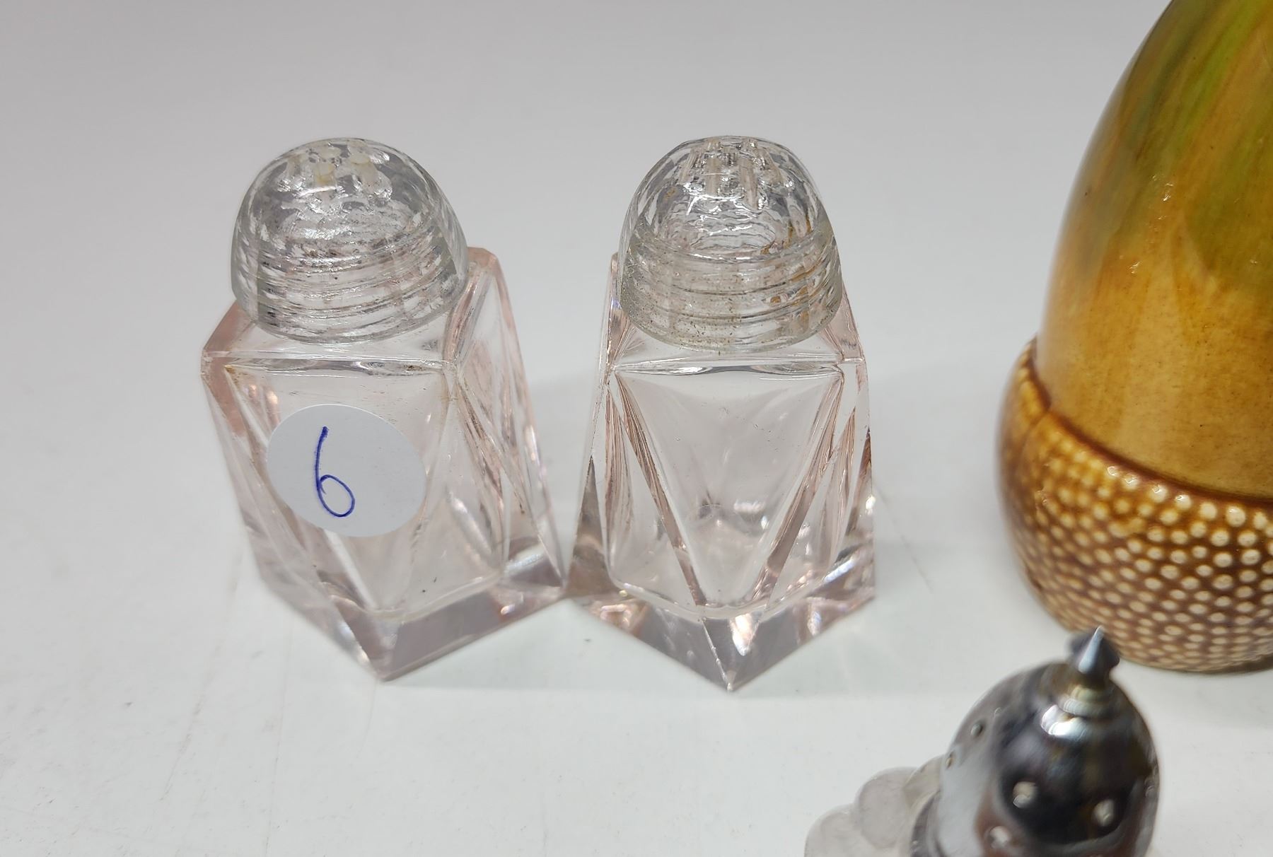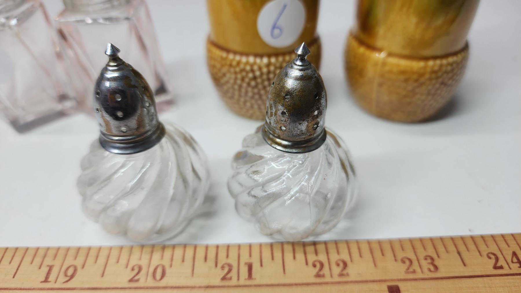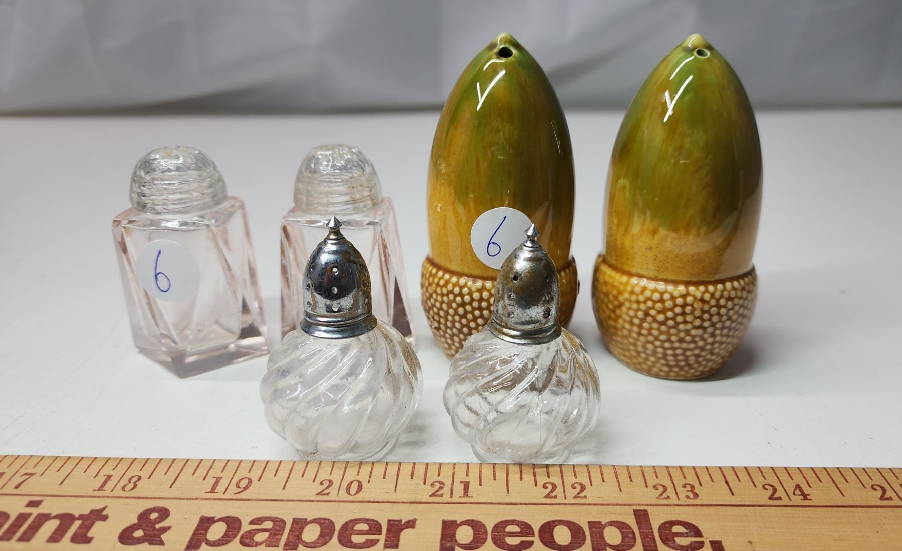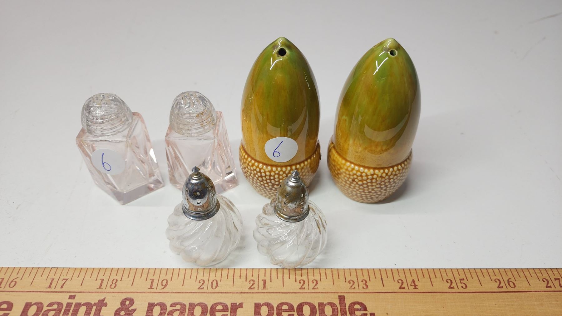 3 Pairs of Salt and Pepper shakers - Acorns, glass and pink depression glass