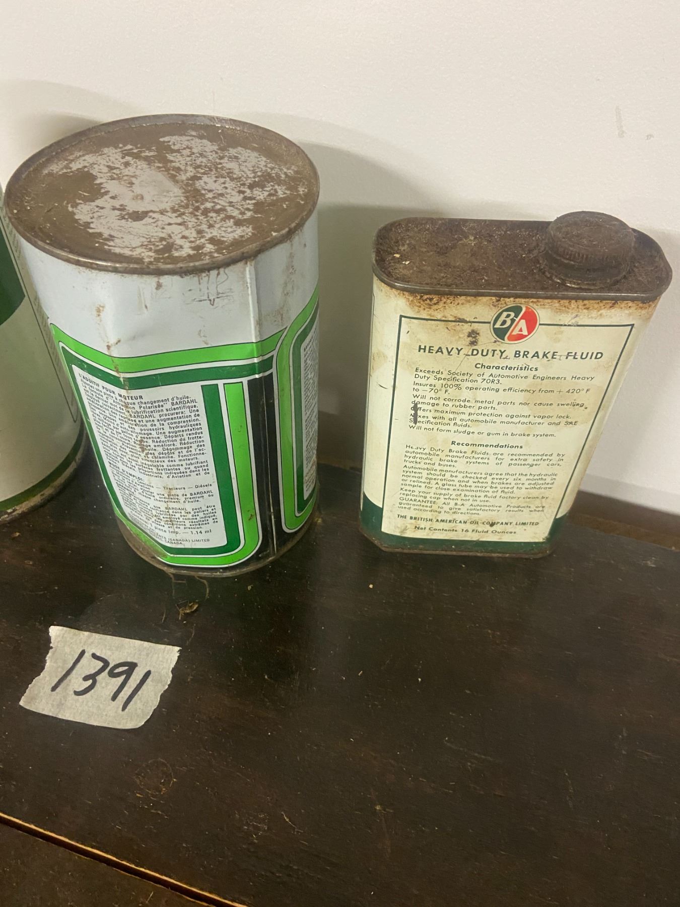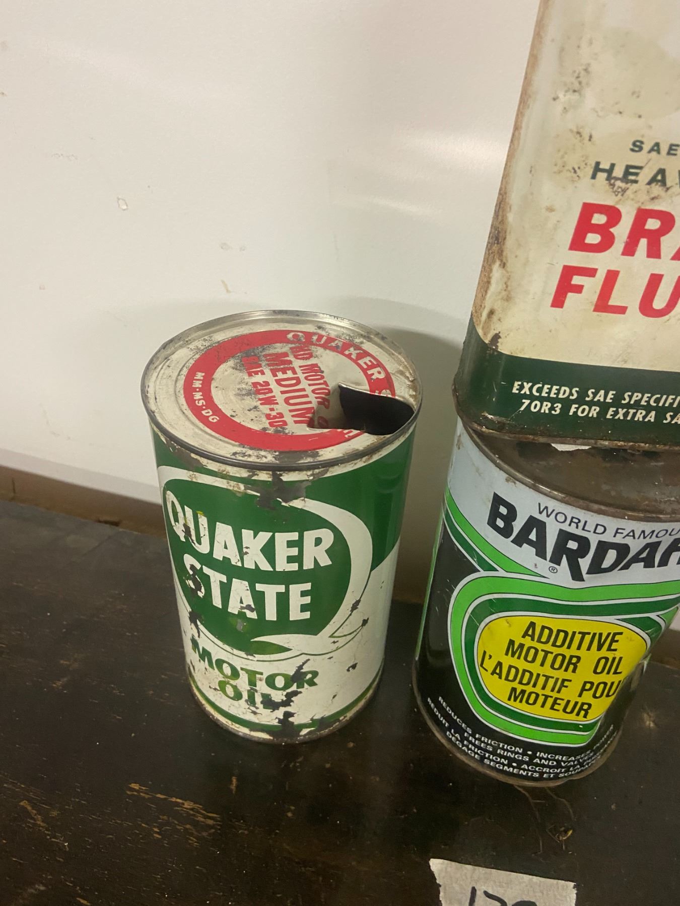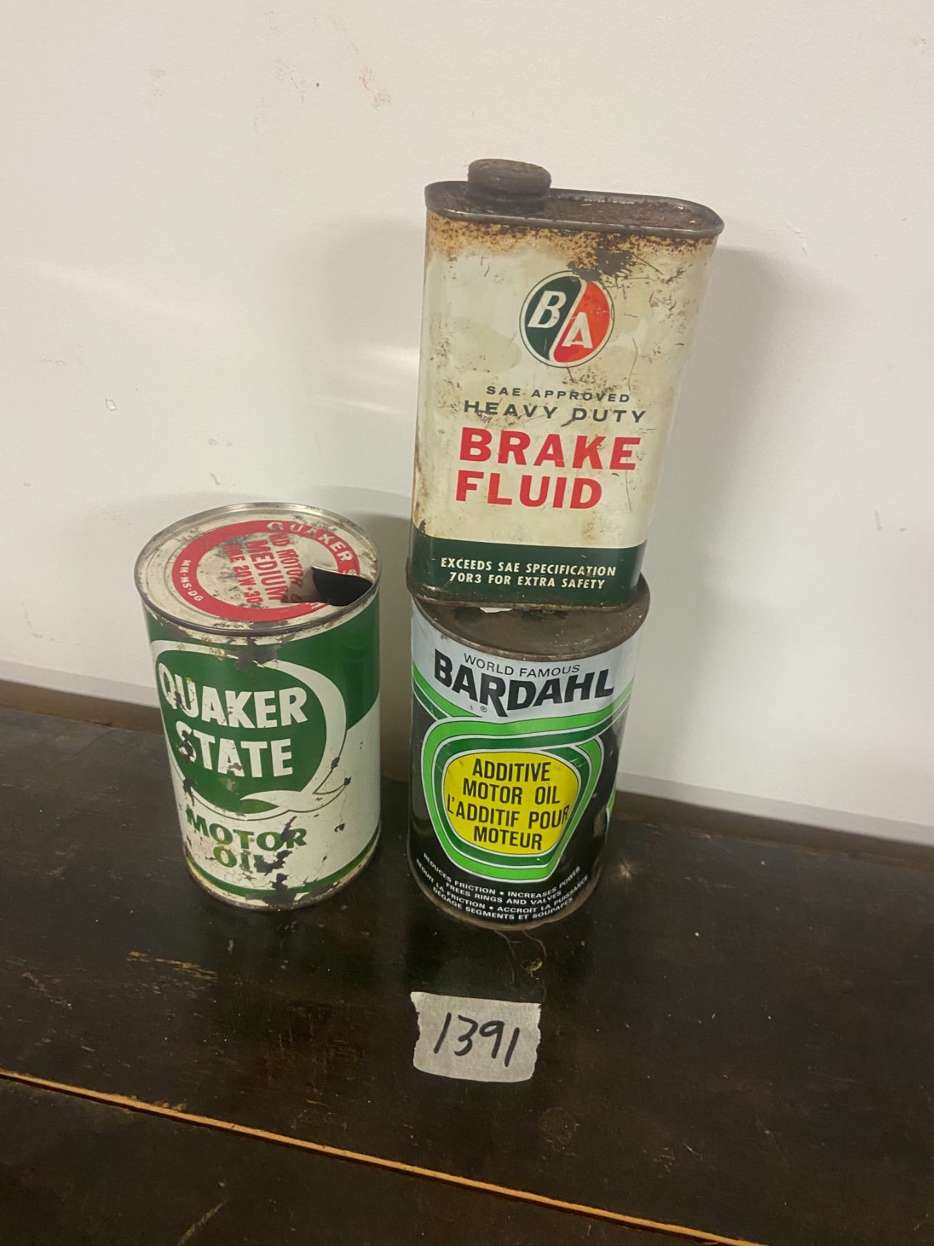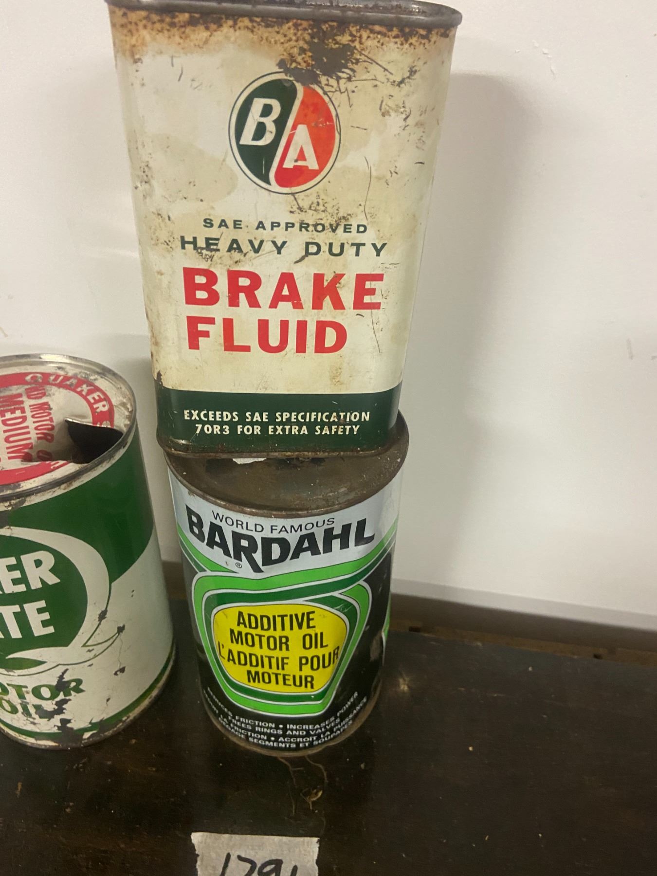 3 Poil Tins B/A Brake Fluid - Full, Bardahl - Full, Quaker State - Empty