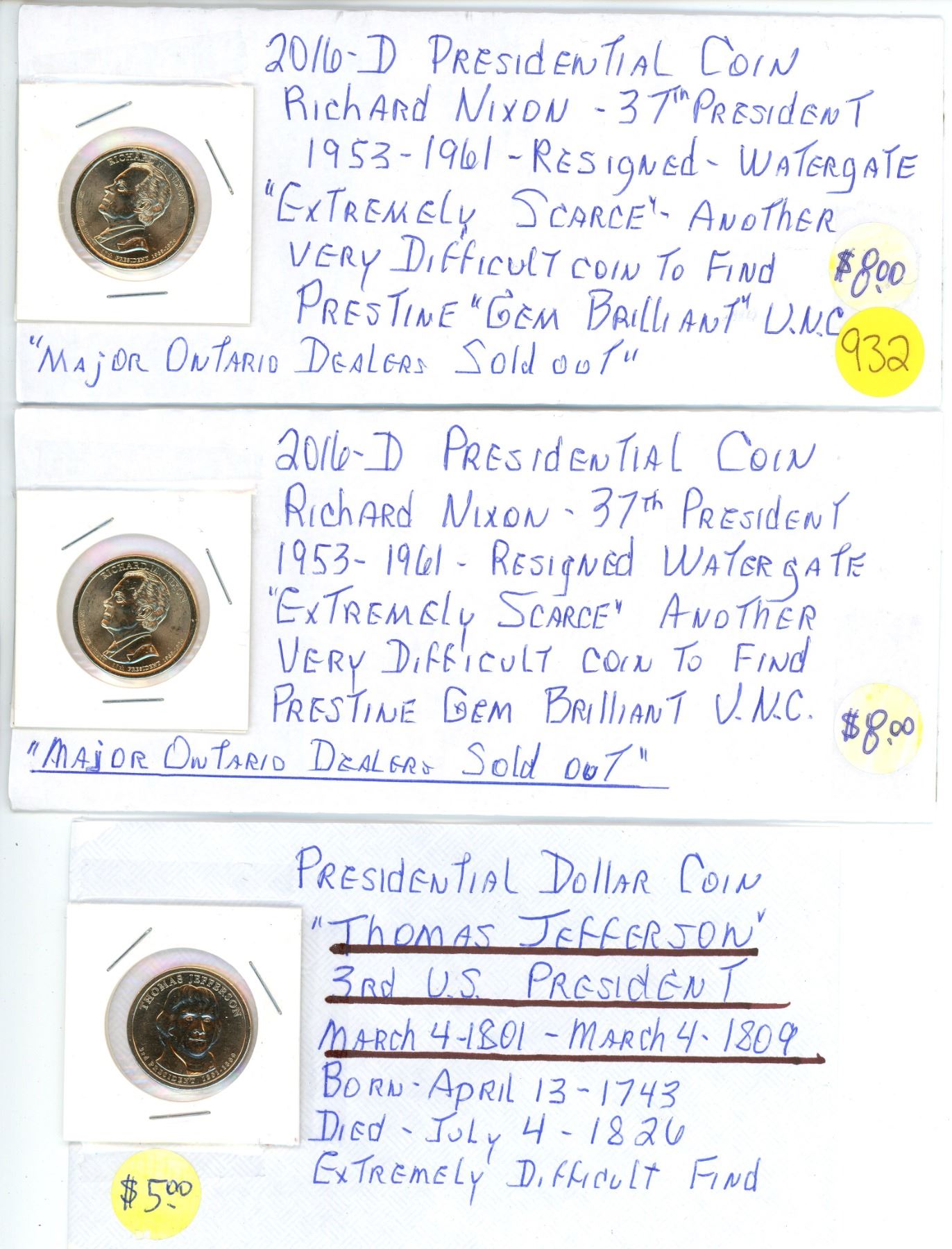 3 Presidential Loonies; 2016-D Richard Nixon (2), Thomas Jefferson
