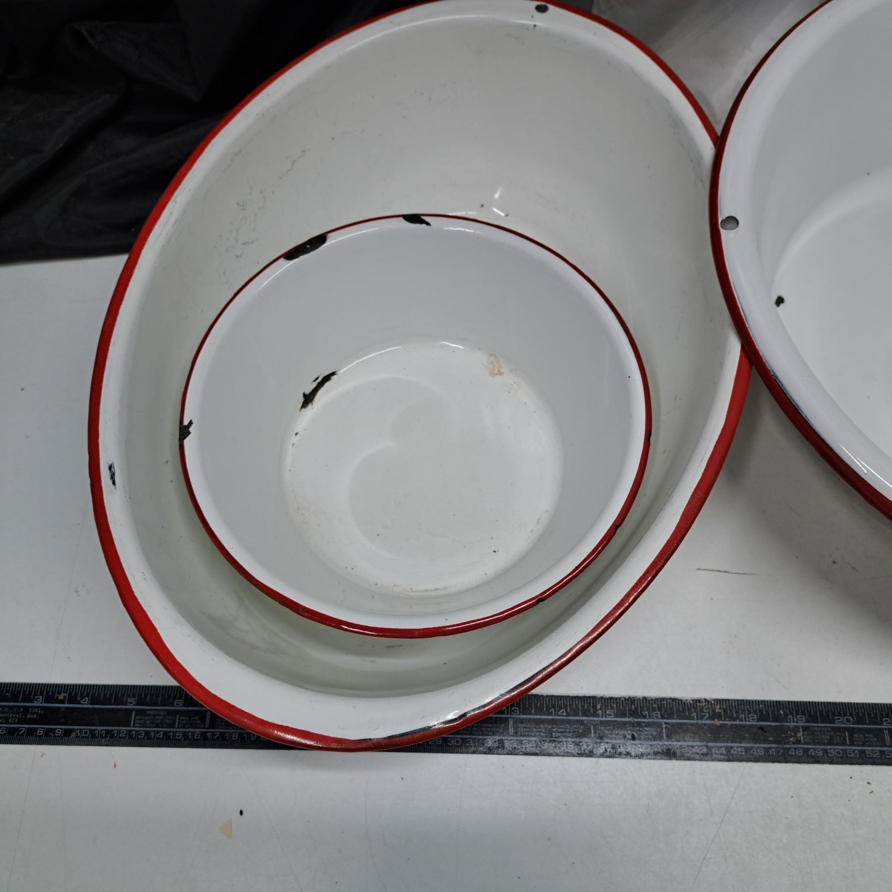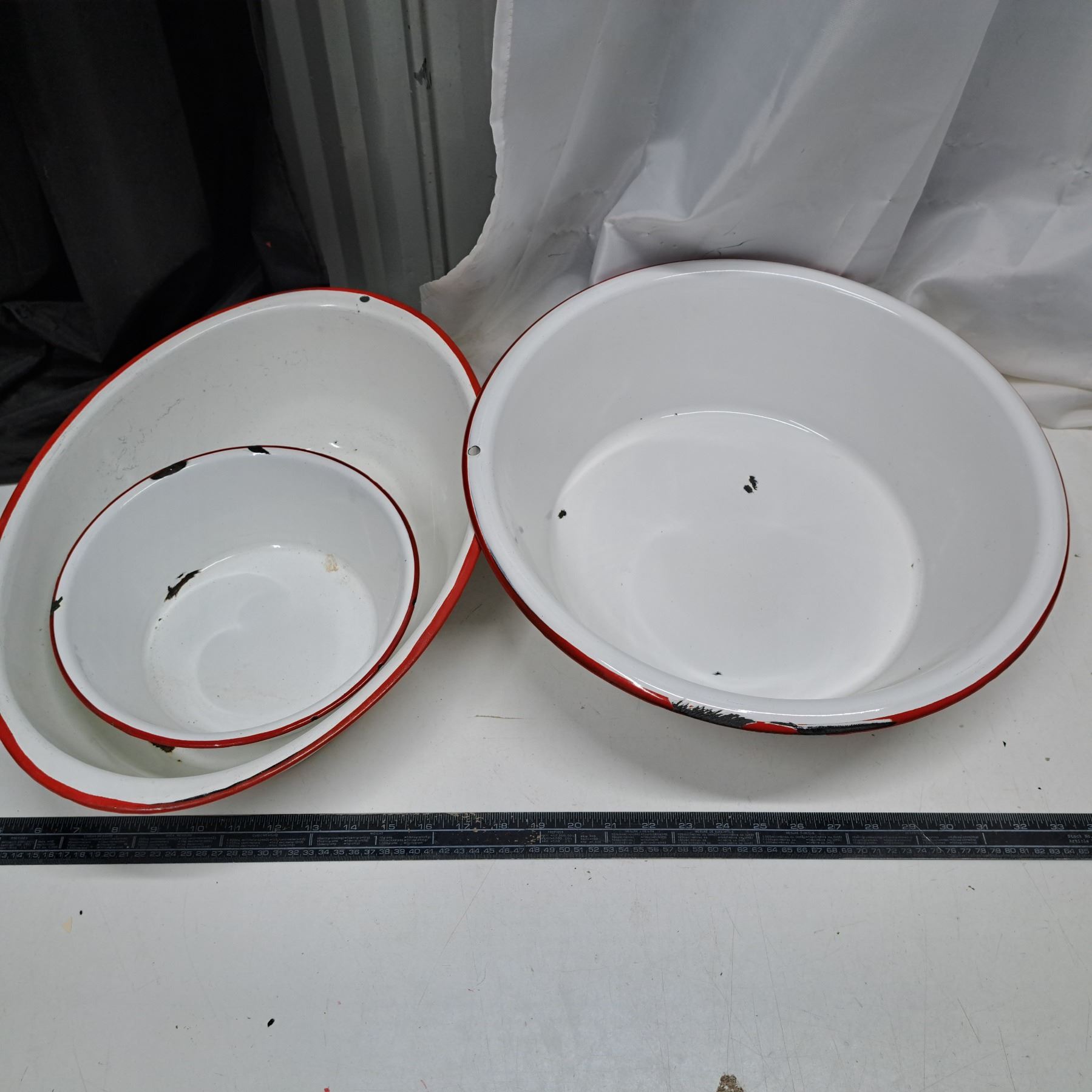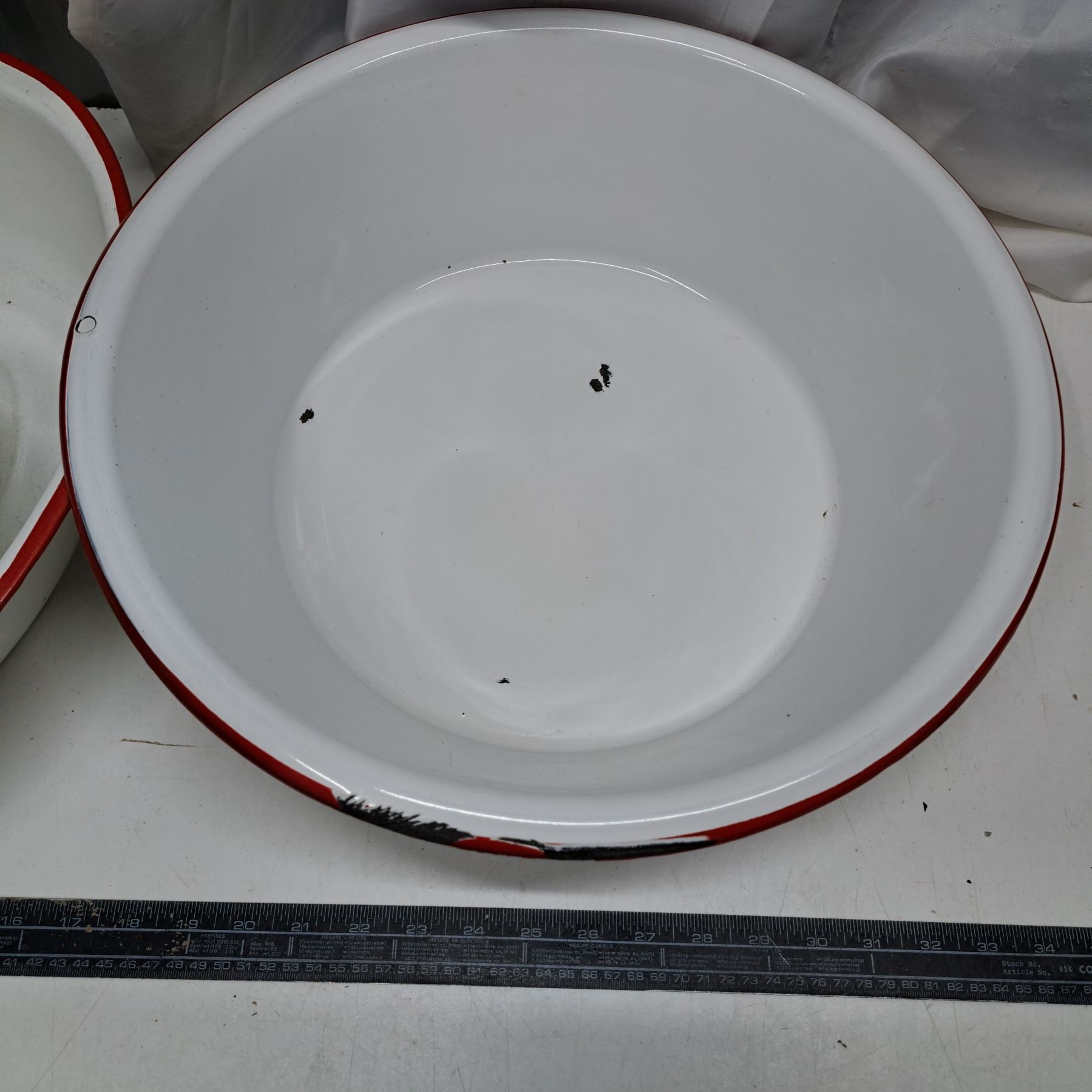 3 Red and white enamal ware pcs - basin, tub and bowl