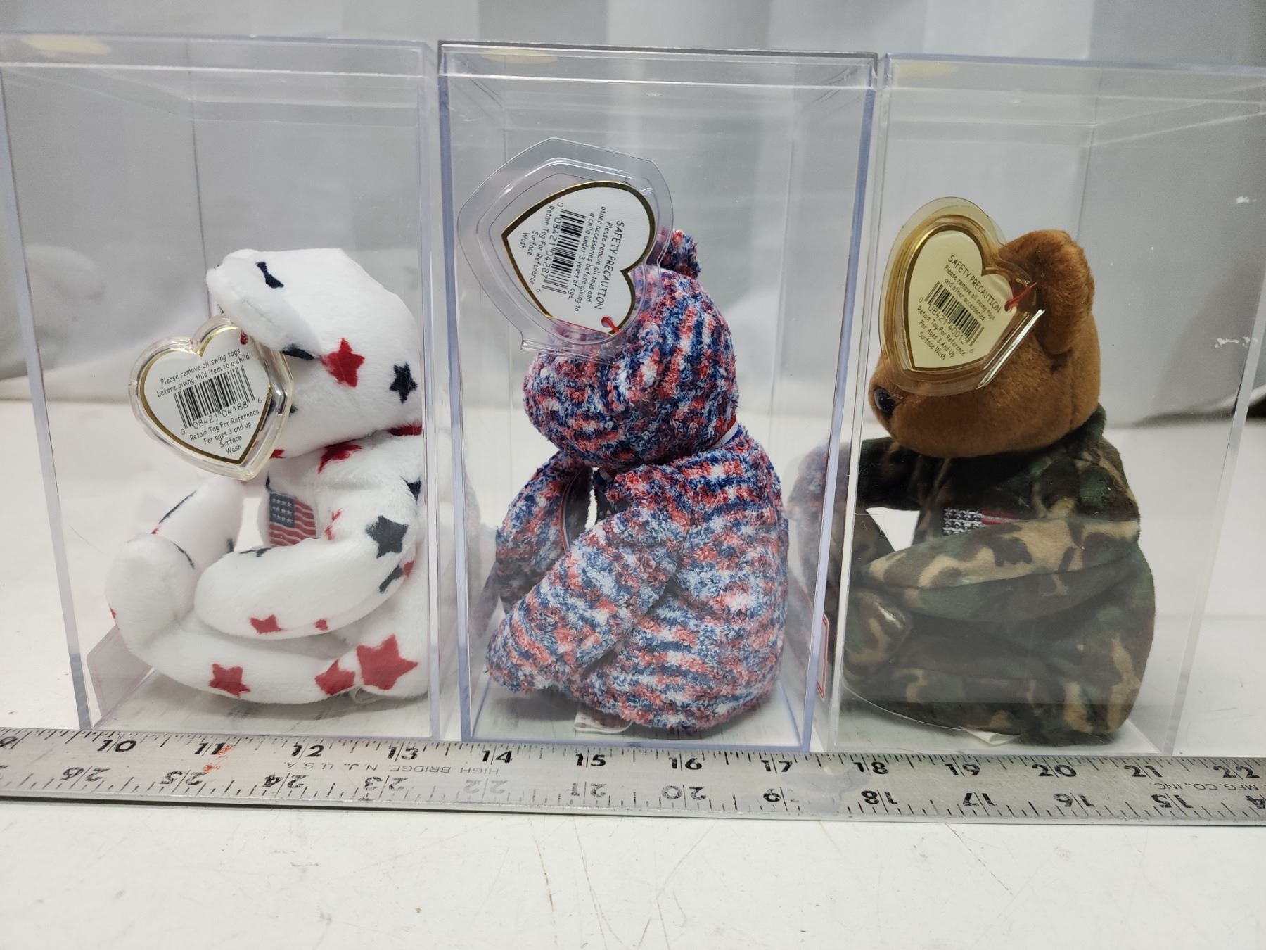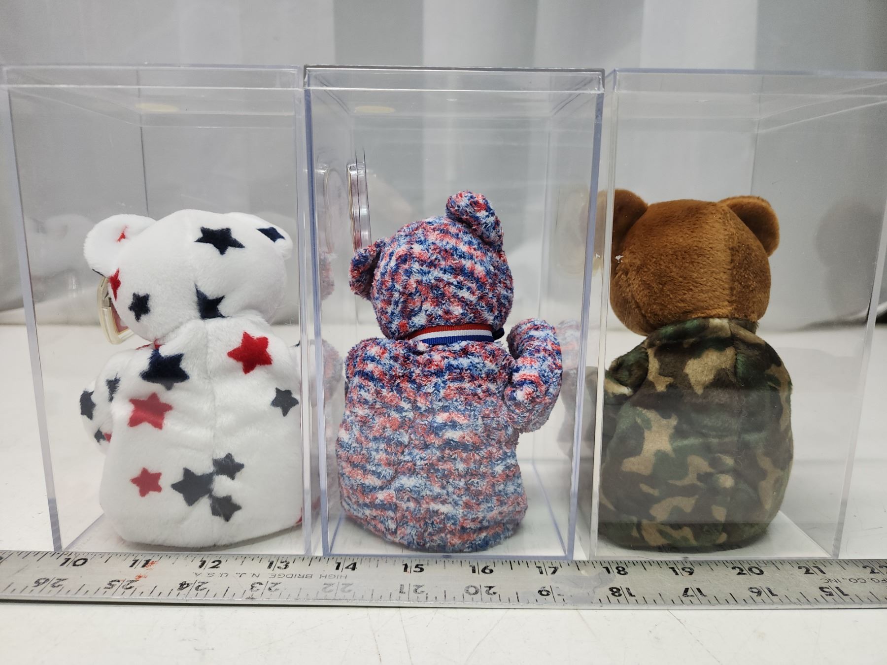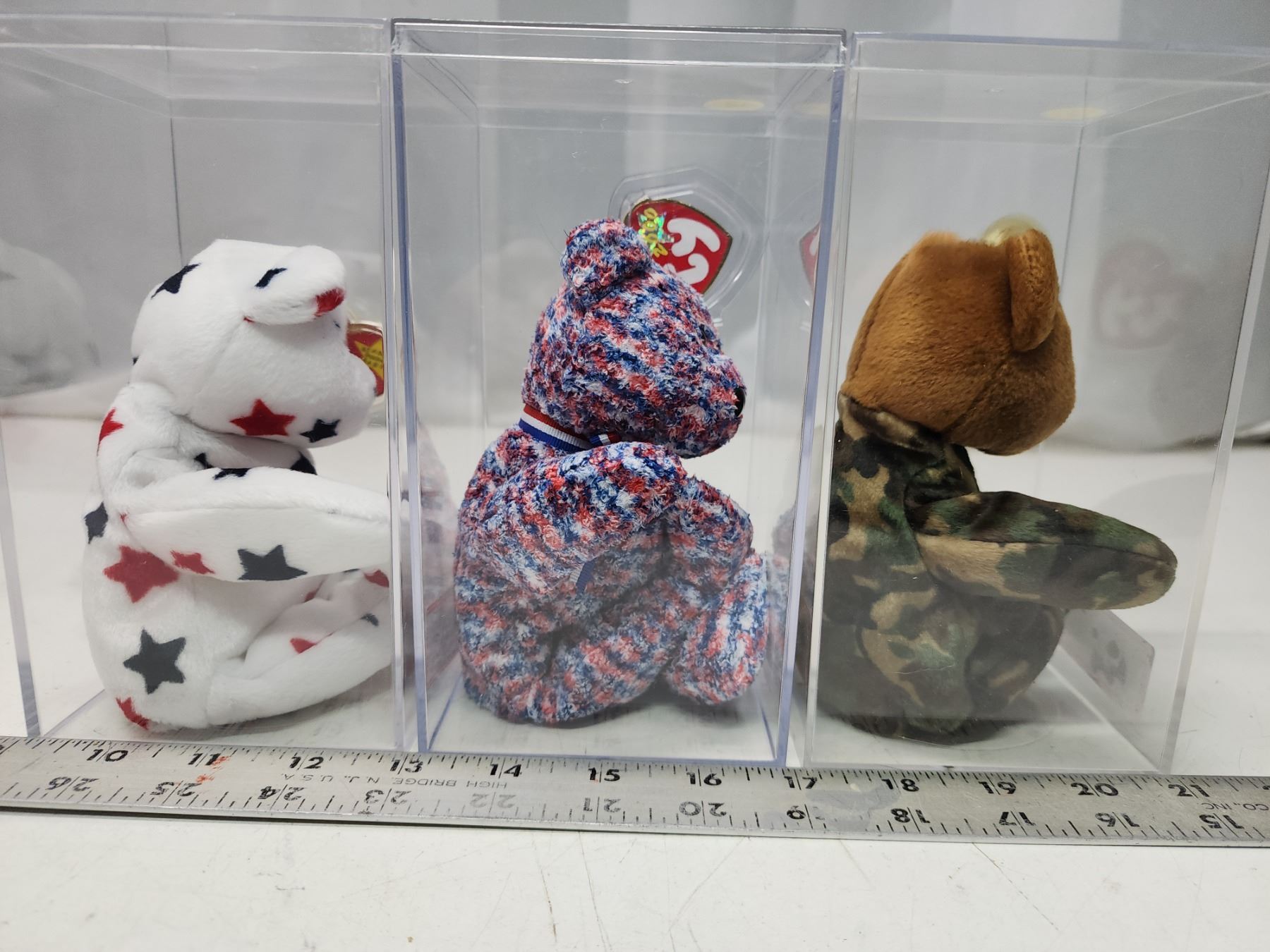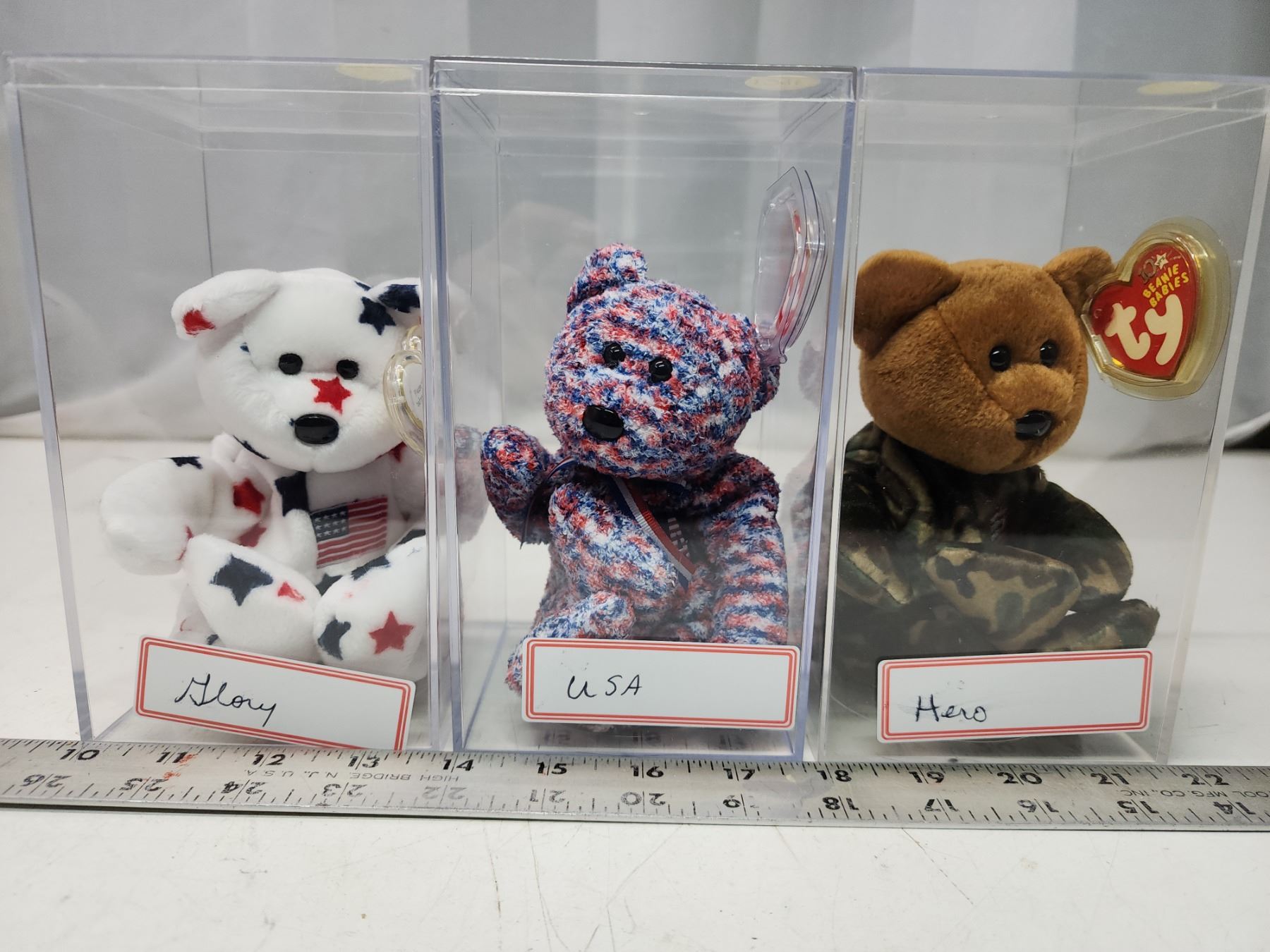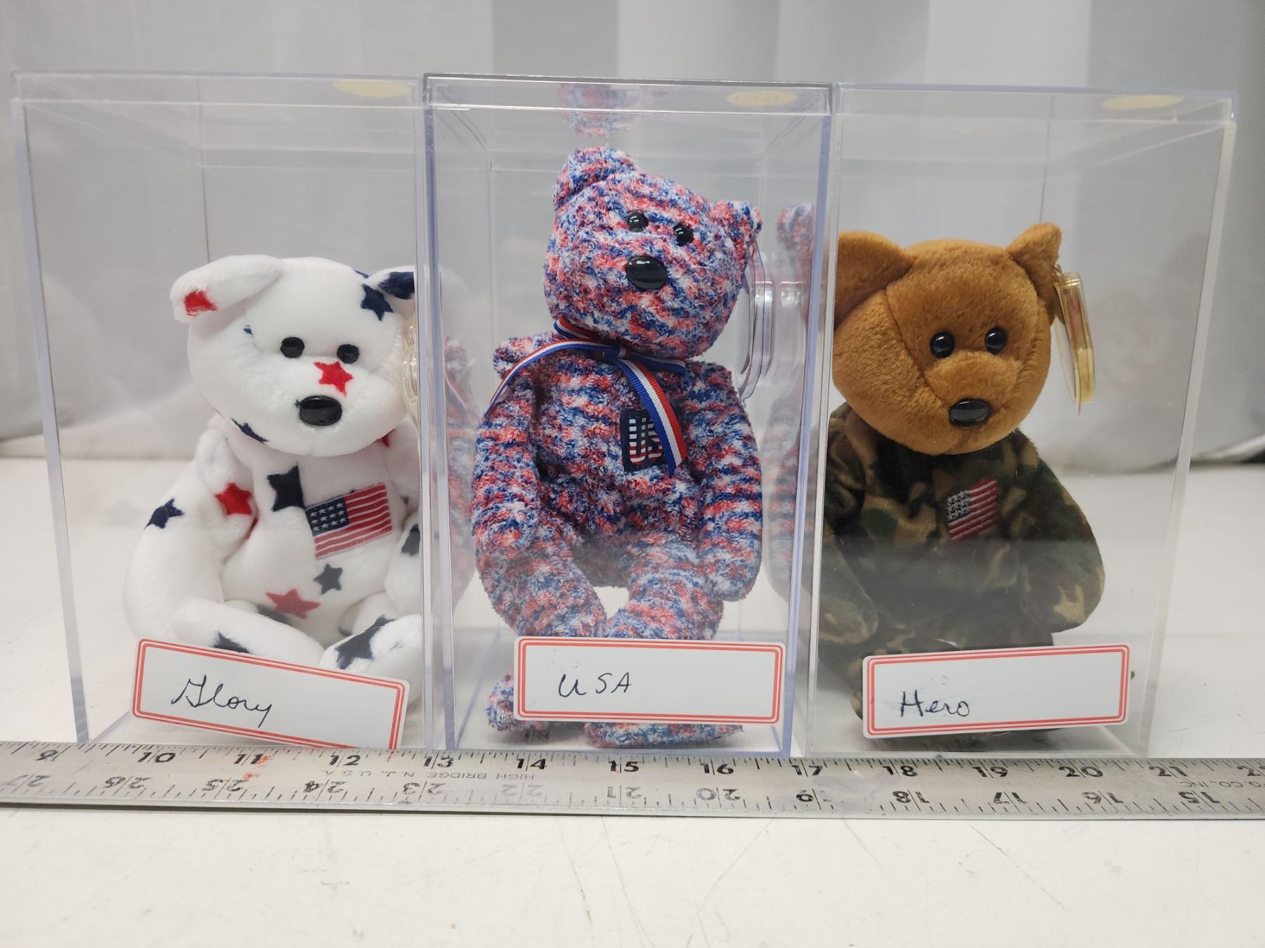 3 USA collectible bears, ty beanie babies - "USA", "Glory" & "Hero" - in clear case, like new