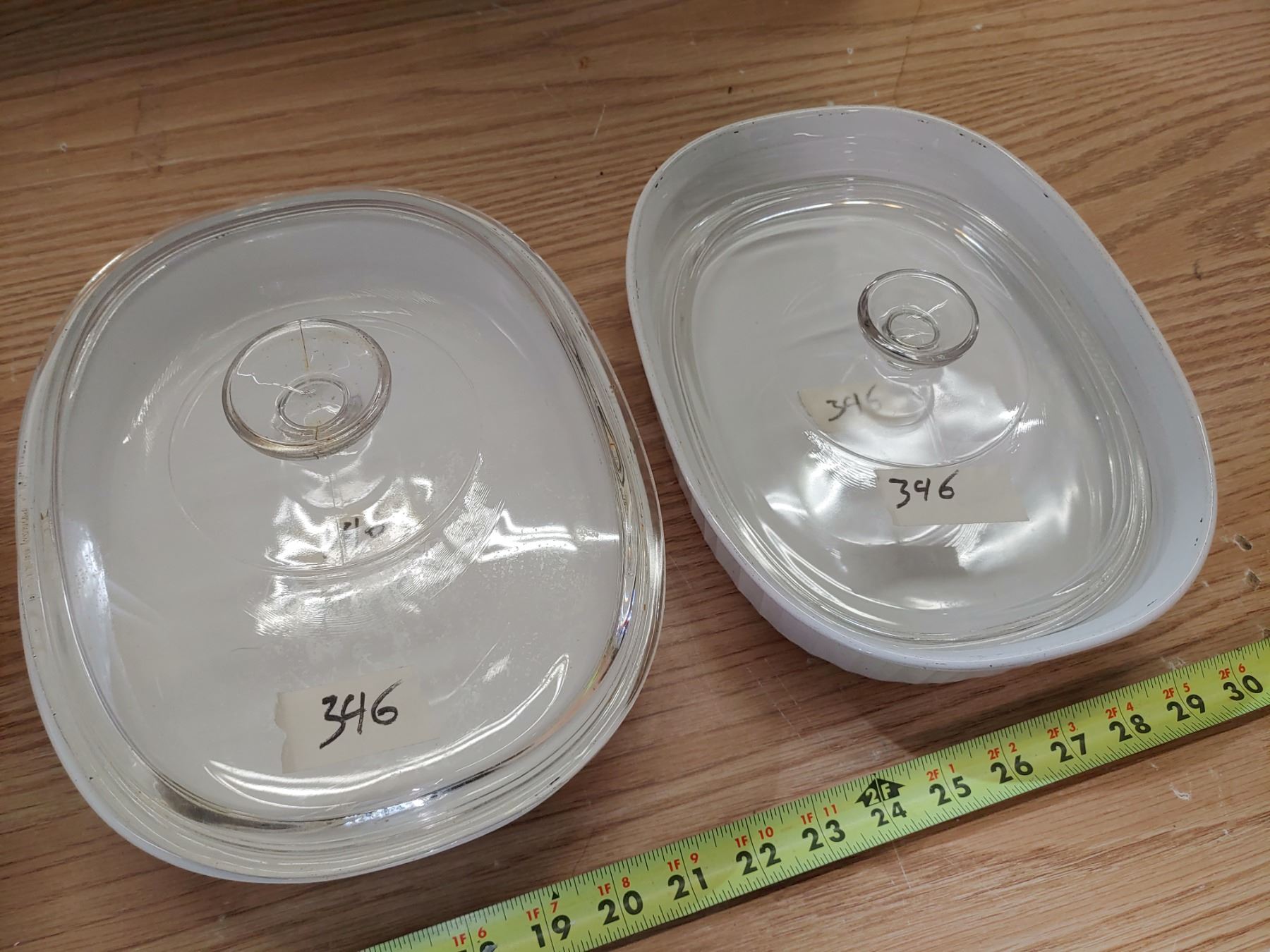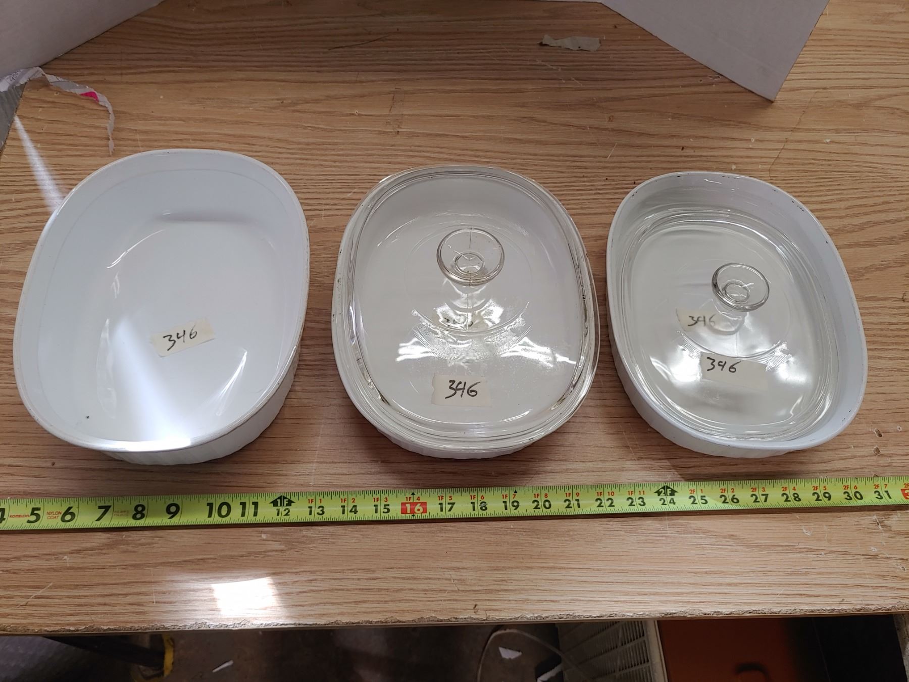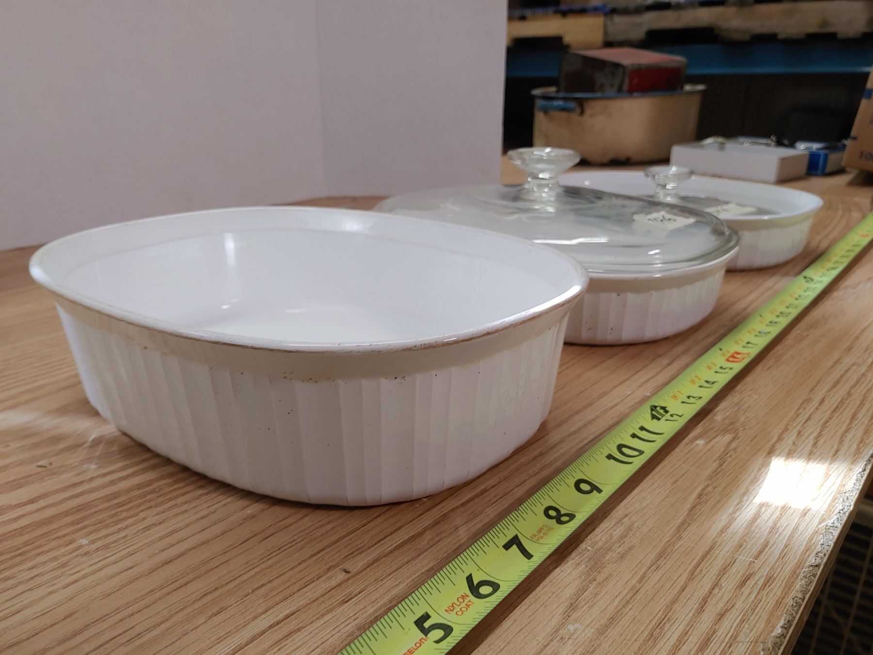 3 White Corningware Dishes, 1 Matching Lid, 1 Mismatched Lid