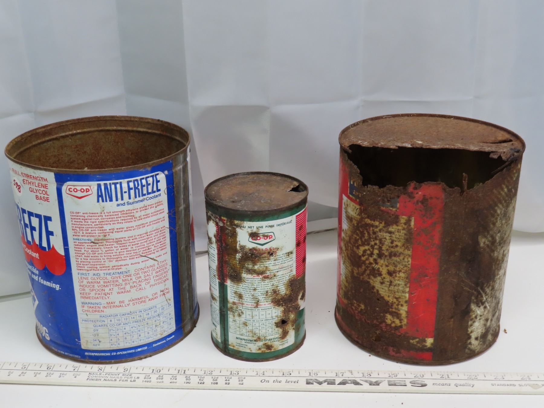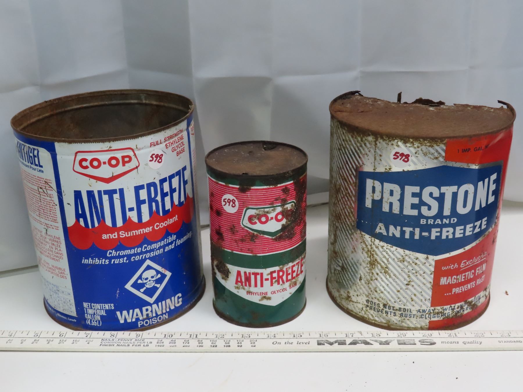 3 anti-freeze Tins (1 Imperial gallon co-op Tin, 1 imperial gallon Prestone brand, 1 co-op Tin)