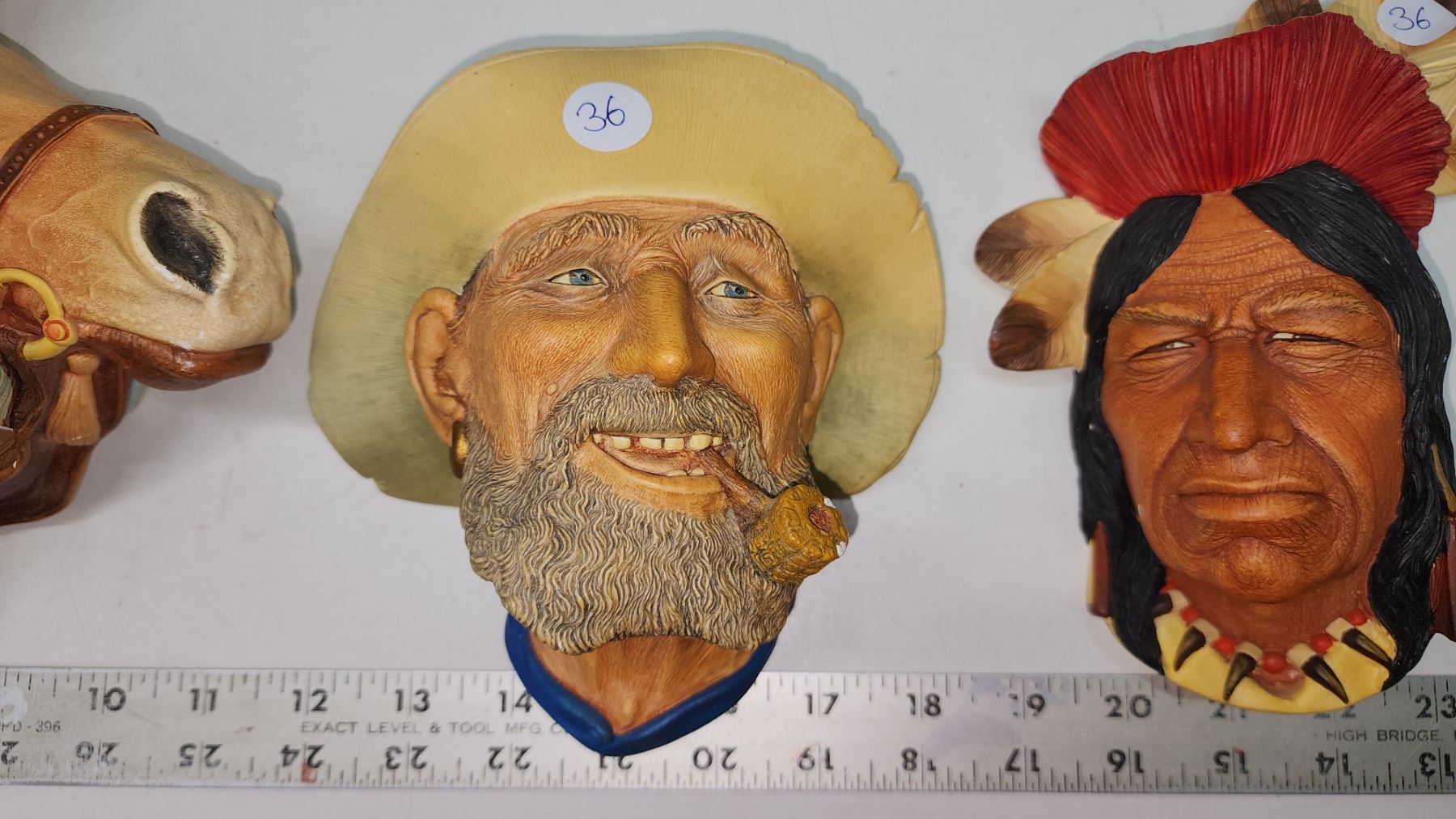 3 assorted "Bossons" decorative head, wall mount figures - Man and horse, old man and native American