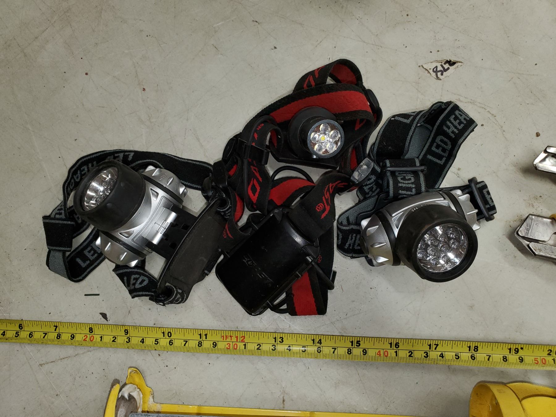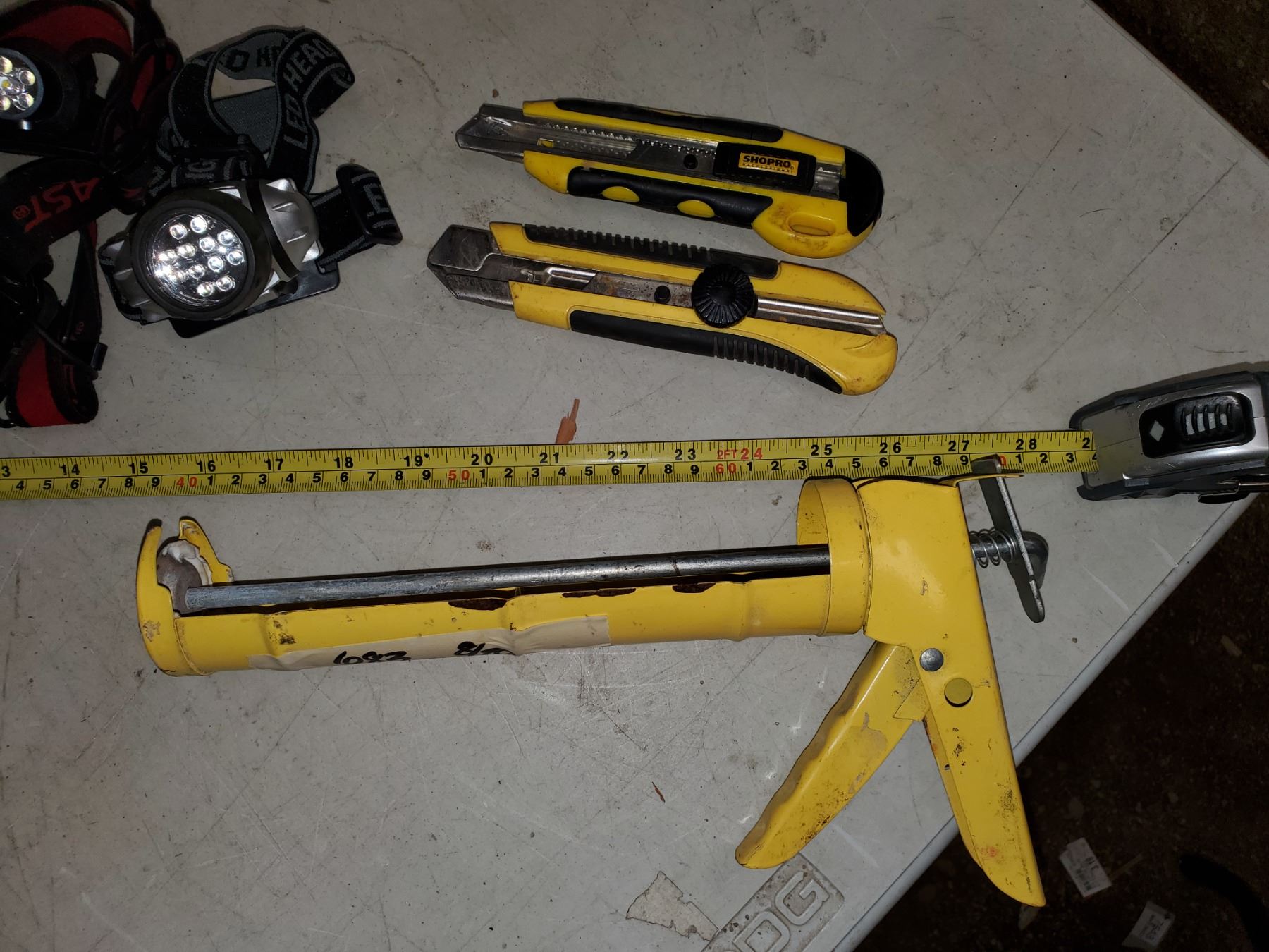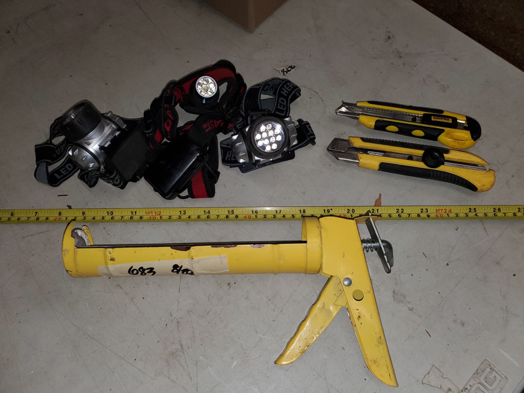 3 battery headlamps, caulking gun, 2 utility knives