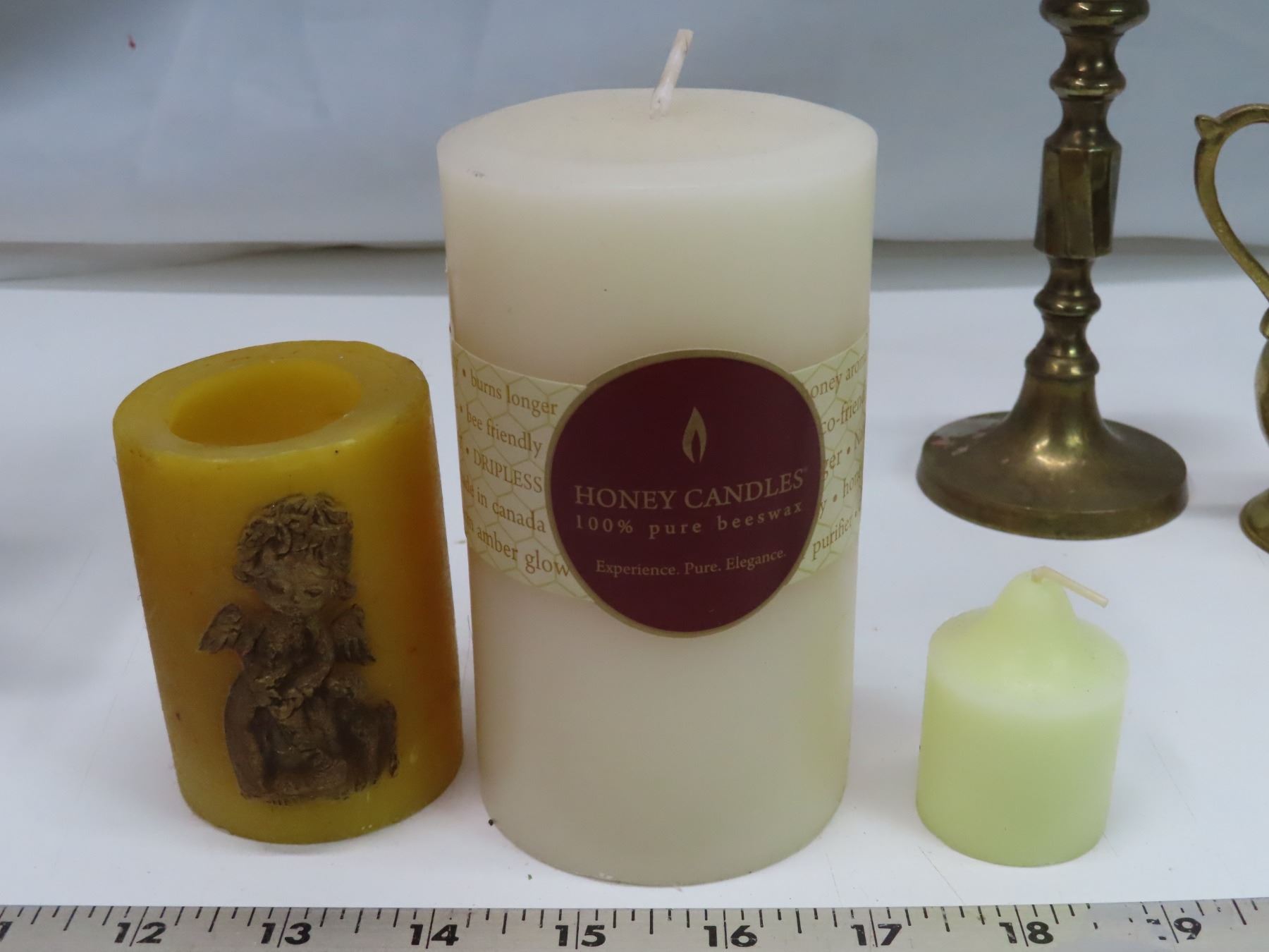 3 brass candle sticks and candles + Metal decor mantle piece e
