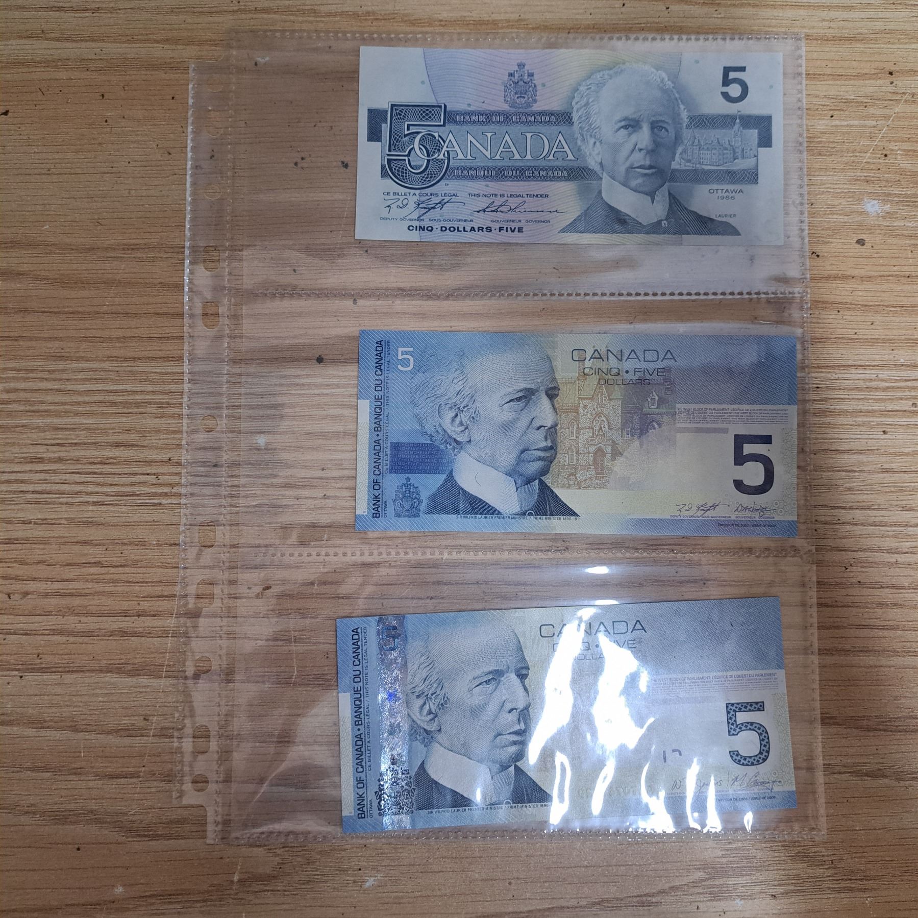 3 canadian 1986, 2002,2006- 5 dollar bills