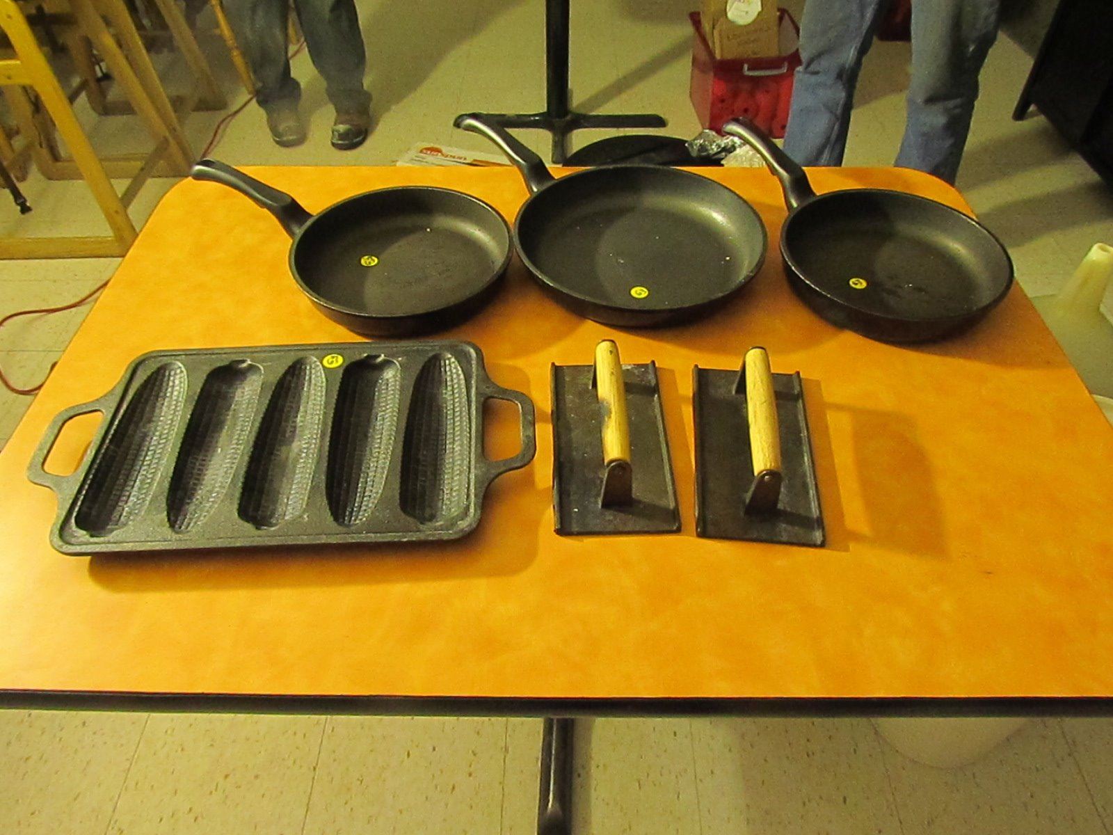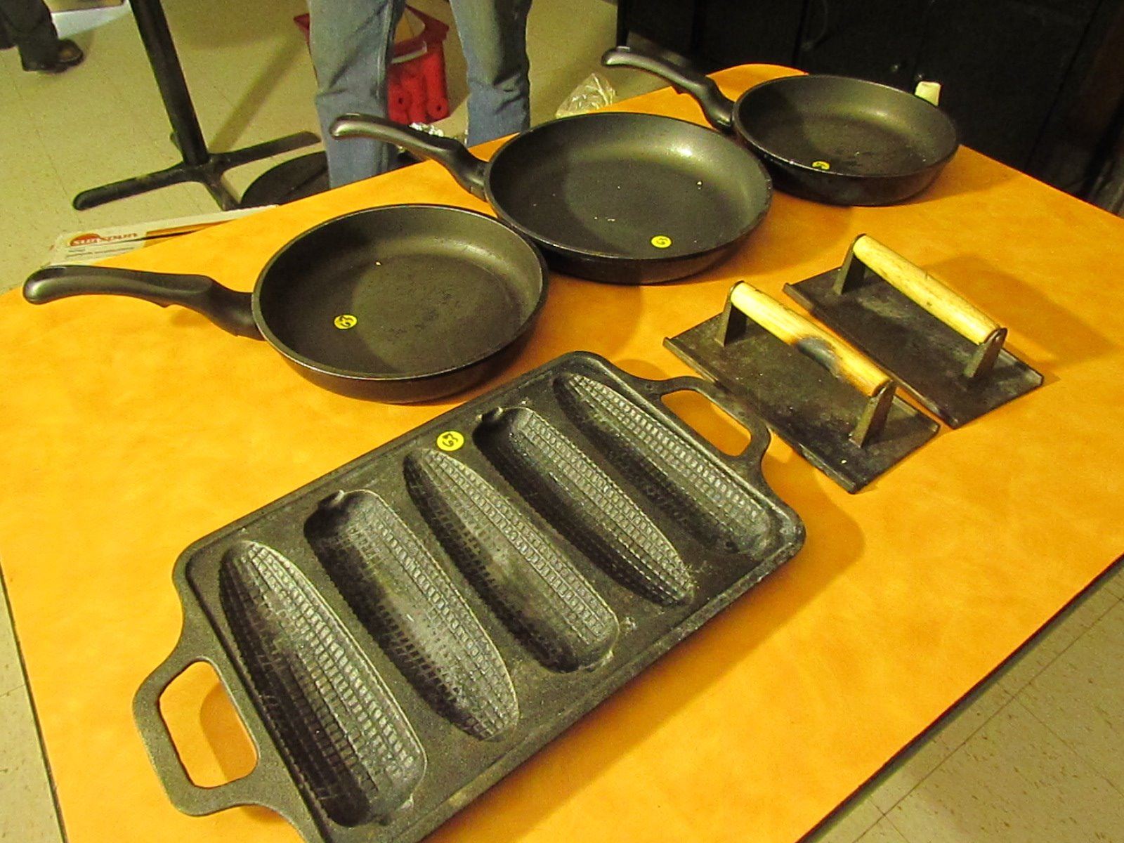 3 cast iron frying pans, corn press & presses