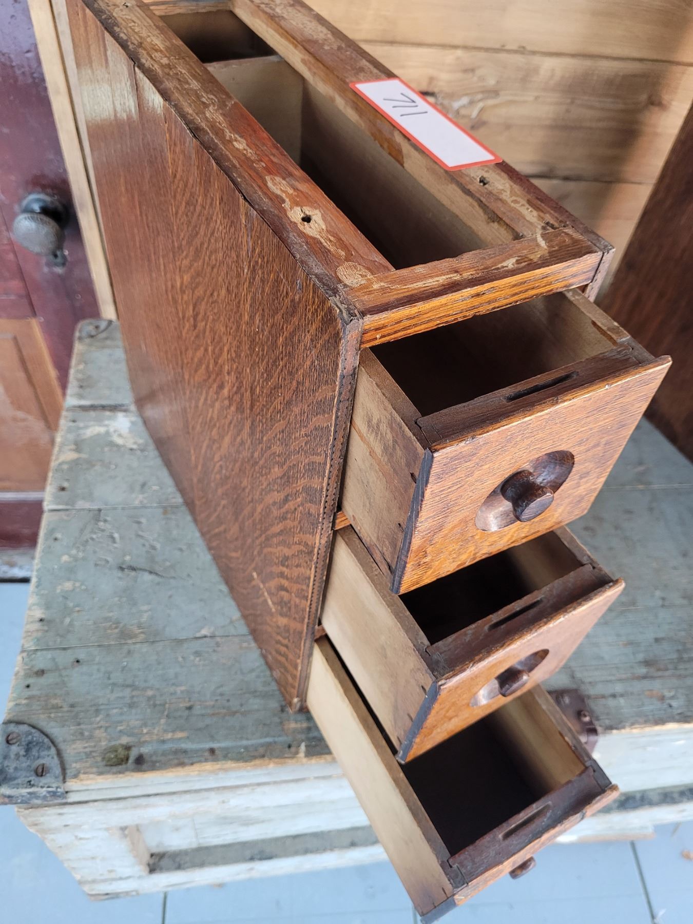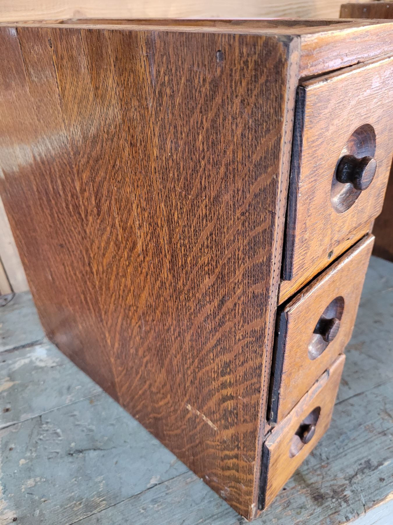 3 drawer bank of sewing machine drawers, oak 14 x 14 x 5