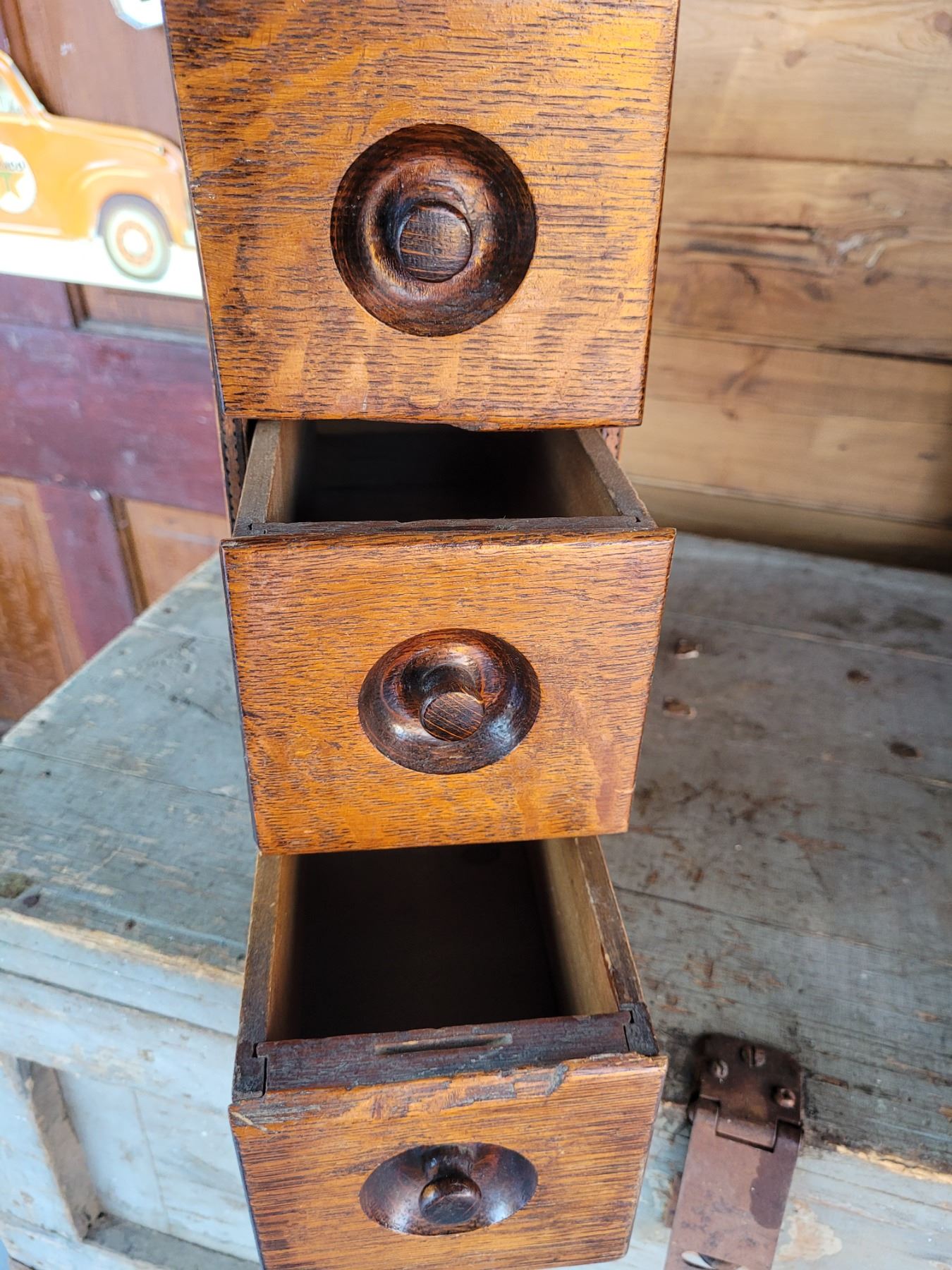 3 drawer bank of sewing machine drawers, oak 14 x 14 x 5"