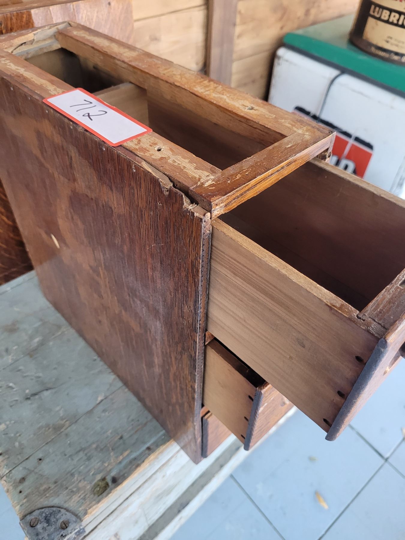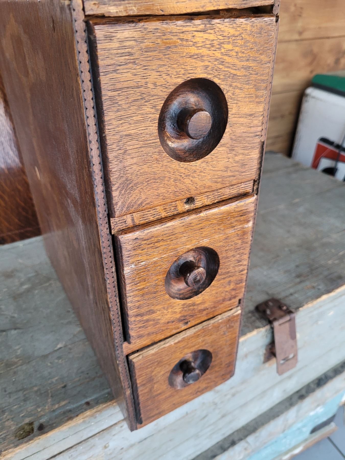 3 drawer bank of sewing machine drawers, oak 14 x 14 x 5"