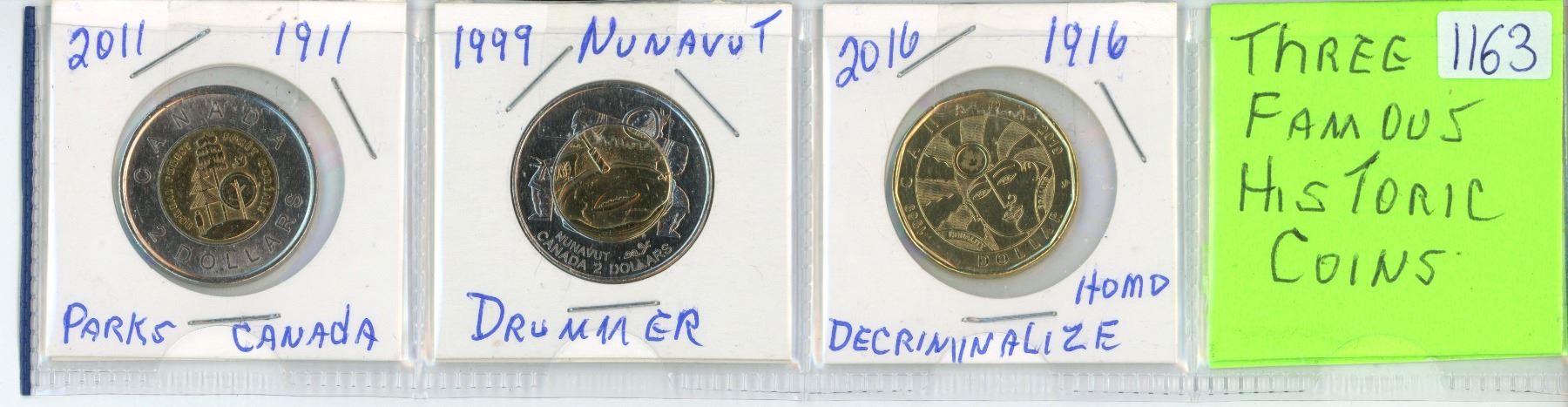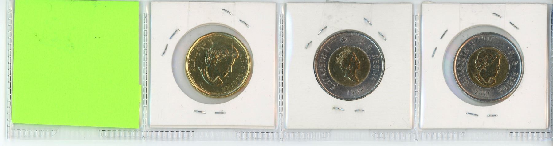 3 famous historic Canadian coins - 1999, 2011 Canadian 2 dollars & 2016 1 dollar coin