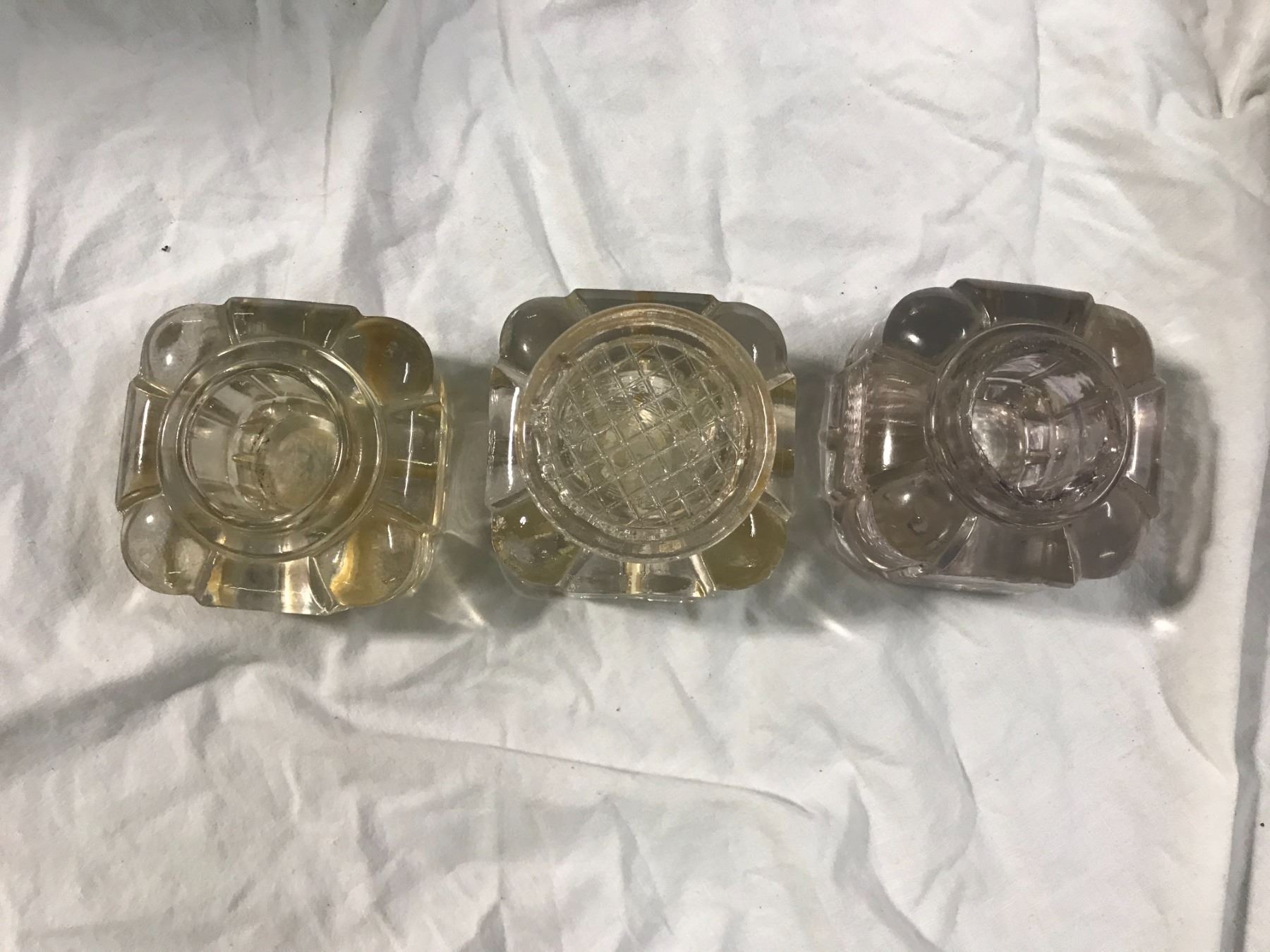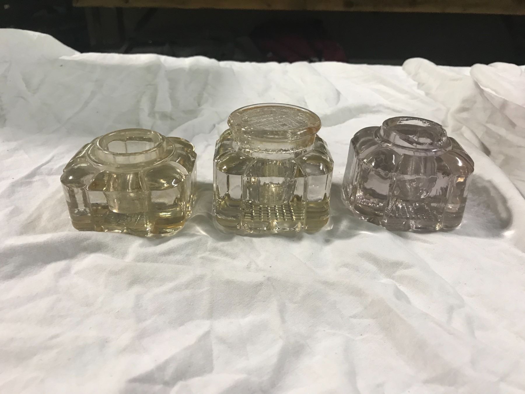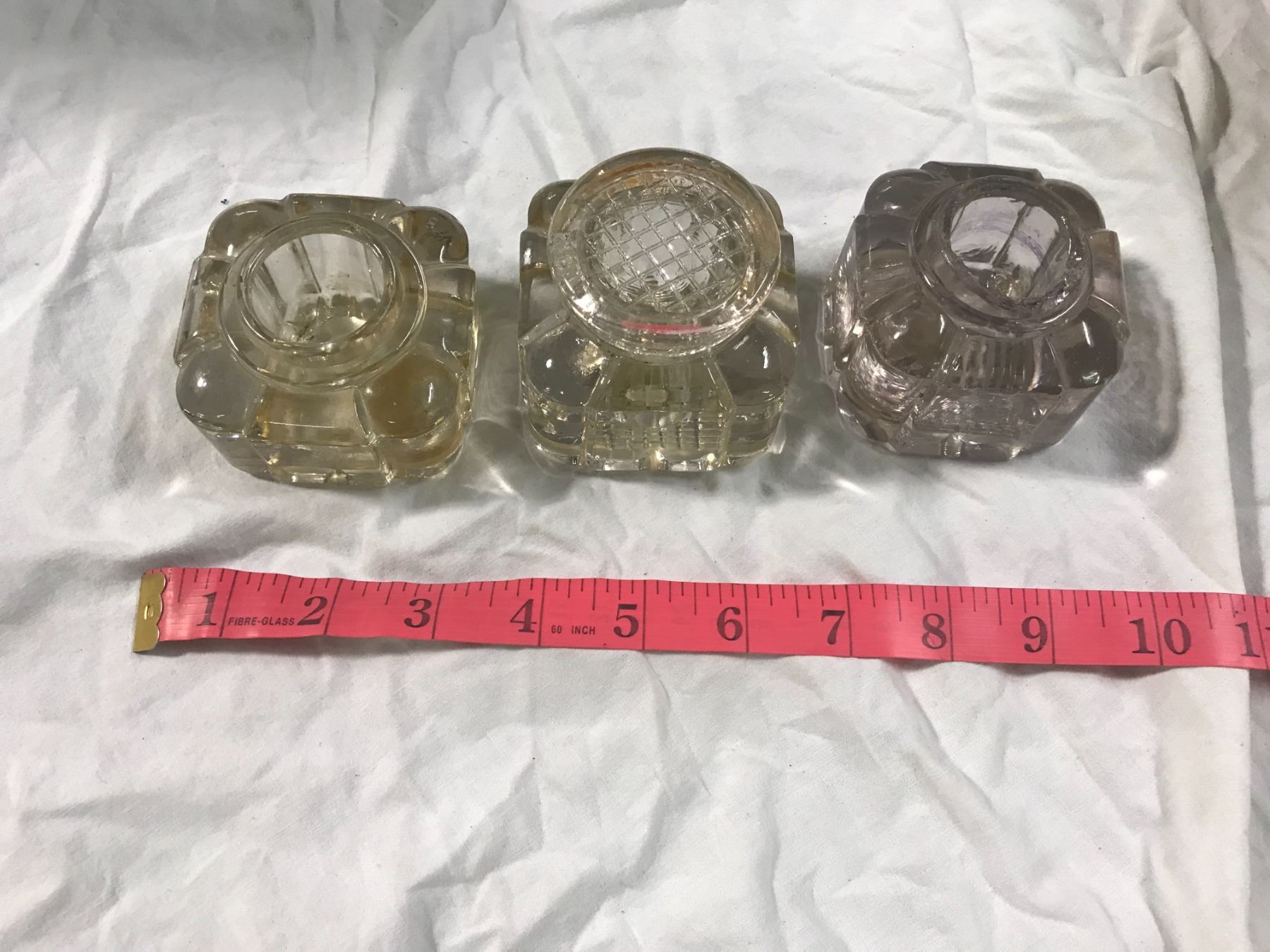 3 glass ink wells 1 with cover + 1 no cover and Chipped