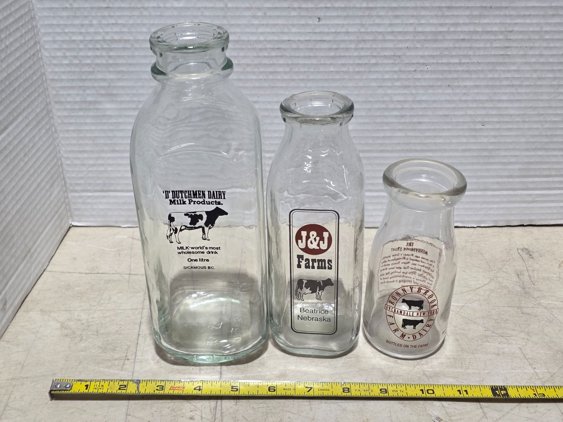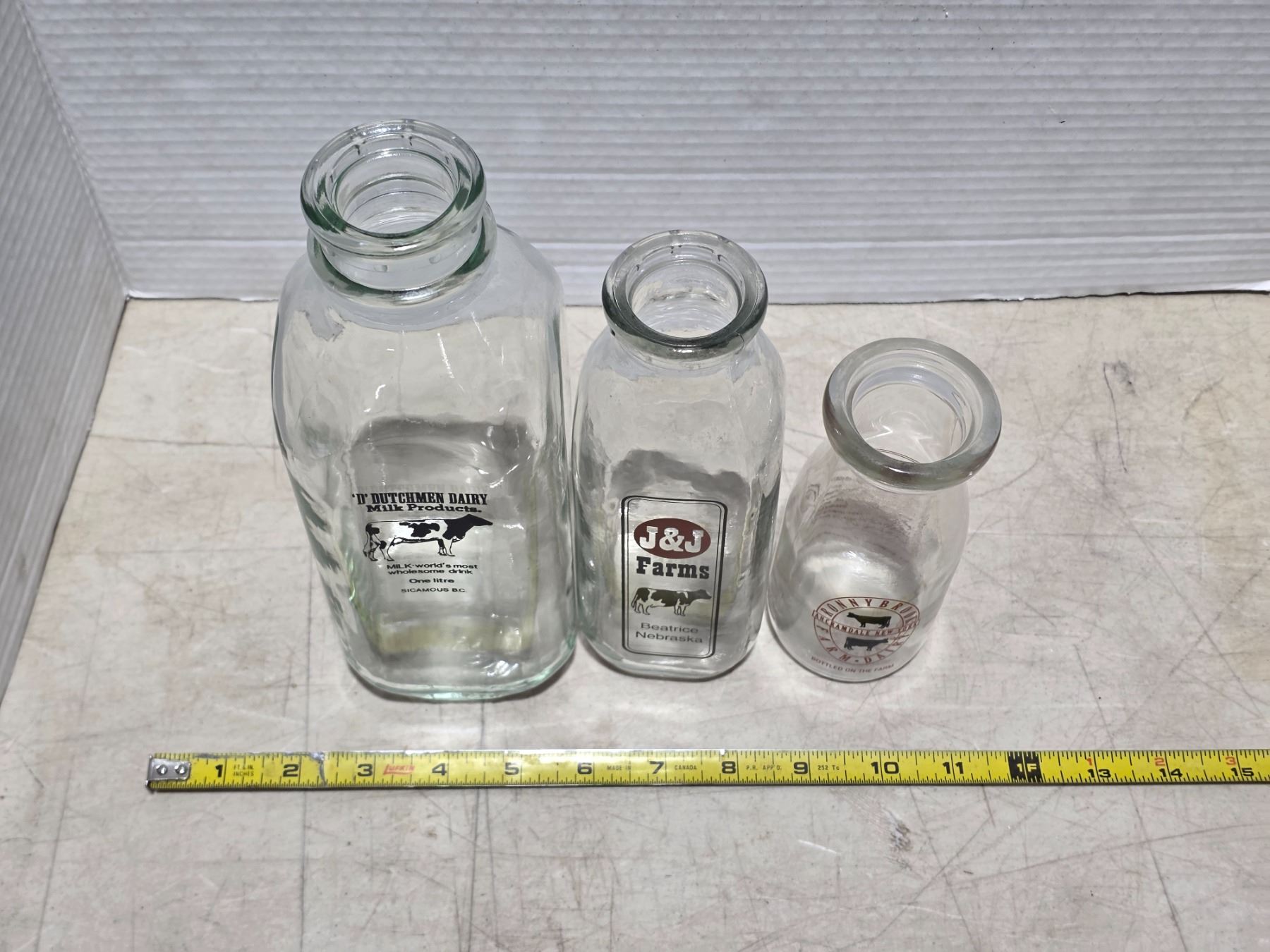 3 glass milk bottles- J and J, Dutchman dairy, Ronny brook