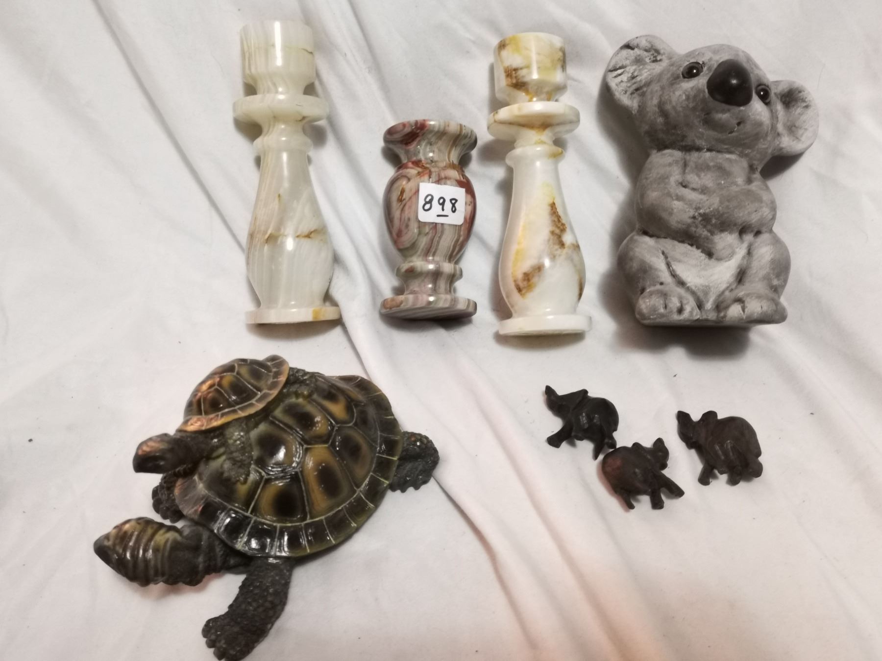 3 marble candle sticks and stone koloa, wooden elephants, resenn turtle