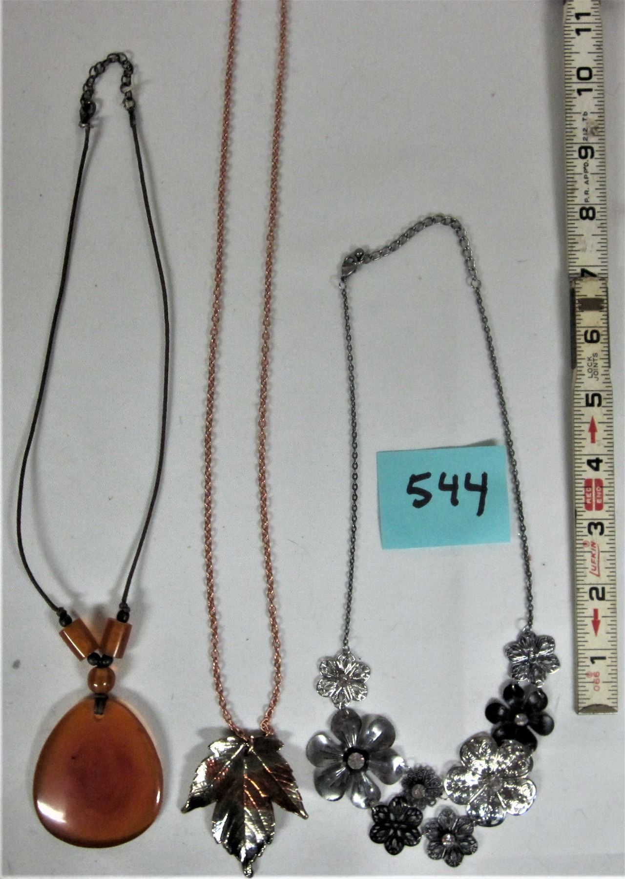 3 necklaces 24" copper chain with metal leaf pendant, 16" Multi silver color floral with rhinestone insets, 20" rope with amber plastic pendant