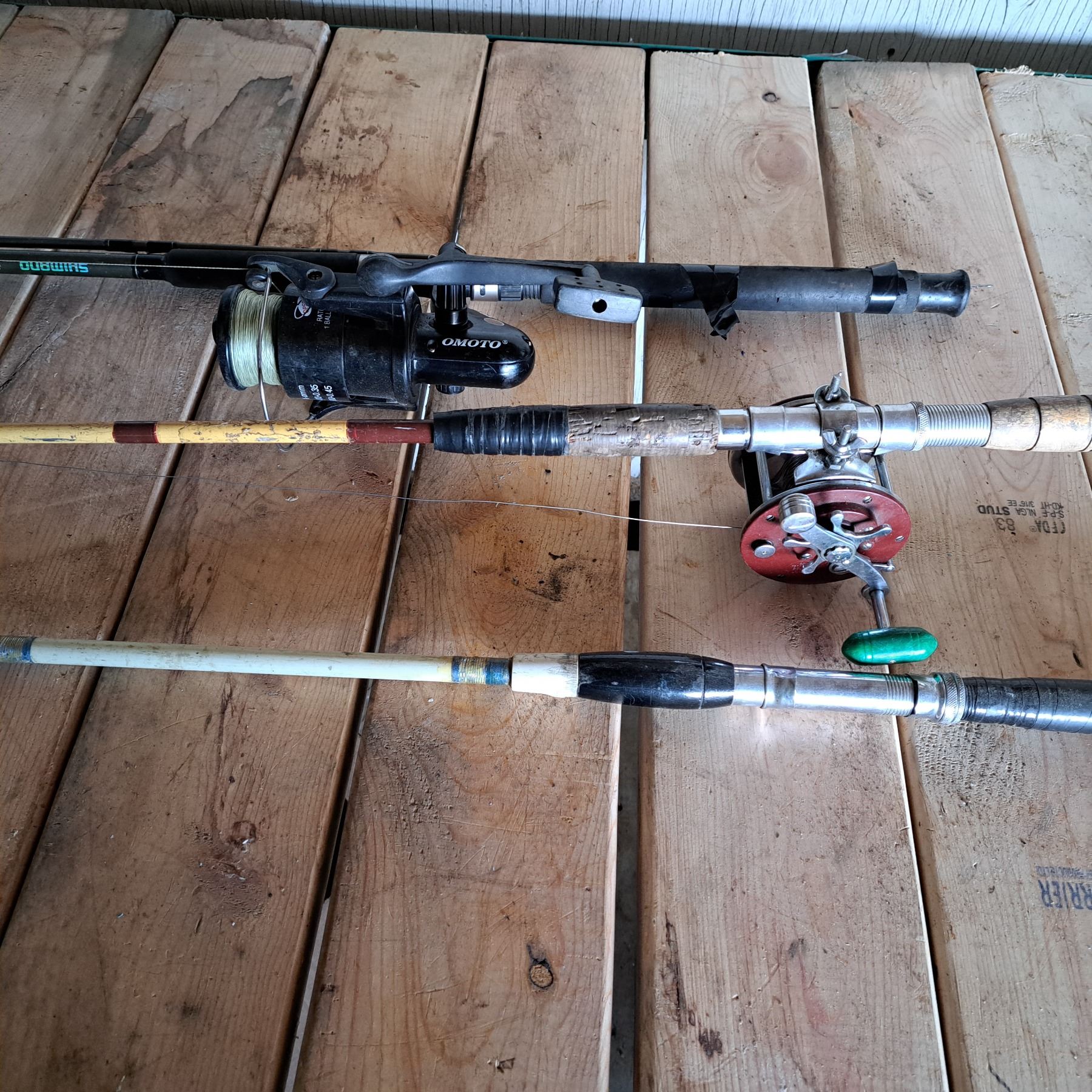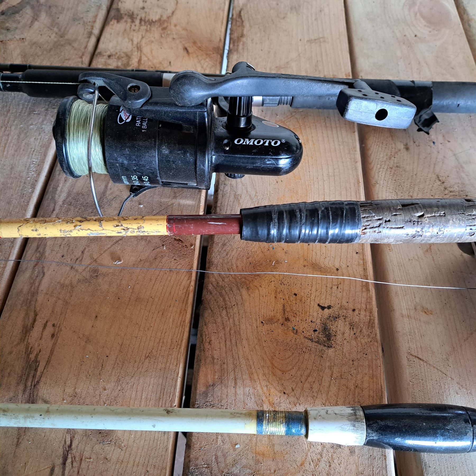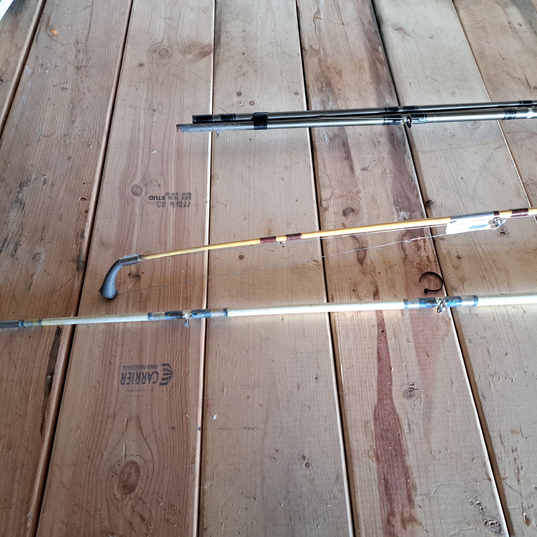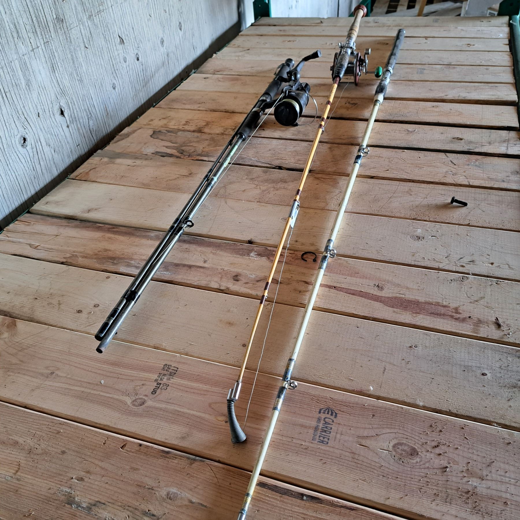 3 old fishing rods 1 has no reel