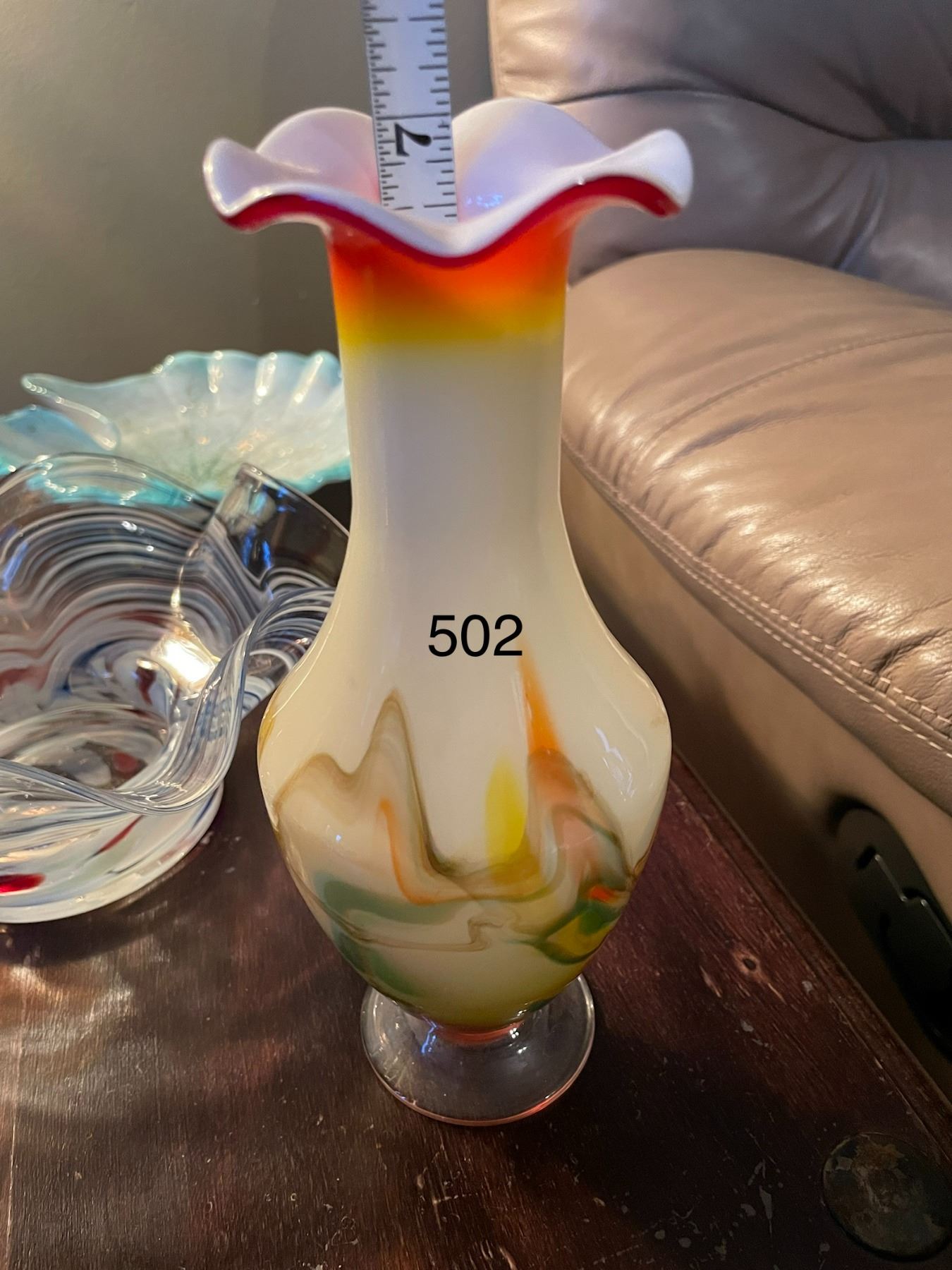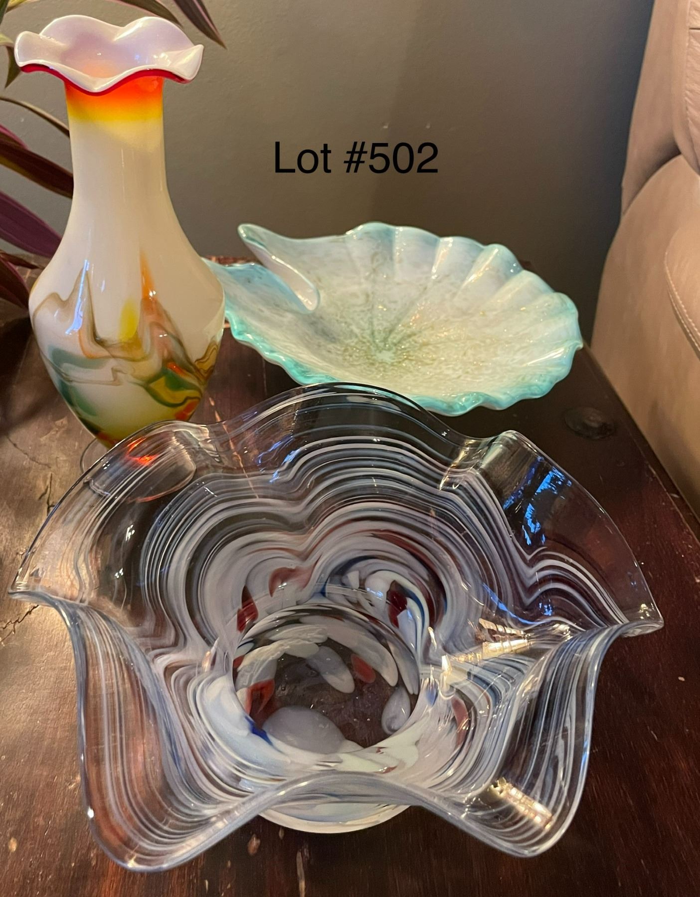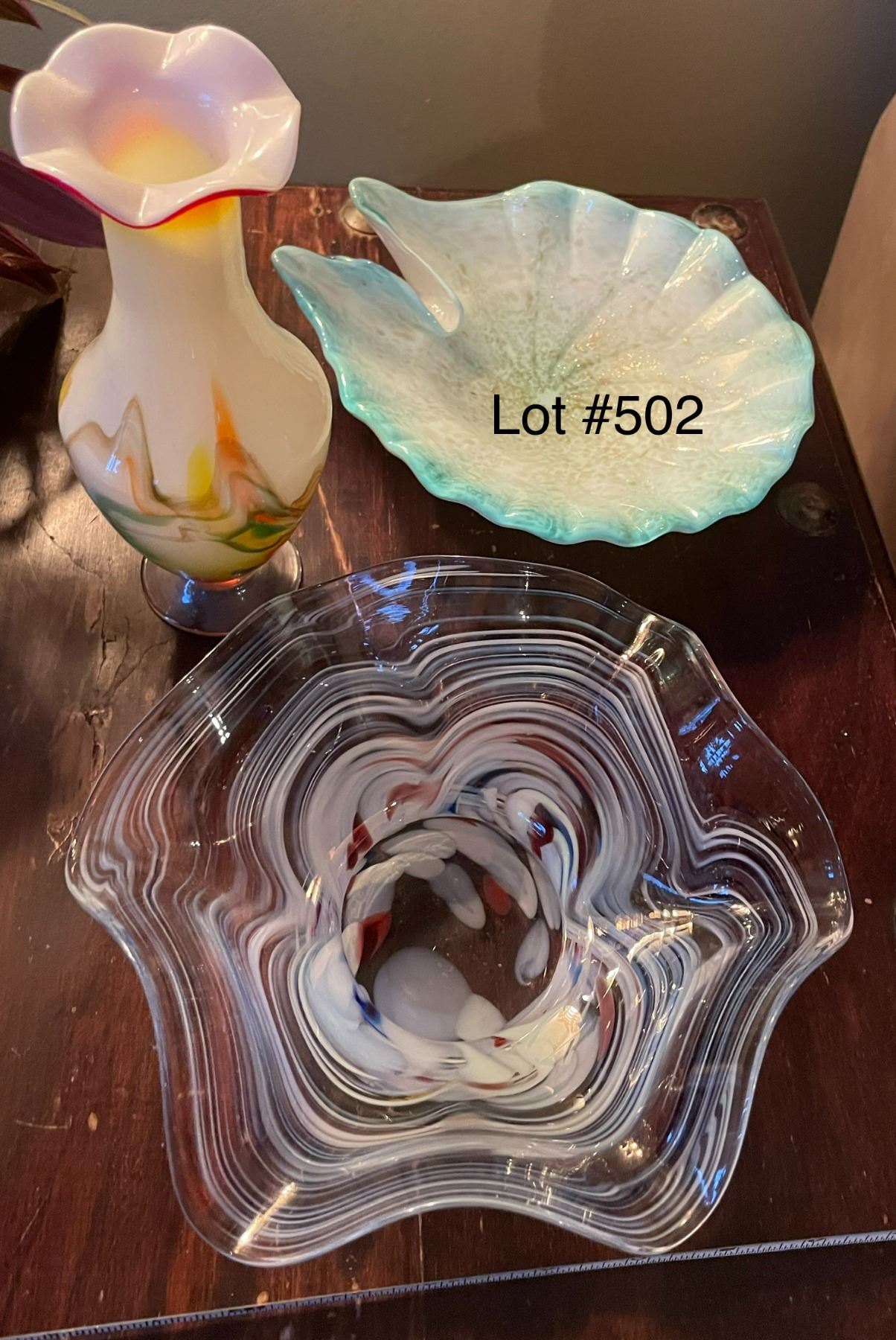 3 pieces of art glass, including one vase and two trinket type dishes