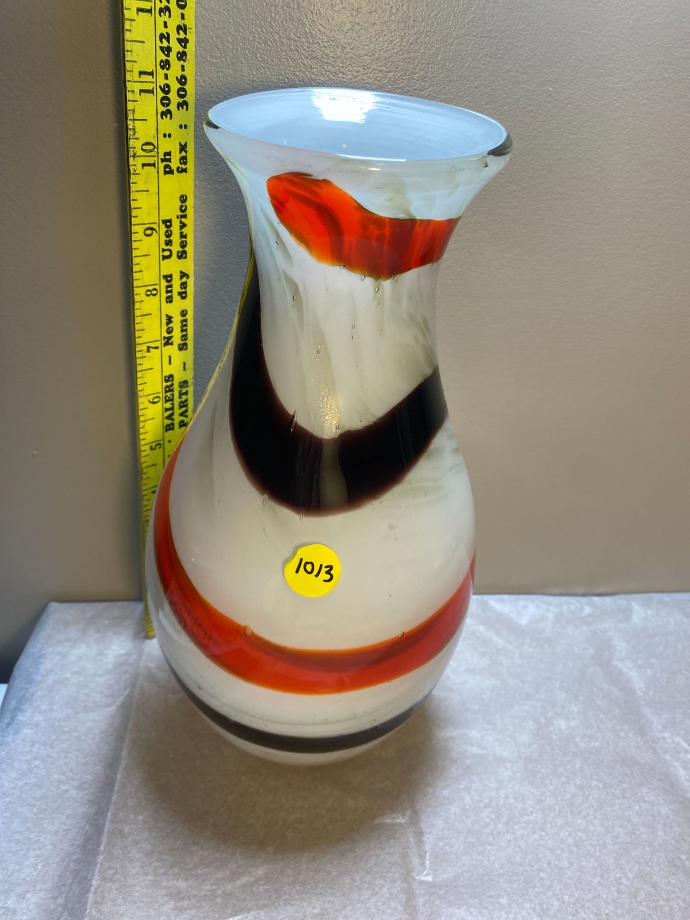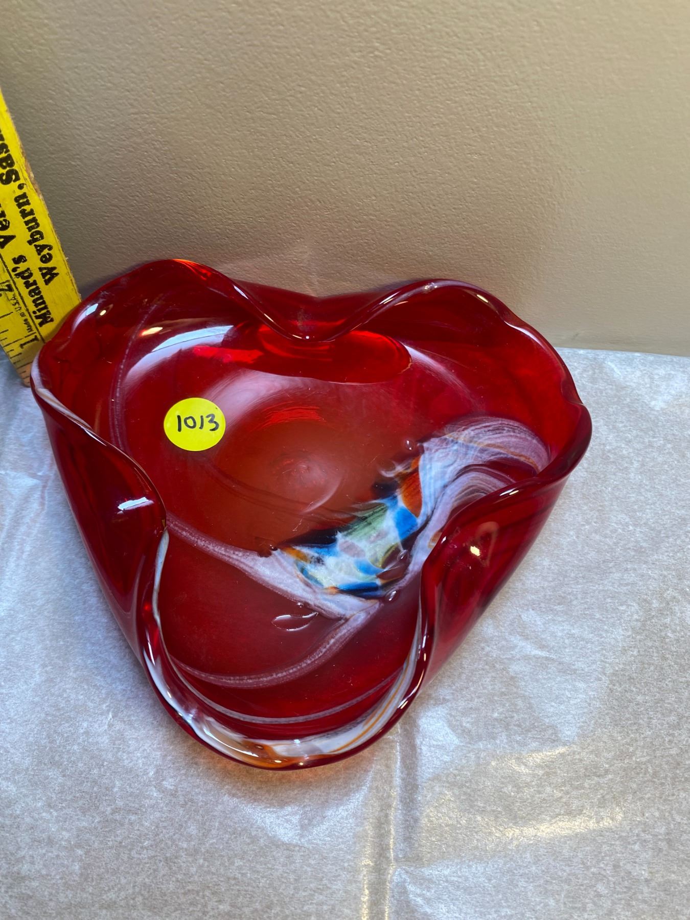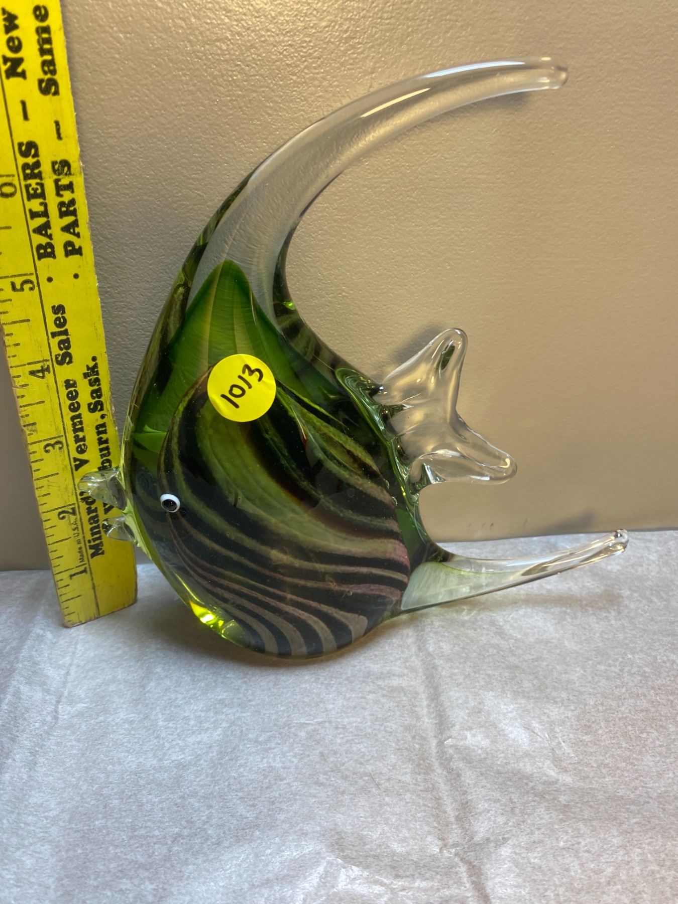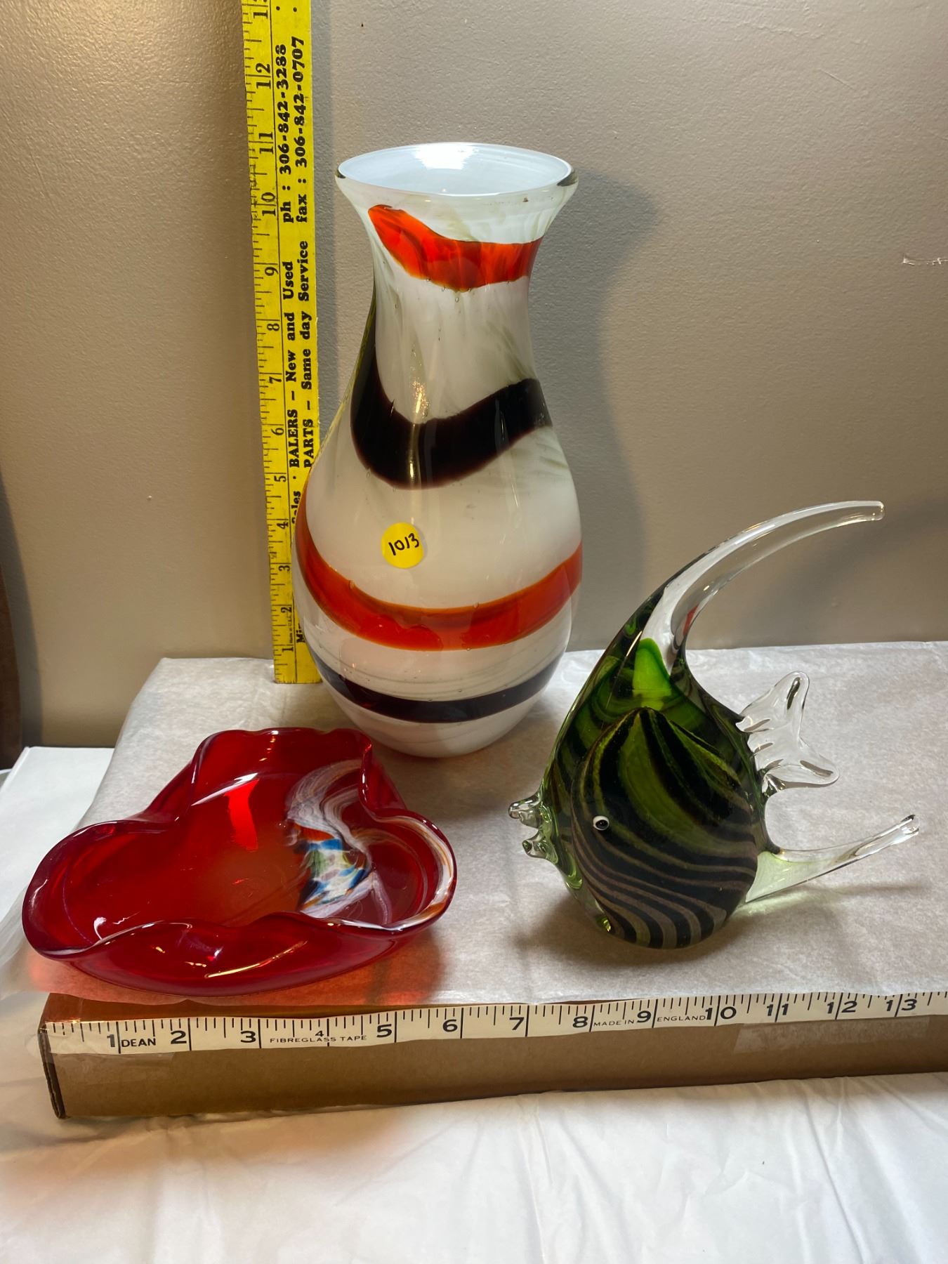 One milifiori trinket dish, one large, swirled glass vase, and one glass fish. No chips, cracks or scratches.