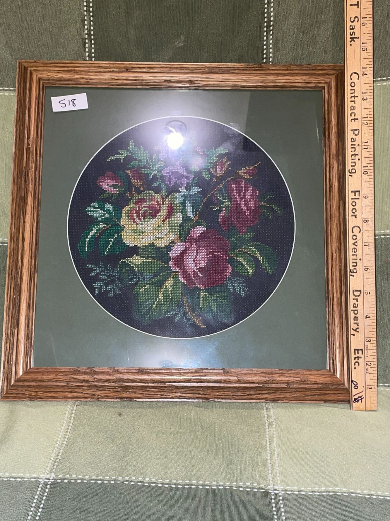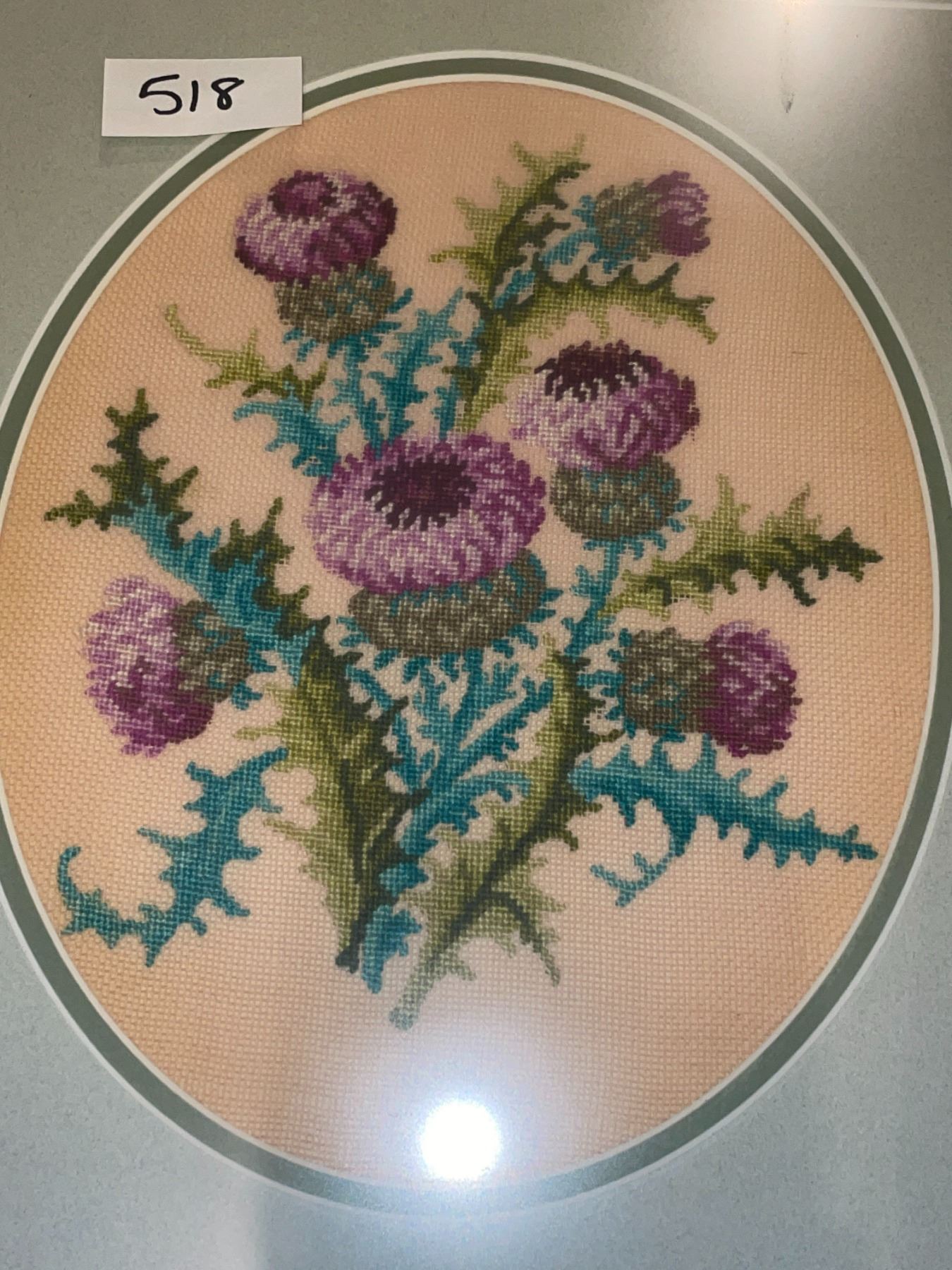 3 pieces of beautiful, framed, needlework. All hand crafted. The thistle piece, is marked on the back with the artists name. All in great condition.
