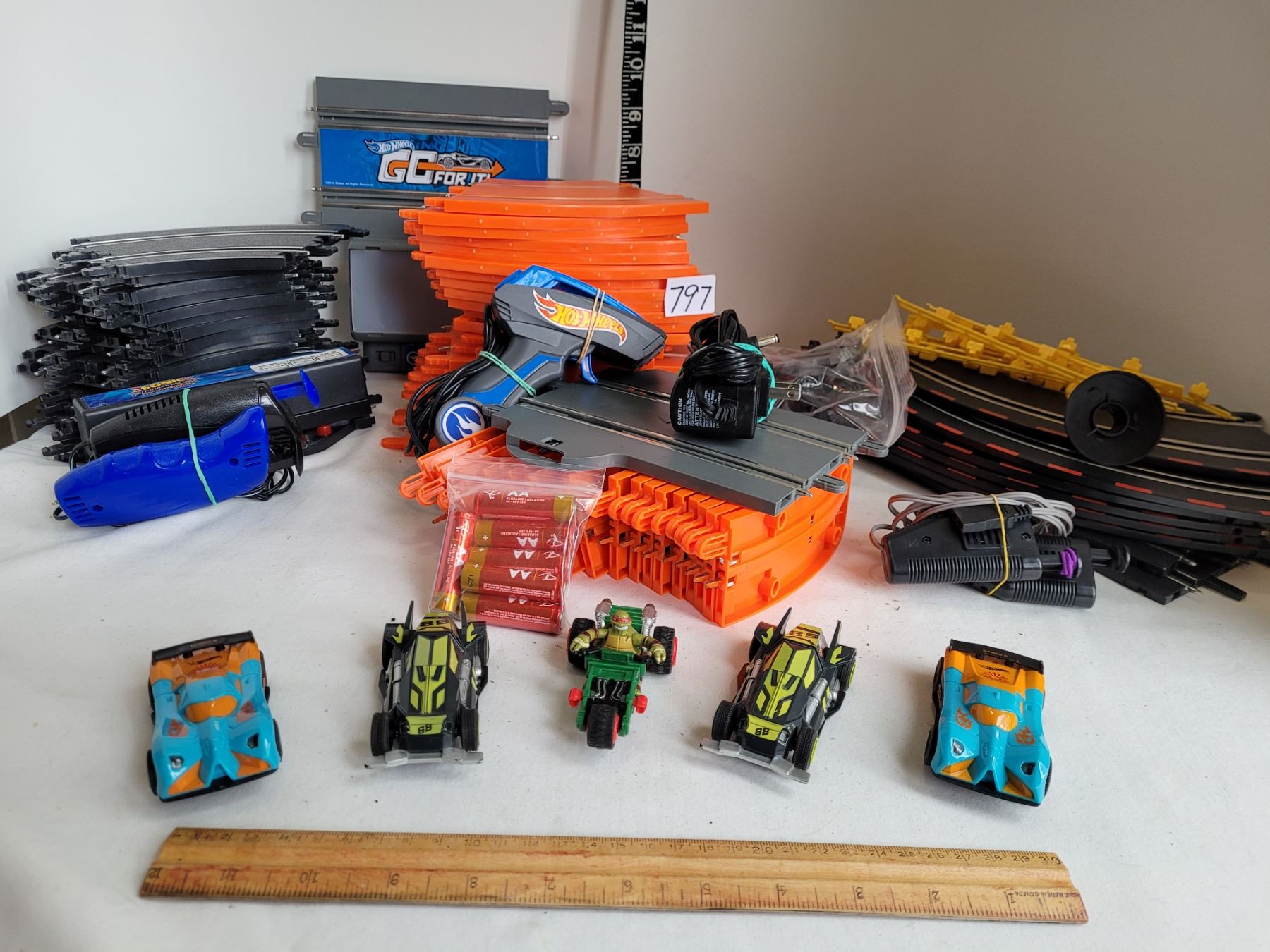 3 race tracks, controls, 5 cars and batteries.