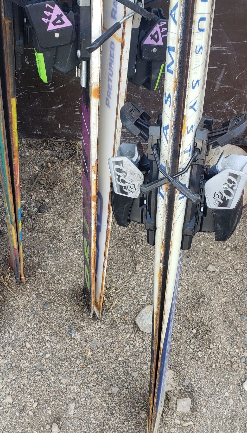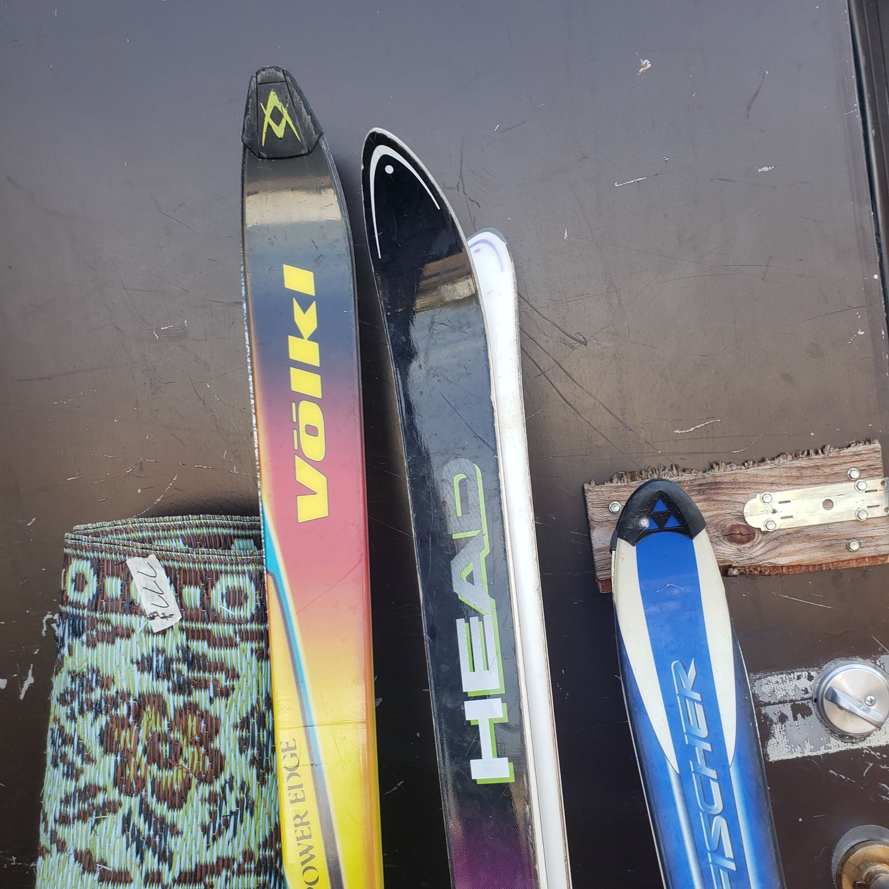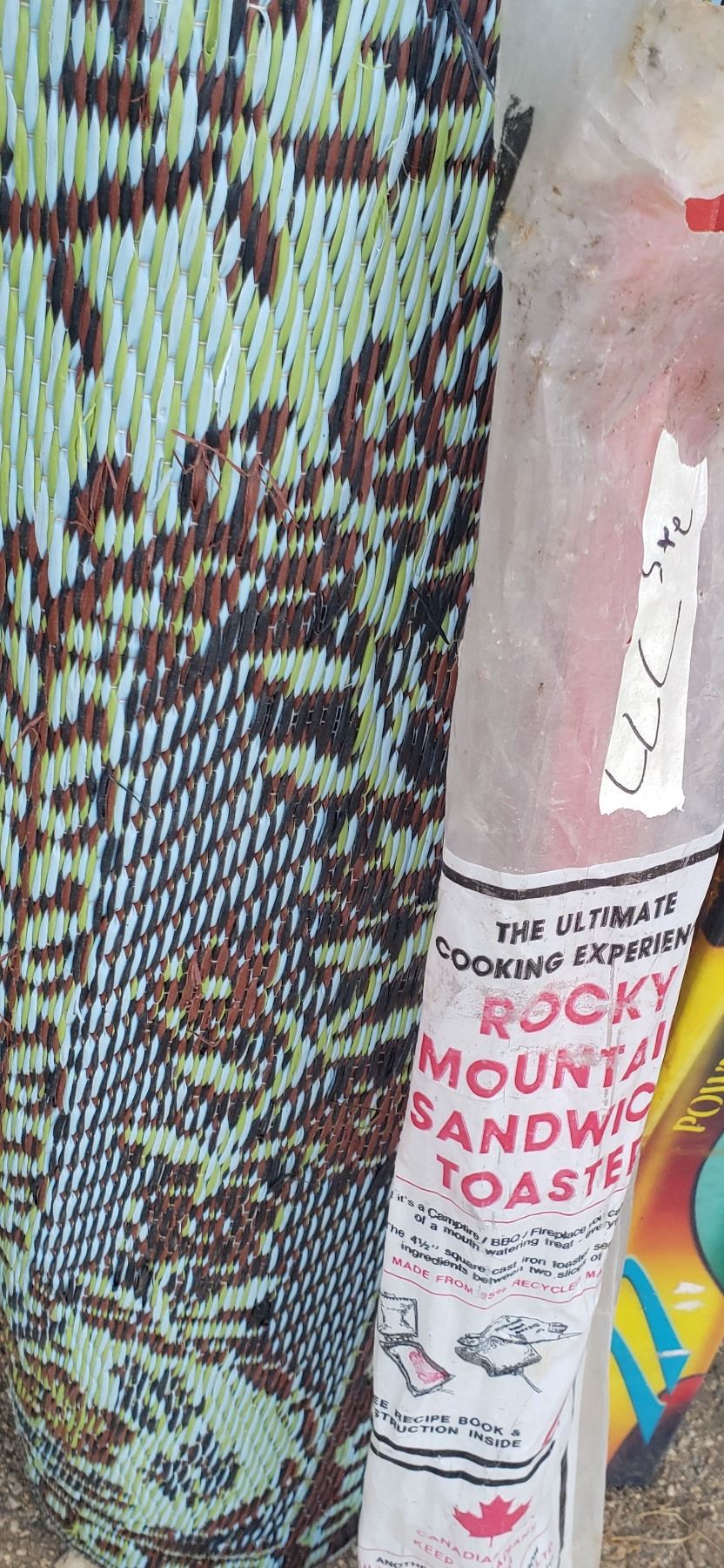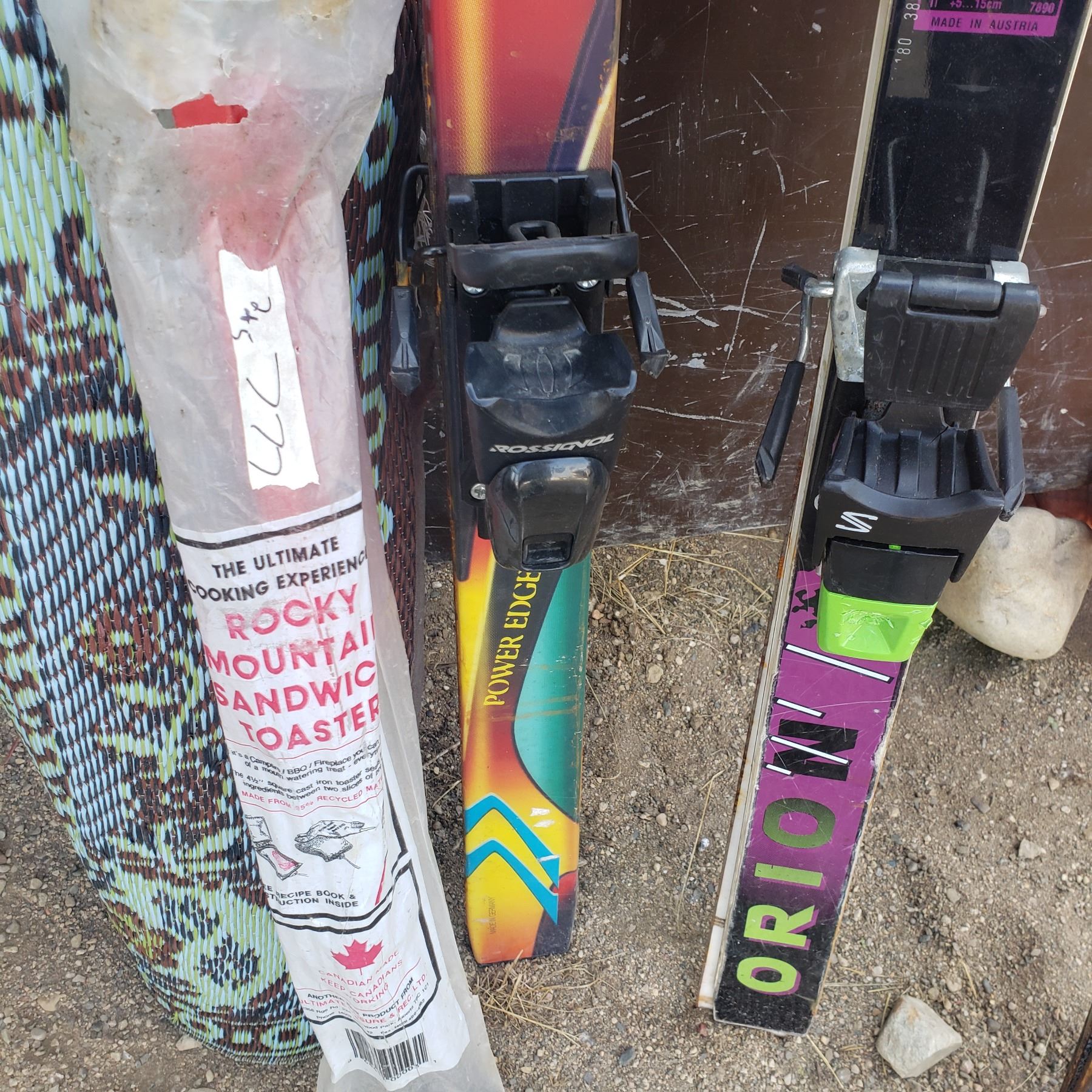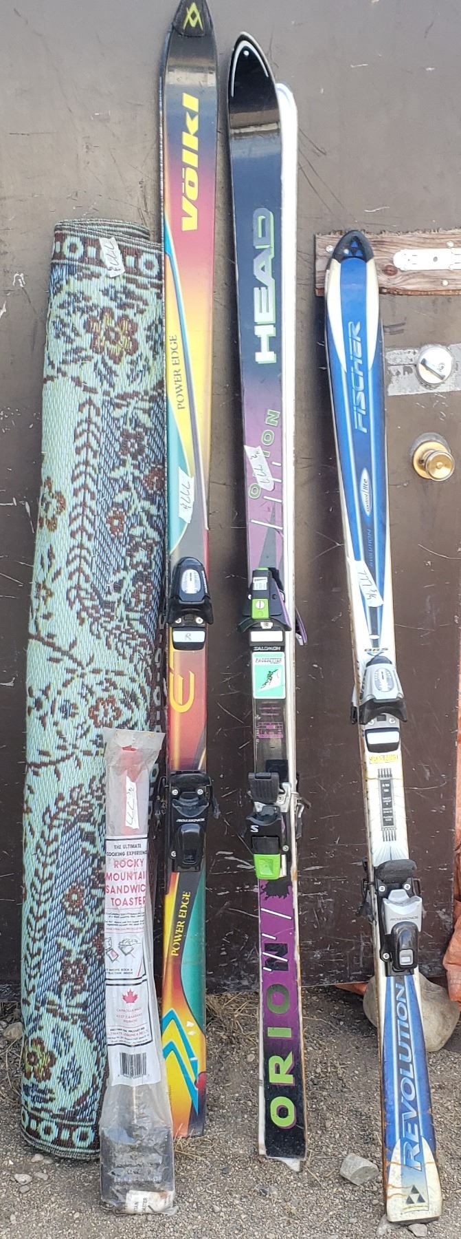 3 sets of skis / outdoor carpet / rocky mountain sandwich toaster