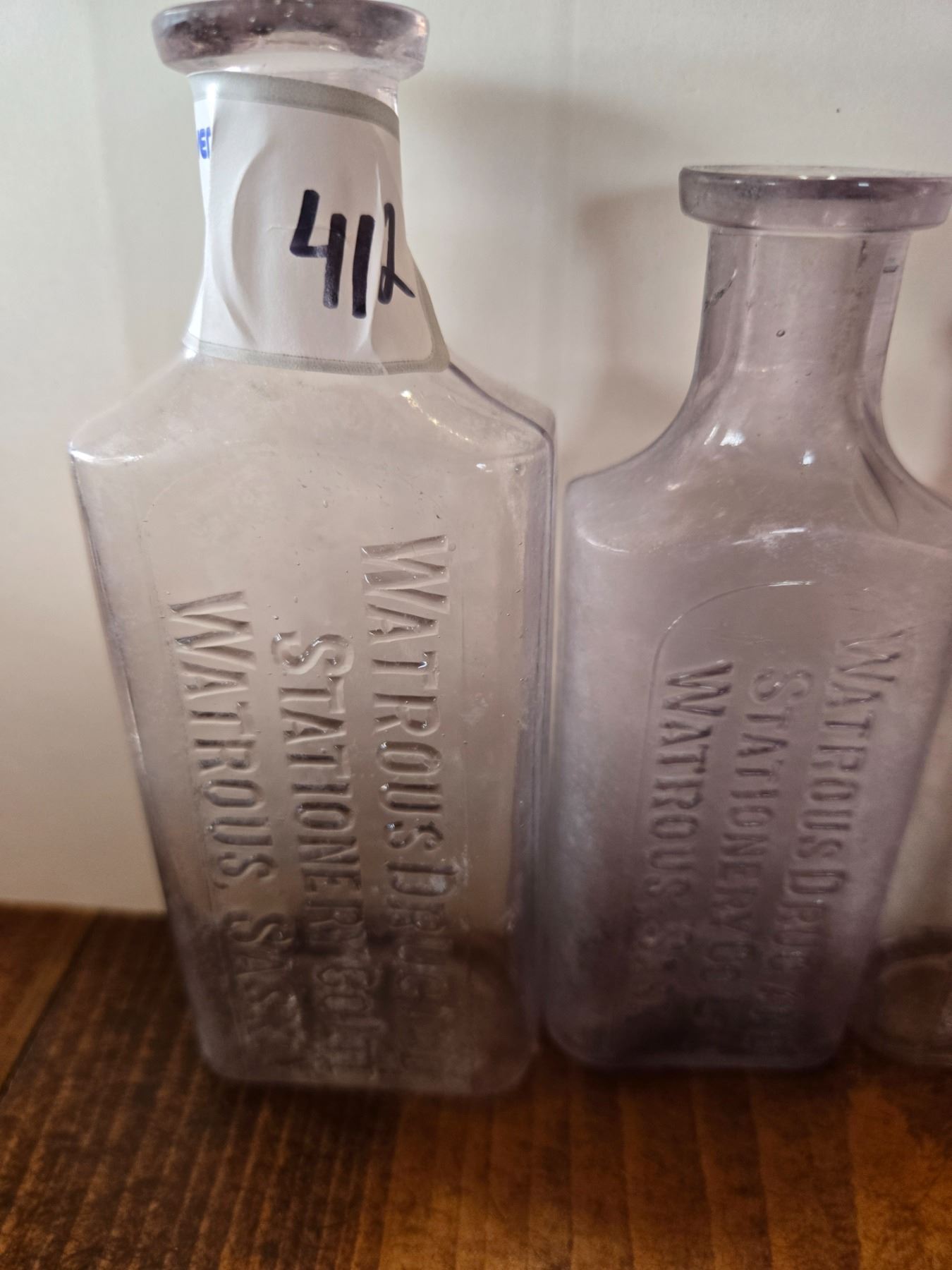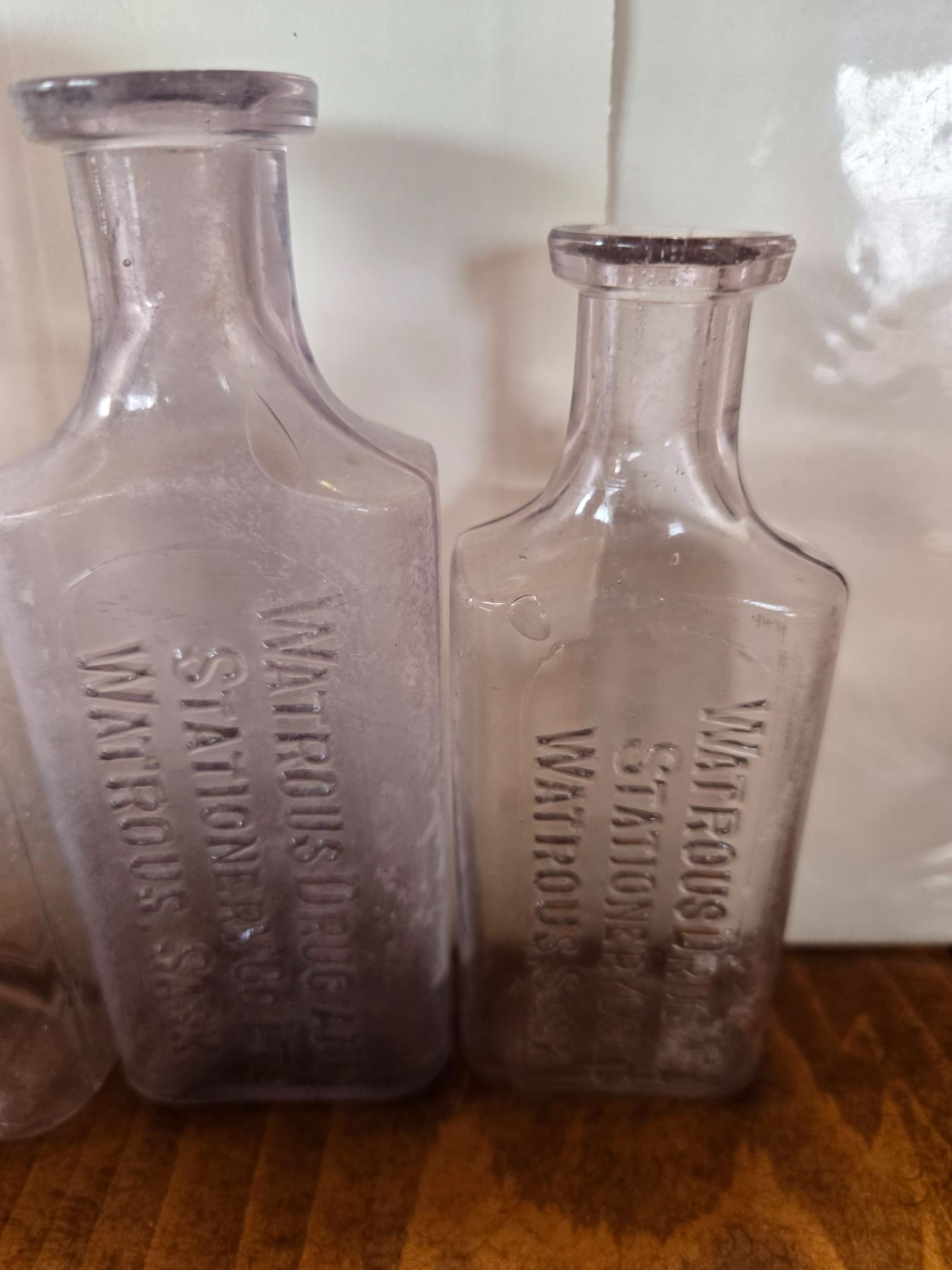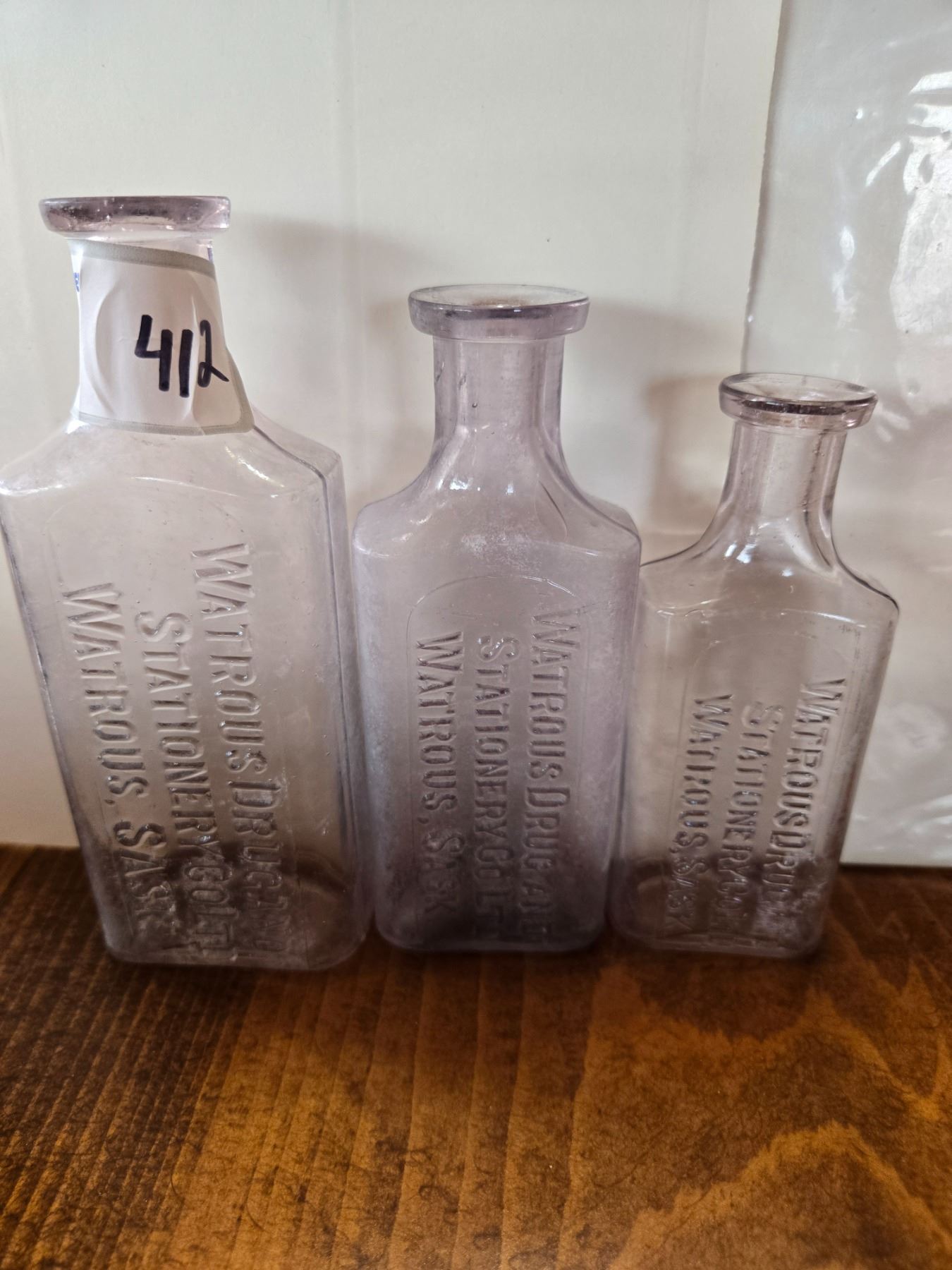 3 sizes of vintage medicine bottles- watrous drugs and stationary ltd.