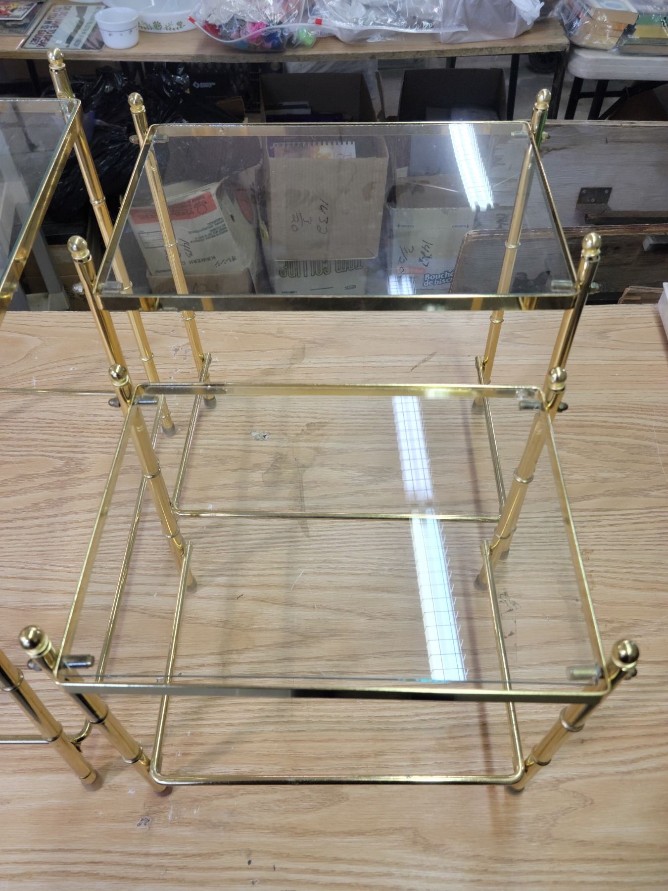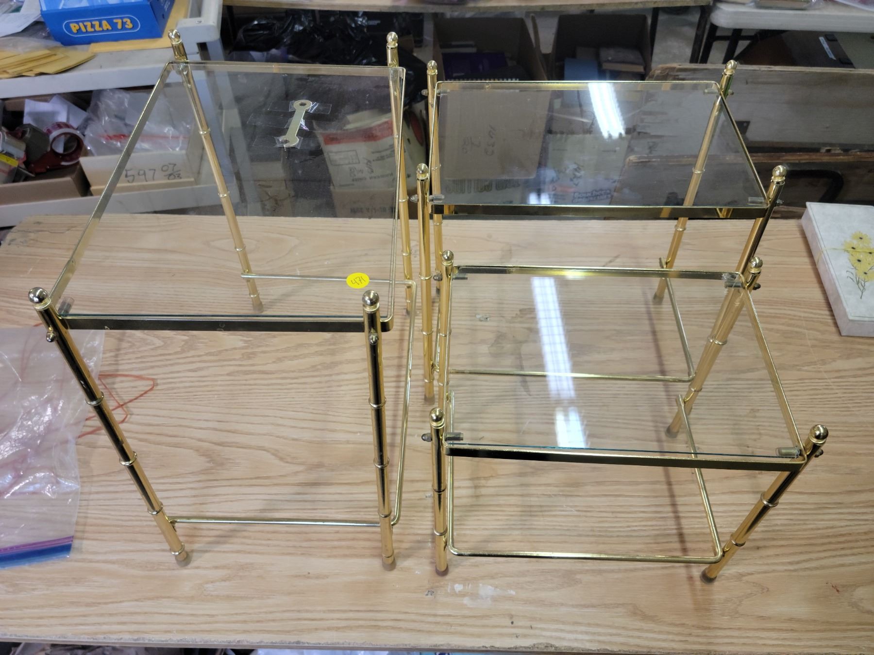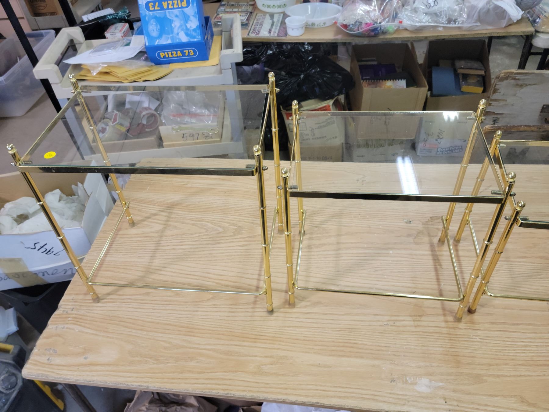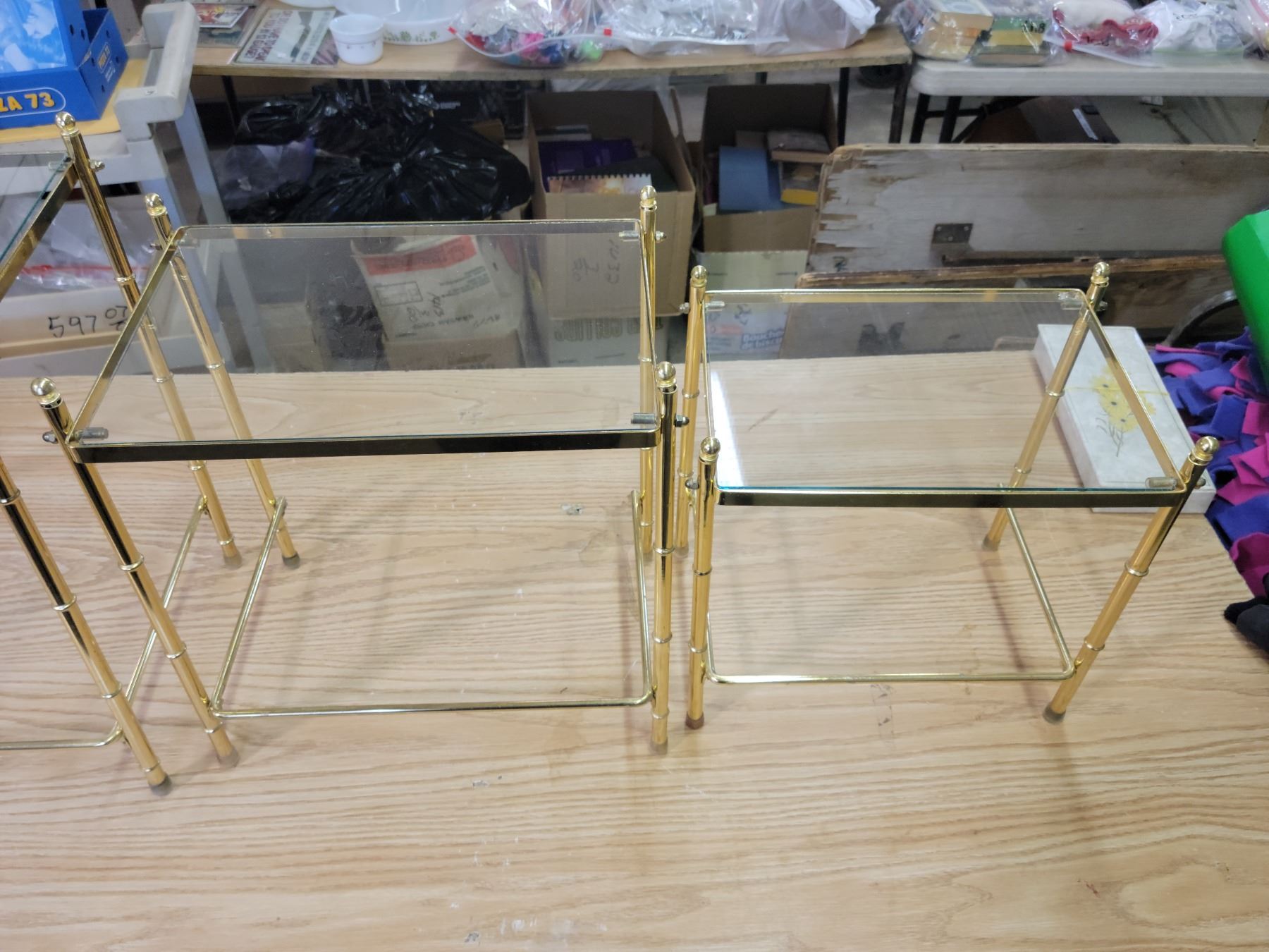 3 small glass & brass stacking tables with wrench. Smallest table has some corner damage.