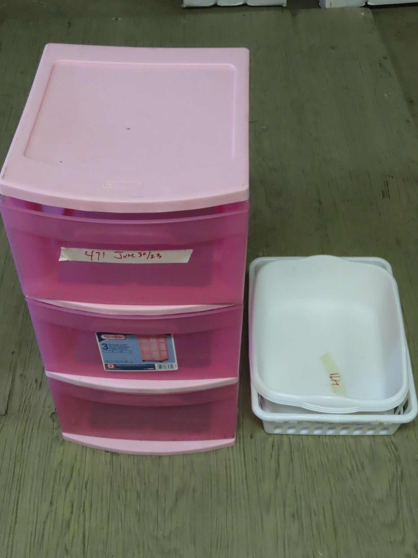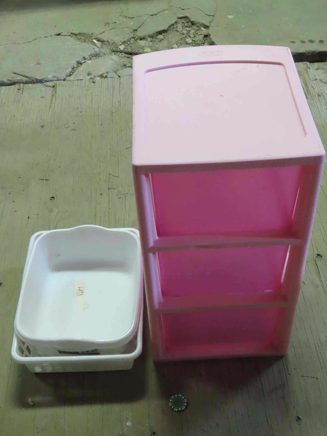 3 tier pink storage unit, 2 dish pans & 1 tray