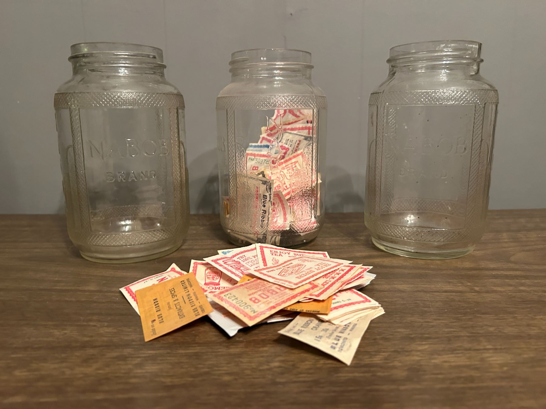 3 vintage NABOB coffee jars with variety of NaBOB coupons