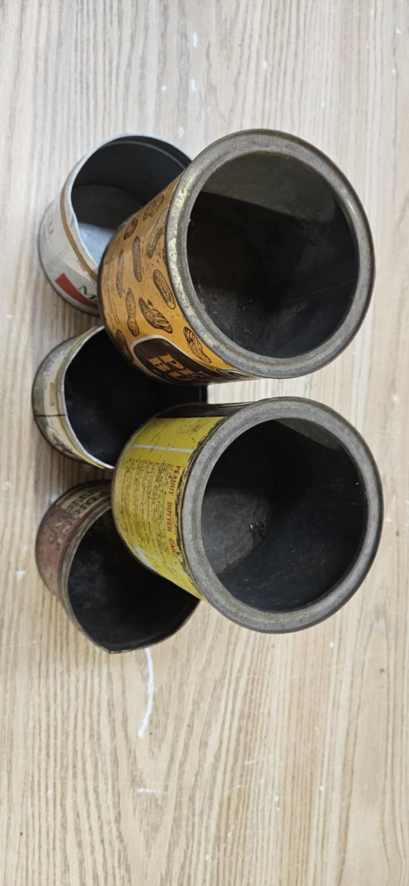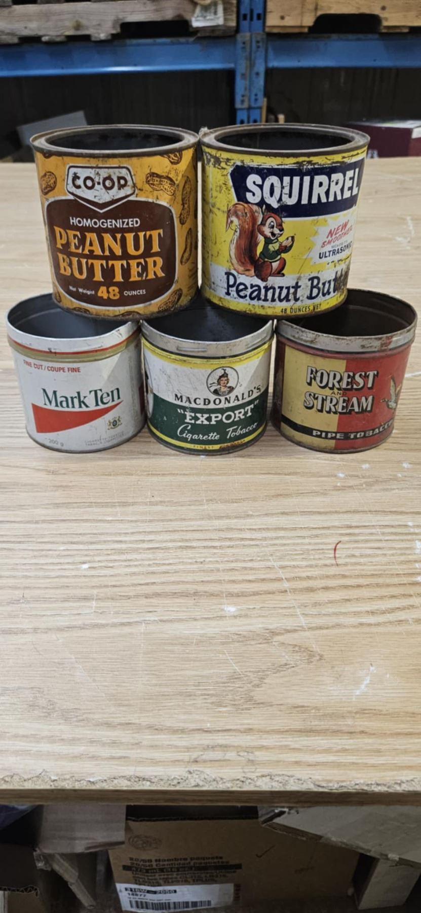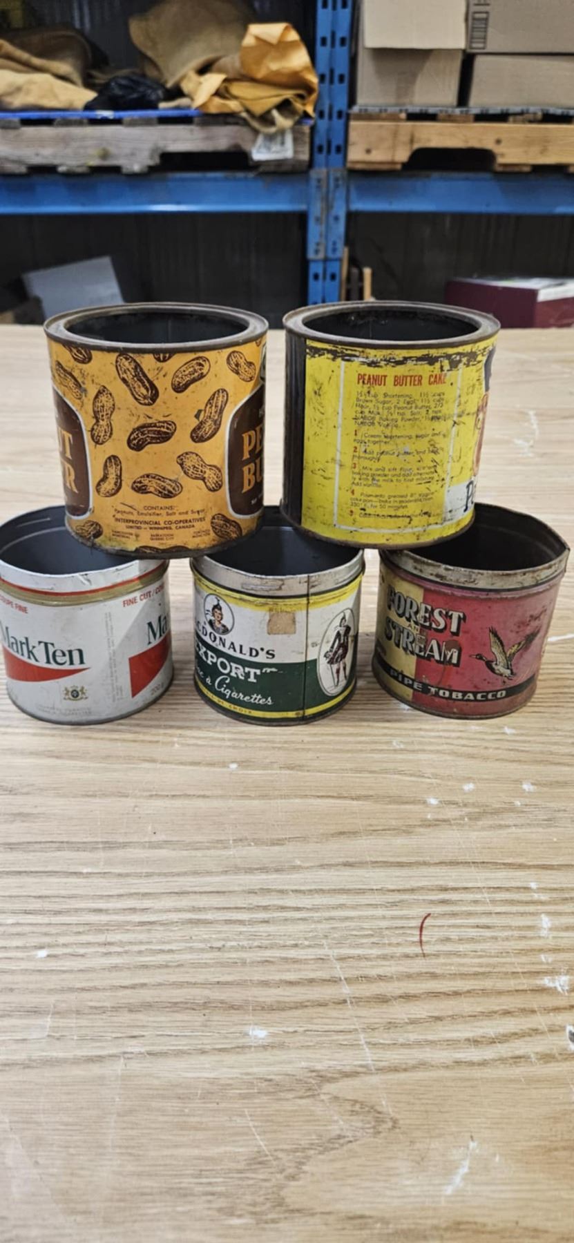 3 vintage tabbacco tins and 2 vintage peanut butter tins