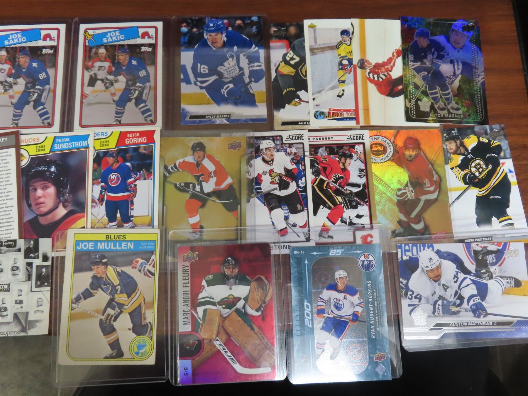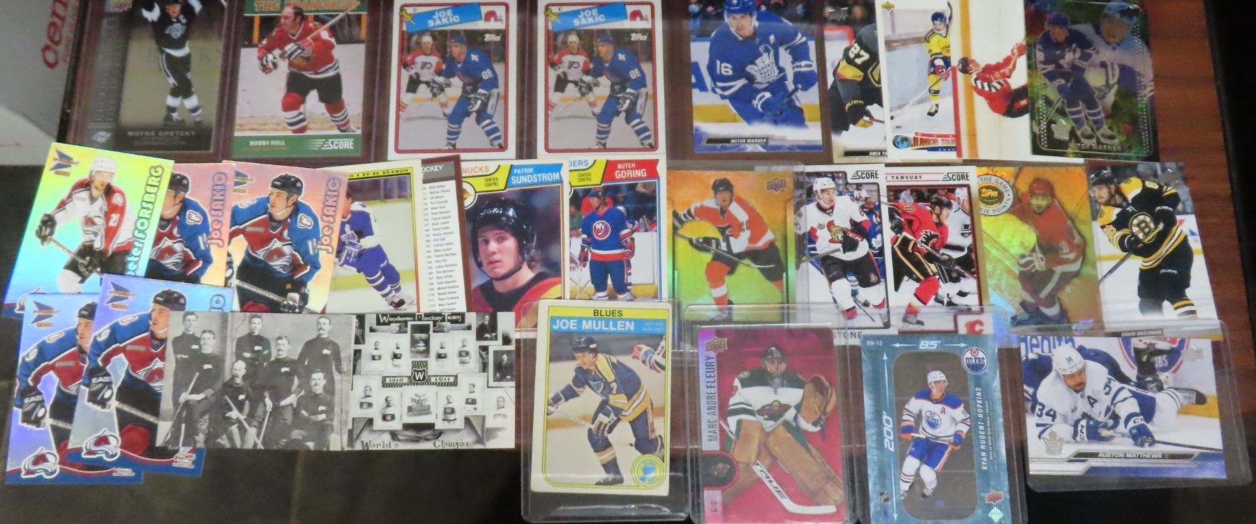 30 Hockey Card Lot, includes Gretzky, Bobby Hull, Joe Sakic, Marner, Matthews, Nugent-Hopkins, Marc Andre Fleury