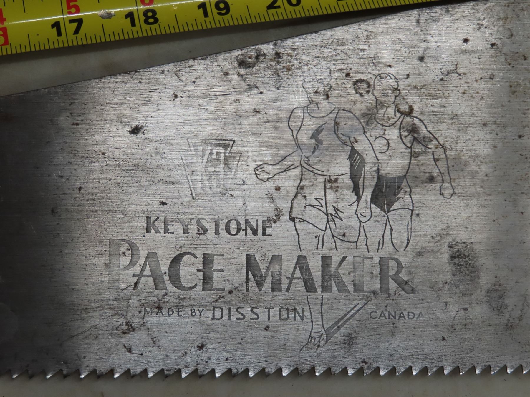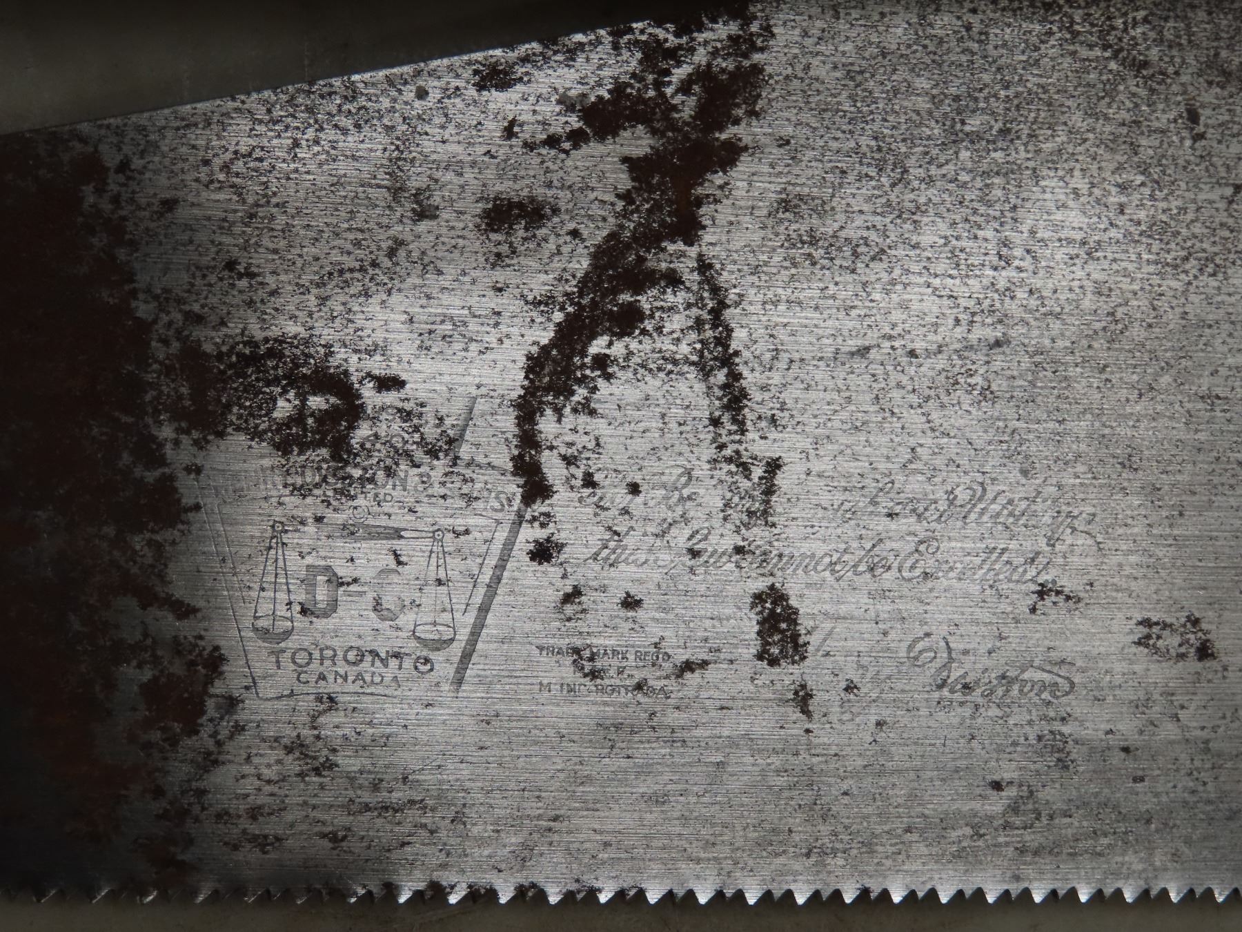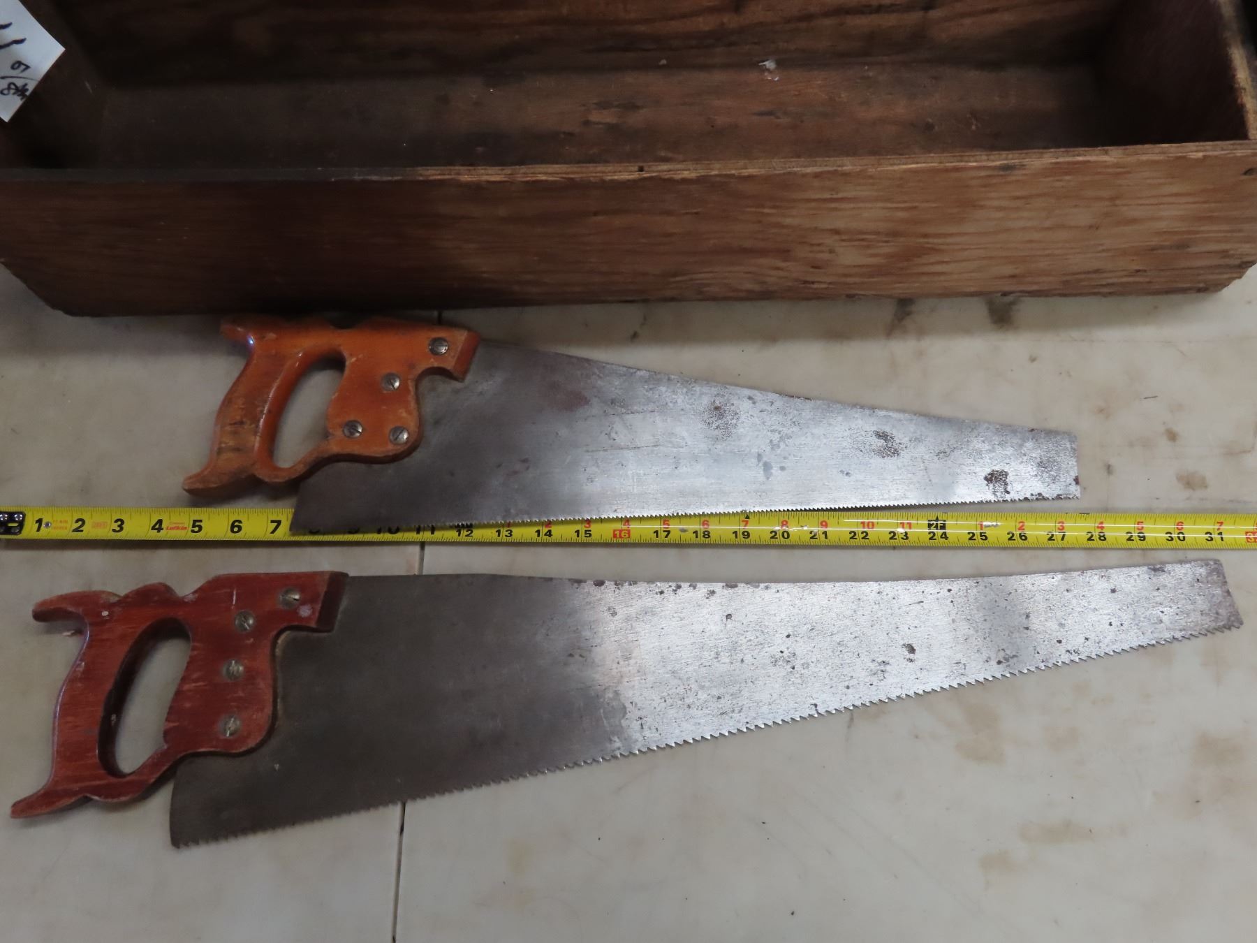 32"x 8"x 11.5" wooden tool box with 2 hand saws - with stamp markings