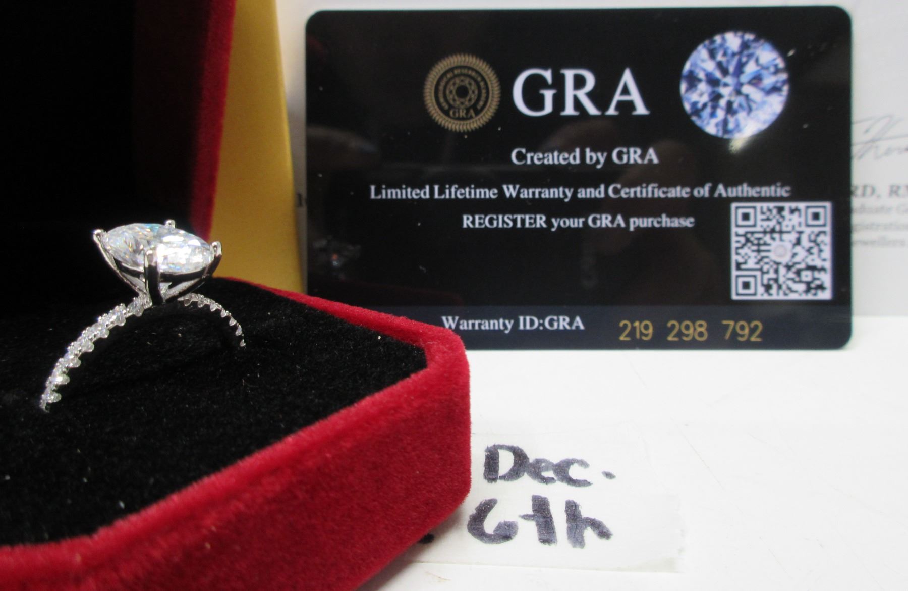 #362-3.00 CT GRA CERTIFIED OVAL CUT MOISSANITE STONE VVS D COLOR WITH 18 ROUND BRILLIANT CUT CUBIC ZIRCONIA SET IN SHANKS SET IN 925 SILVER RING SIZE 6 RETAIL VALUE $2,000.00