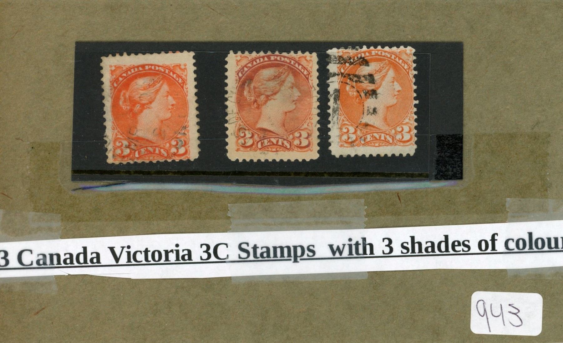 3X Canada Victoria 3¢ stamps with 3 shades of color